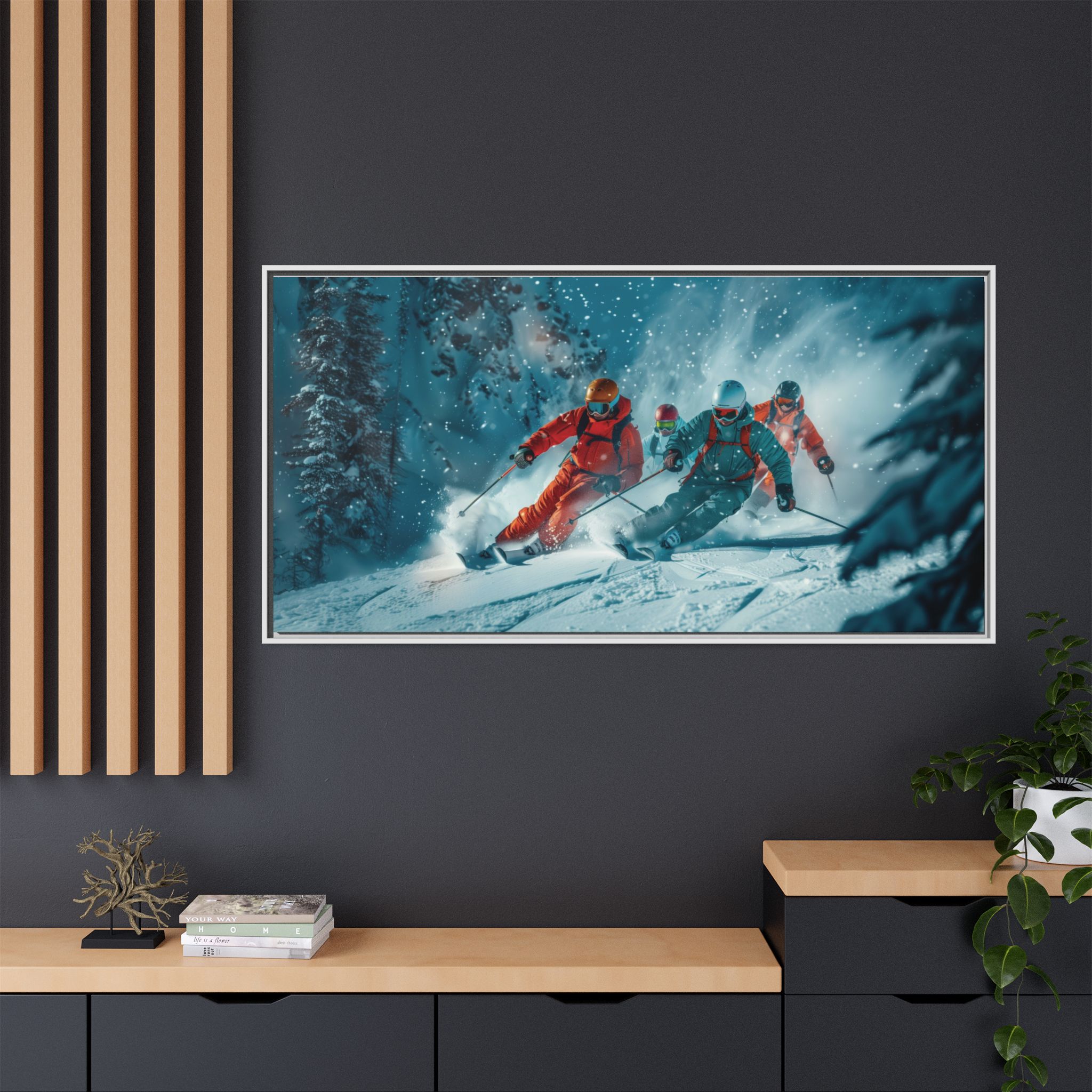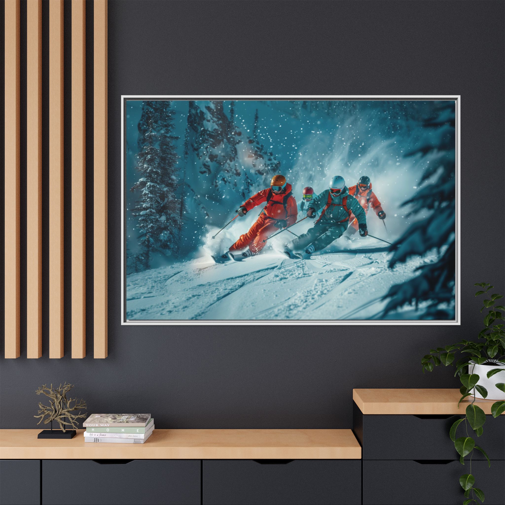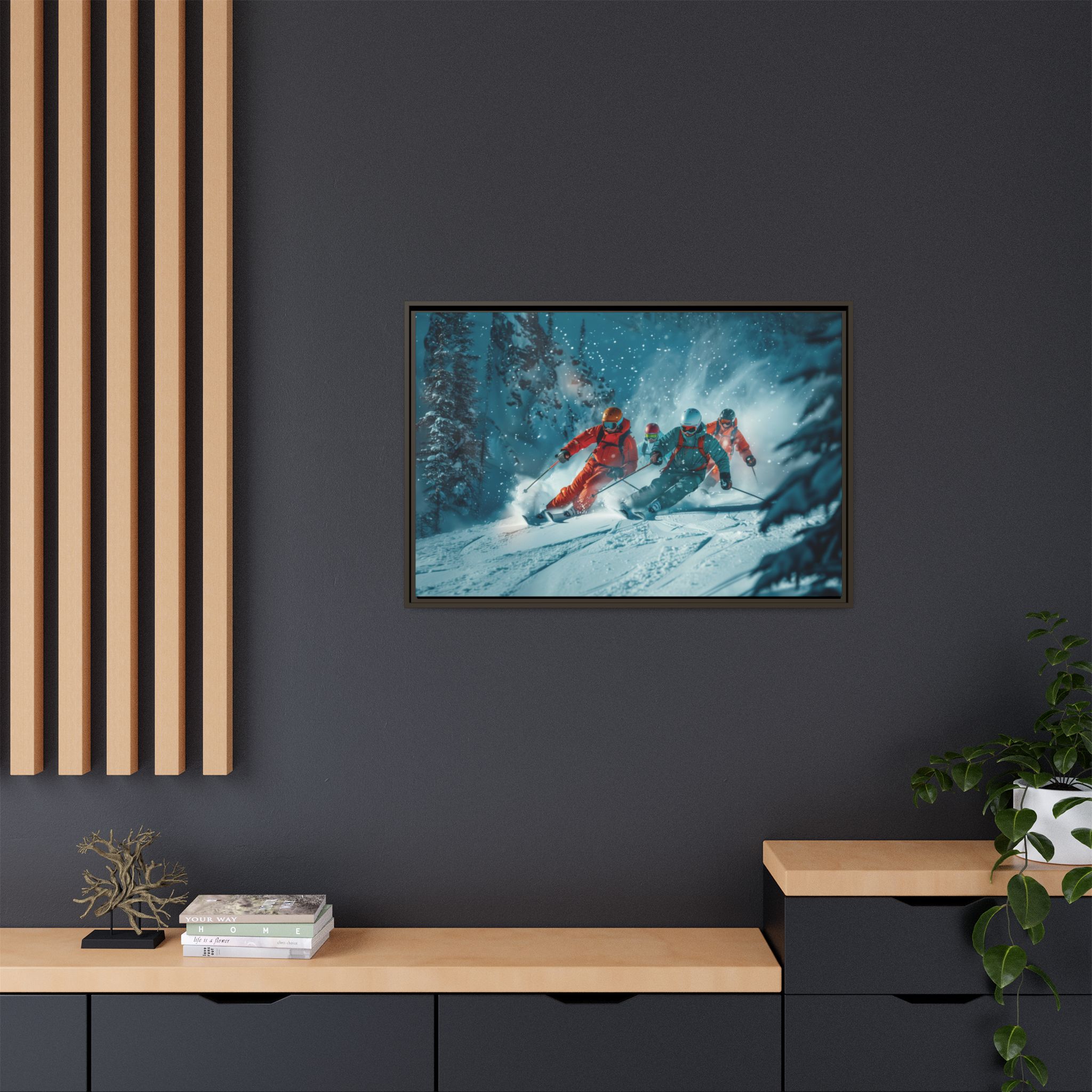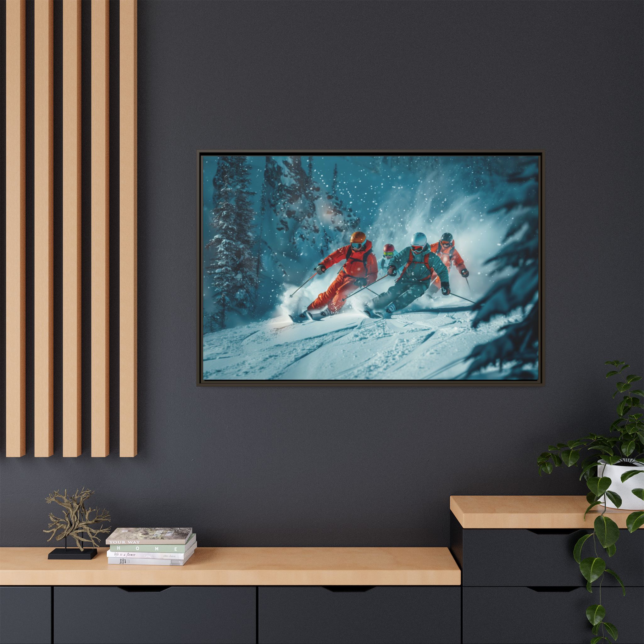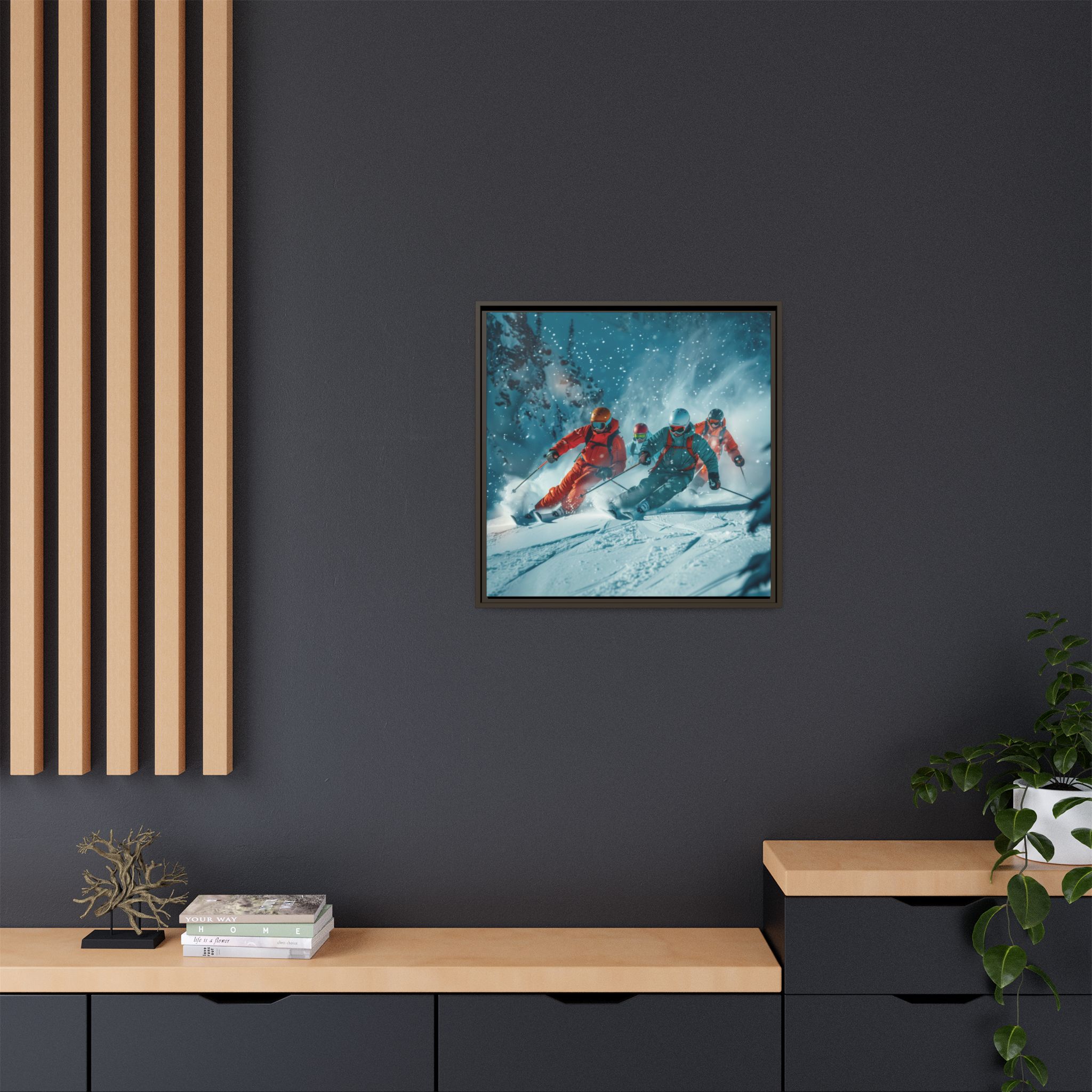 A dynamic action scene of skiers free skiing down the slopes in deep snow, a beutiful action landscape with intensity and excitement. The high-speed motion creates swirling snow clouds around them as they land on a snowy mountain slope. Experience the excitement of skiing with this dynamic action style canvas print. Perfect for adrenaline junkies and winter sports enthusiasts, this canvas brings intensity and motion to any room. Ideal for winter decor, sports enthusiasts, and anyone looking to add a thrilling touch to their space.
