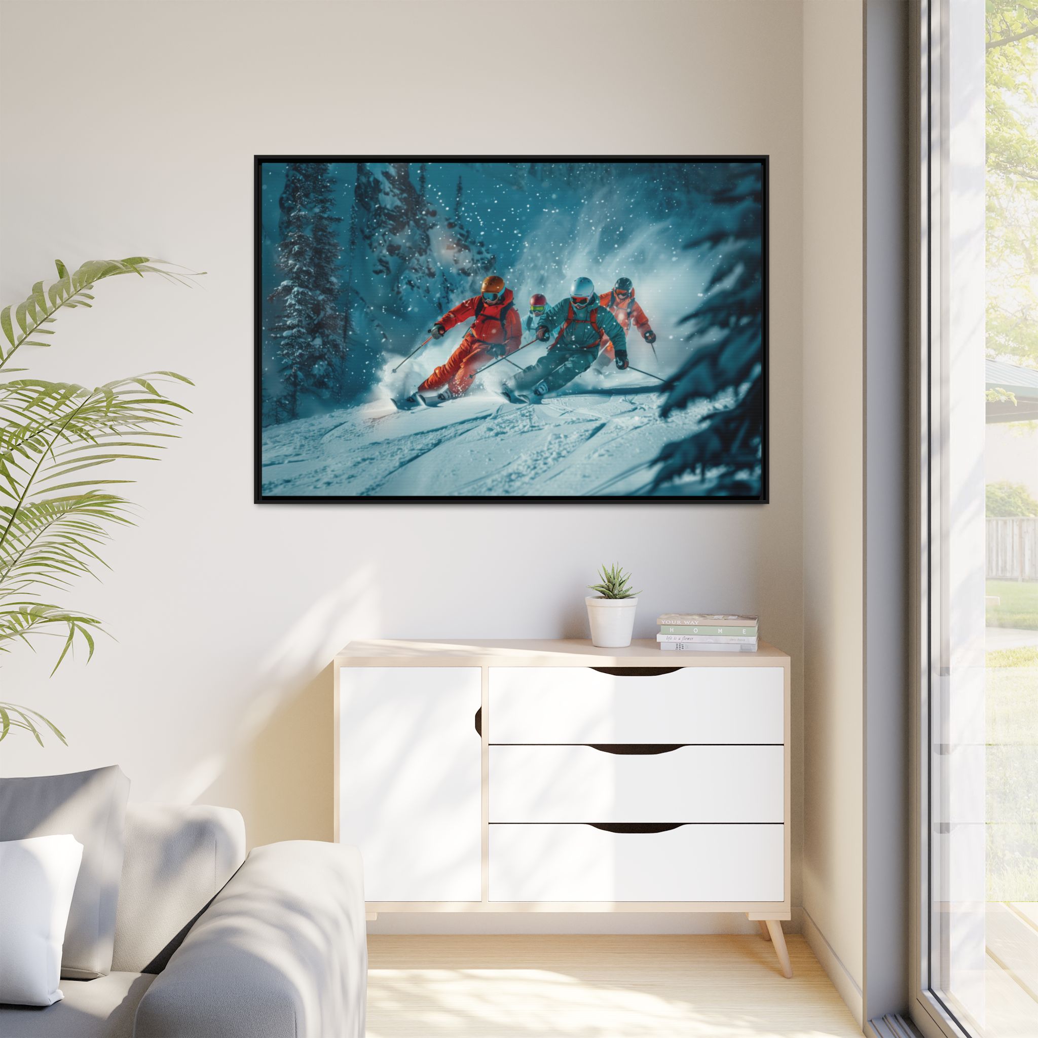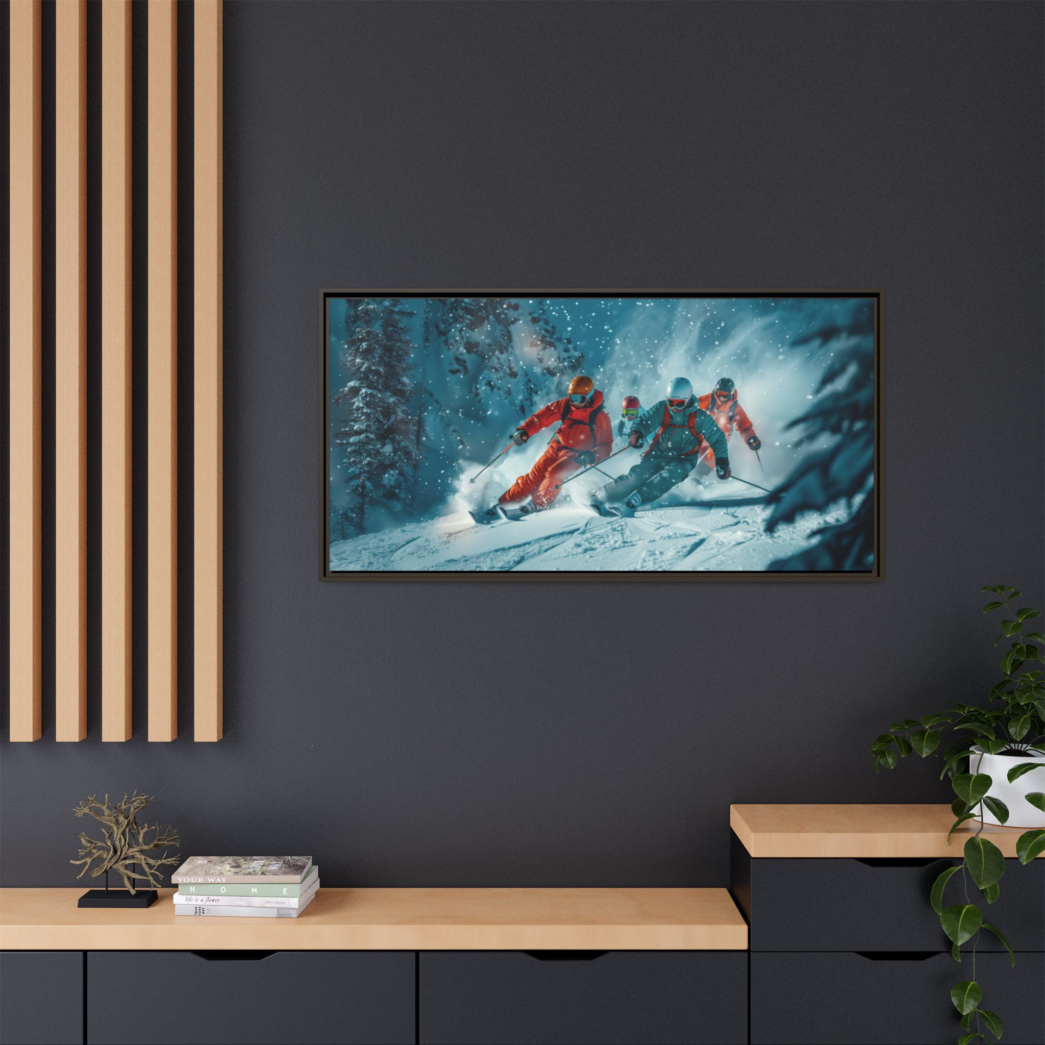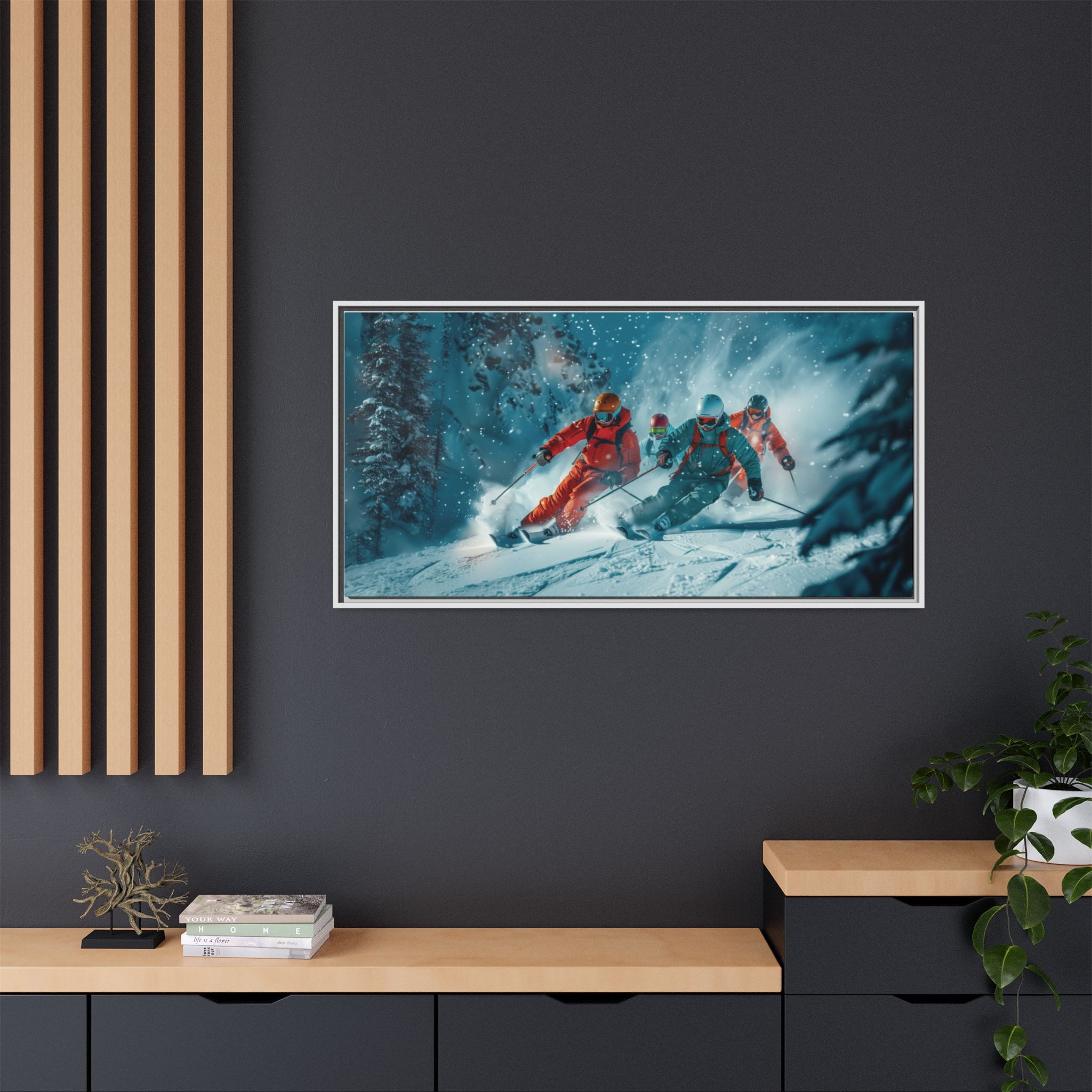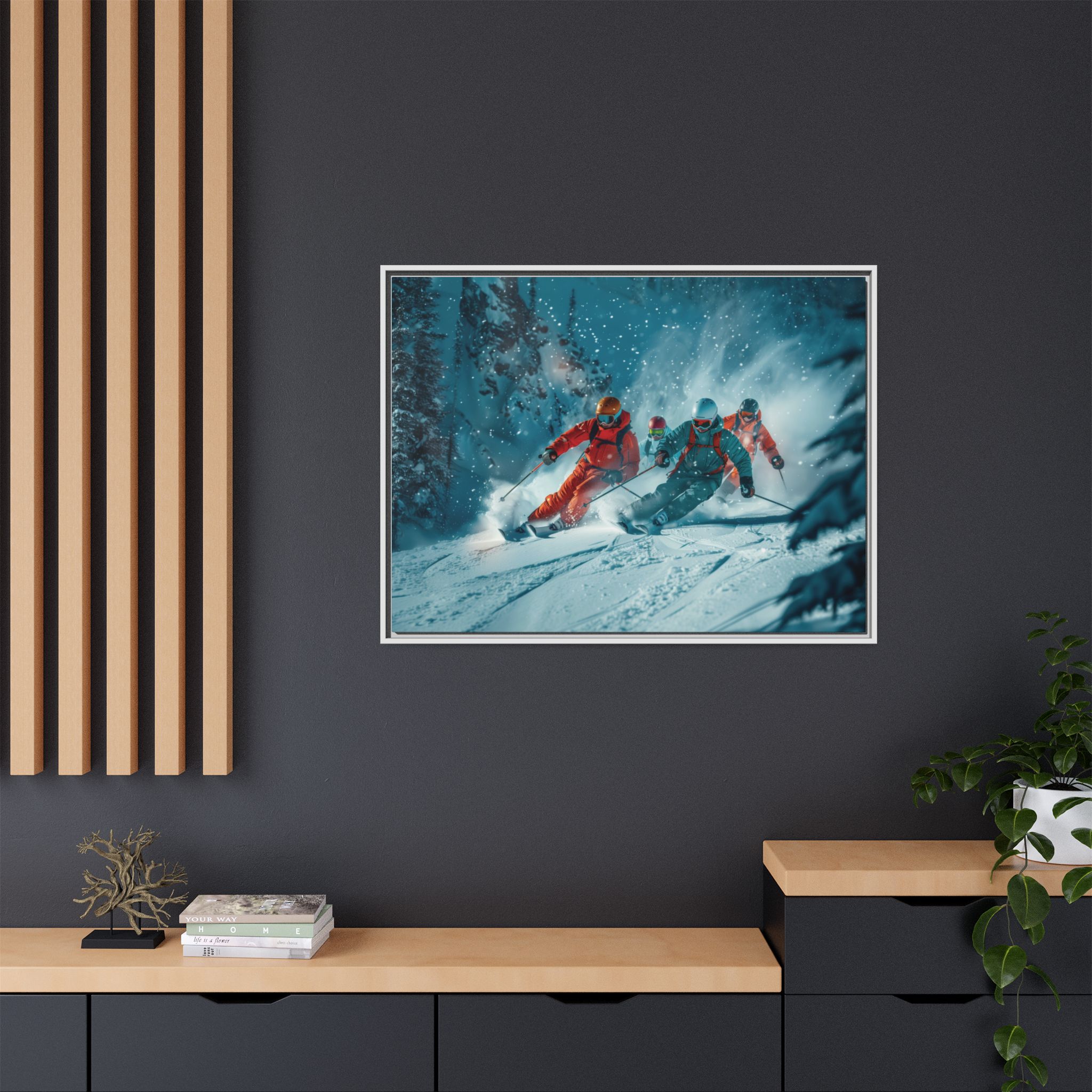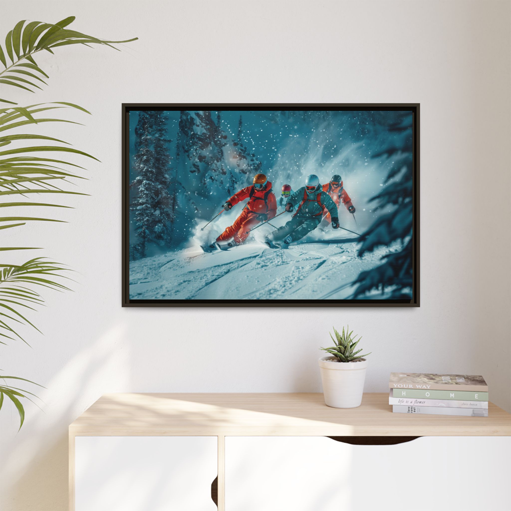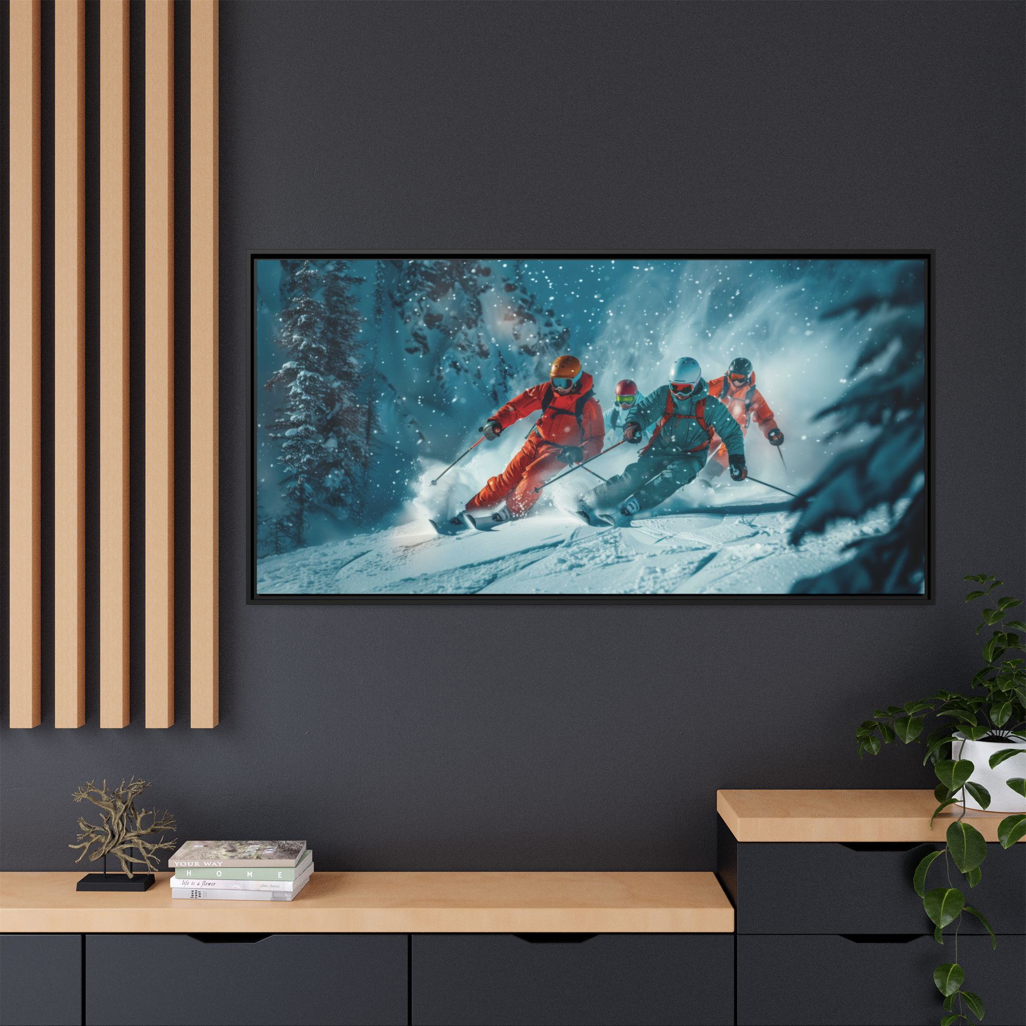 A dynamic action scene of skiers free skiing down the slopes in deep snow, a beutiful action landscape with intensity and excitement. The high-speed motion creates swirling snow clouds around them as they land on a snowy mountain slope. Experience the excitement of skiing with this dynamic action style canvas print. Perfect for adrenaline junkies and winter sports enthusiasts, this canvas brings intensity and motion to any room. Ideal for winter decor, sports enthusiasts, and anyone looking to add a thrilling touch to their space.
