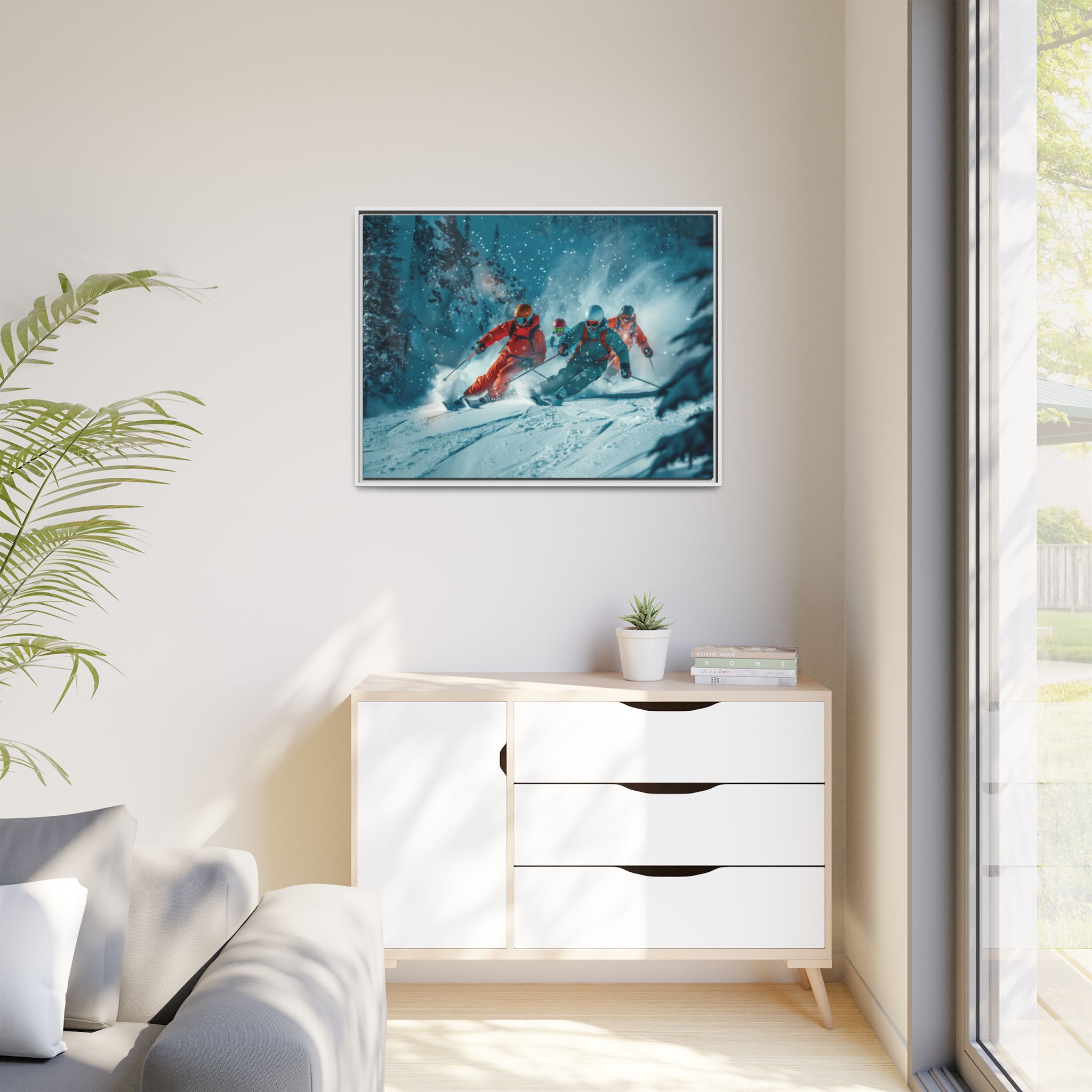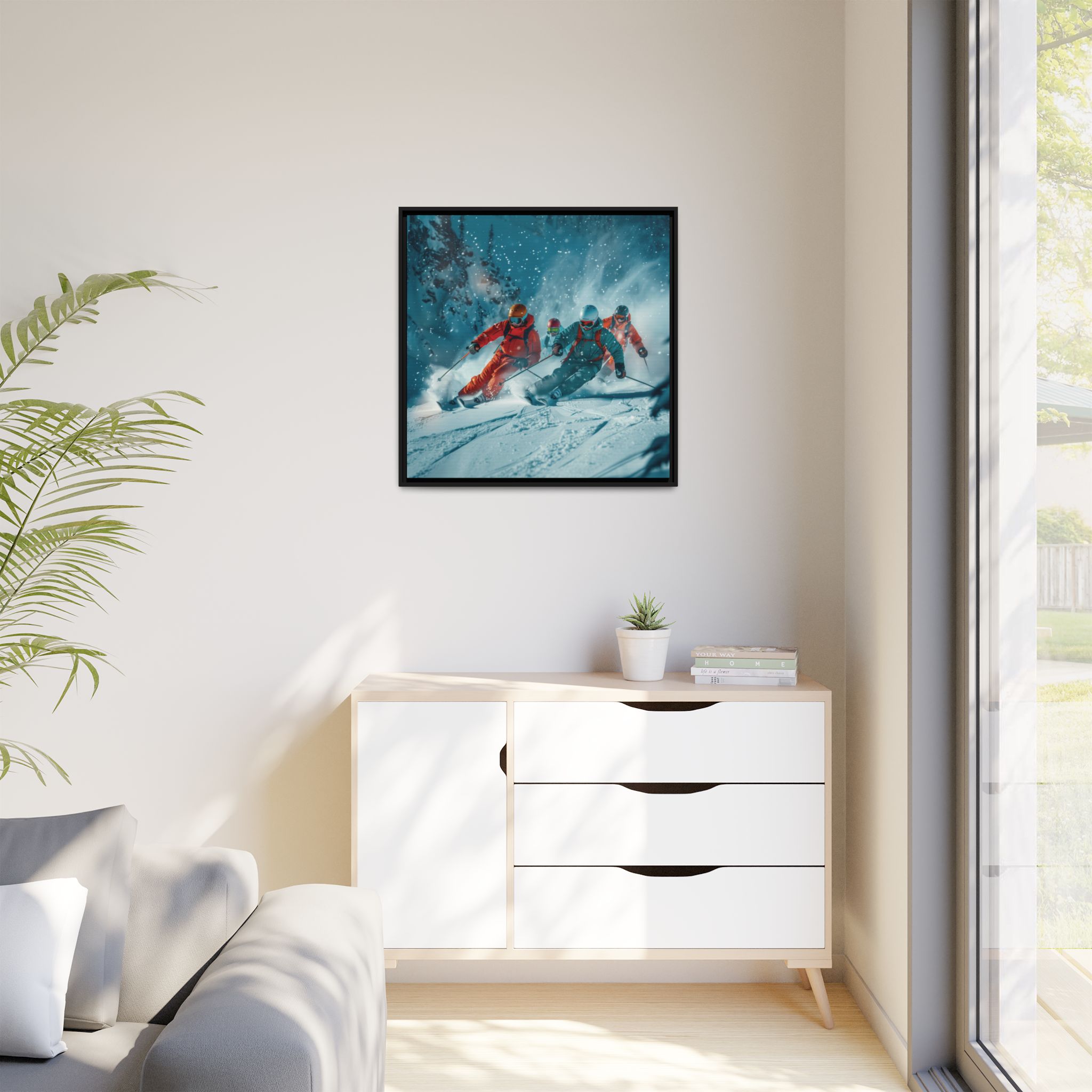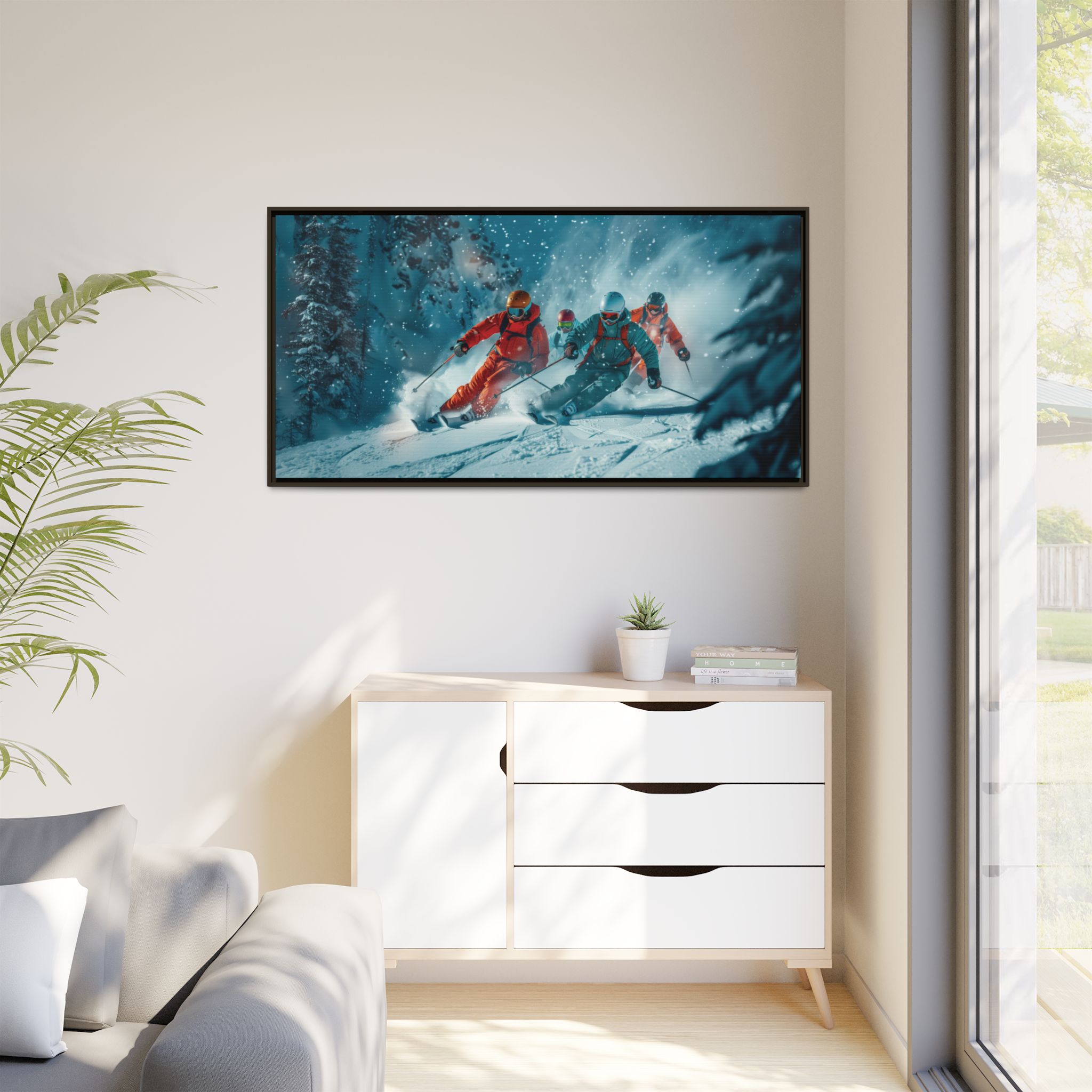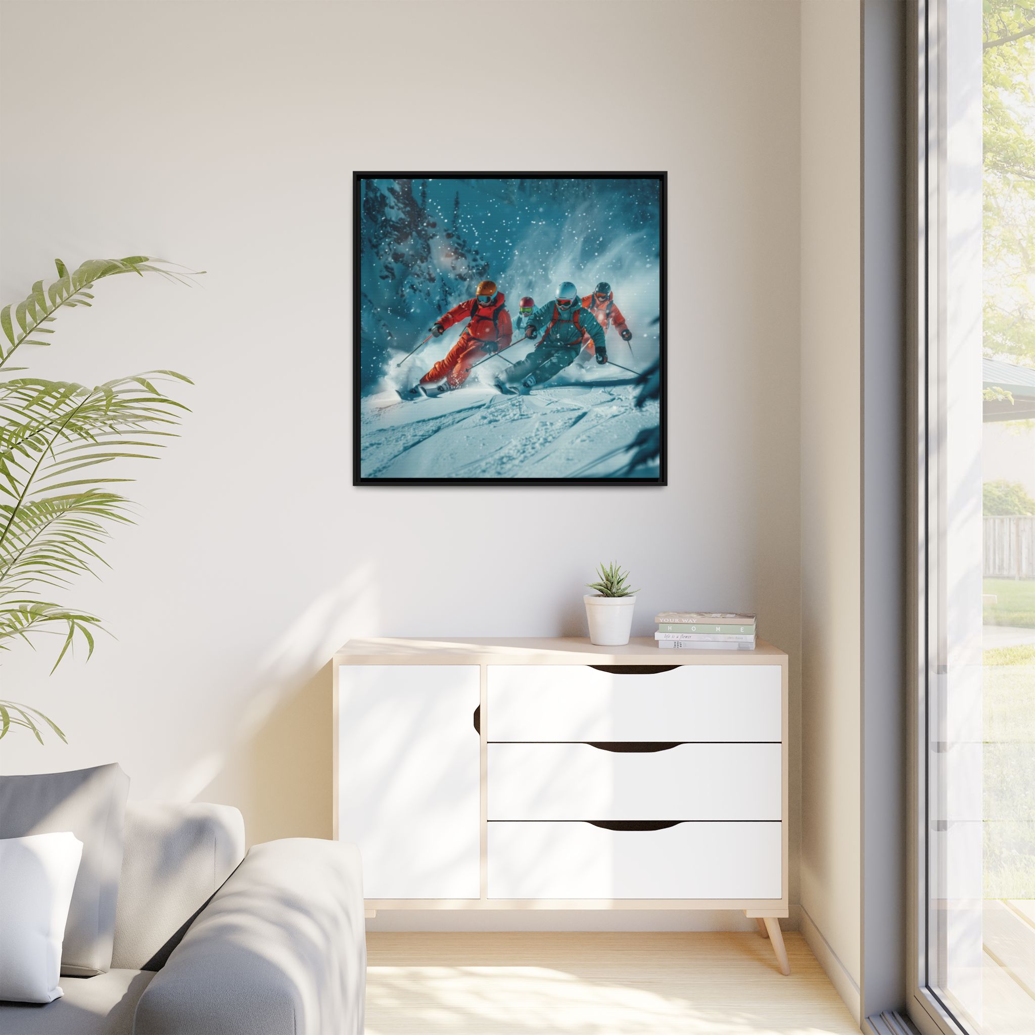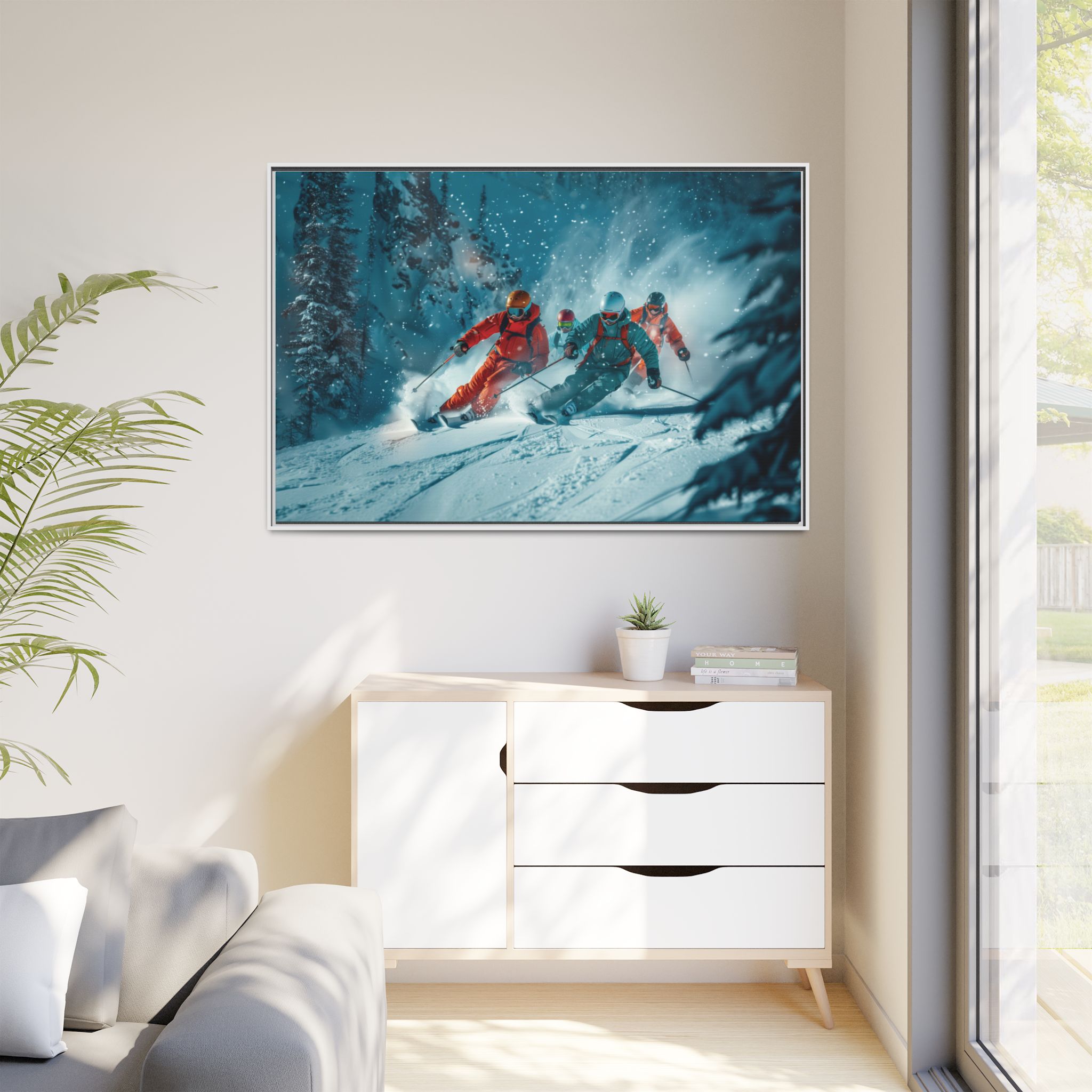 A dynamic action scene of skiers free skiing down the slopes in deep snow, a beutiful action landscape with intensity and excitement. The high-speed motion creates swirling snow clouds around them as they land on a snowy mountain slope. Experience the excitement of skiing with this dynamic action style canvas print. Perfect for adrenaline junkies and winter sports enthusiasts, this canvas brings intensity and motion to any room. Ideal for winter decor, sports enthusiasts, and anyone looking to add a thrilling touch to their space.