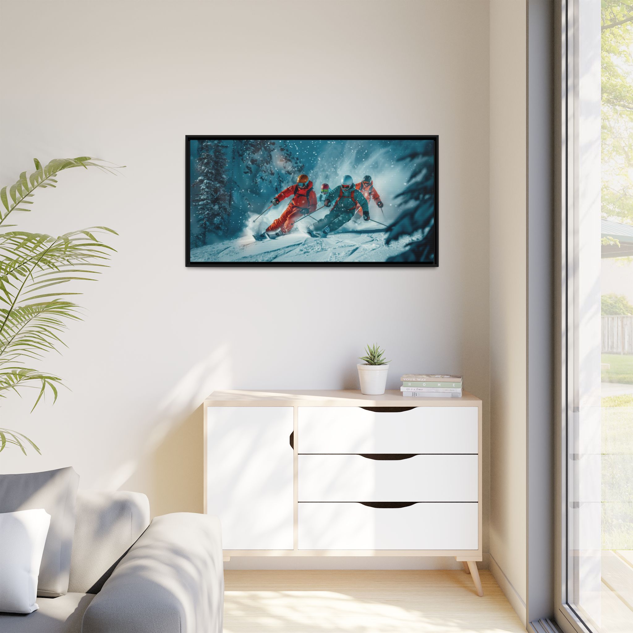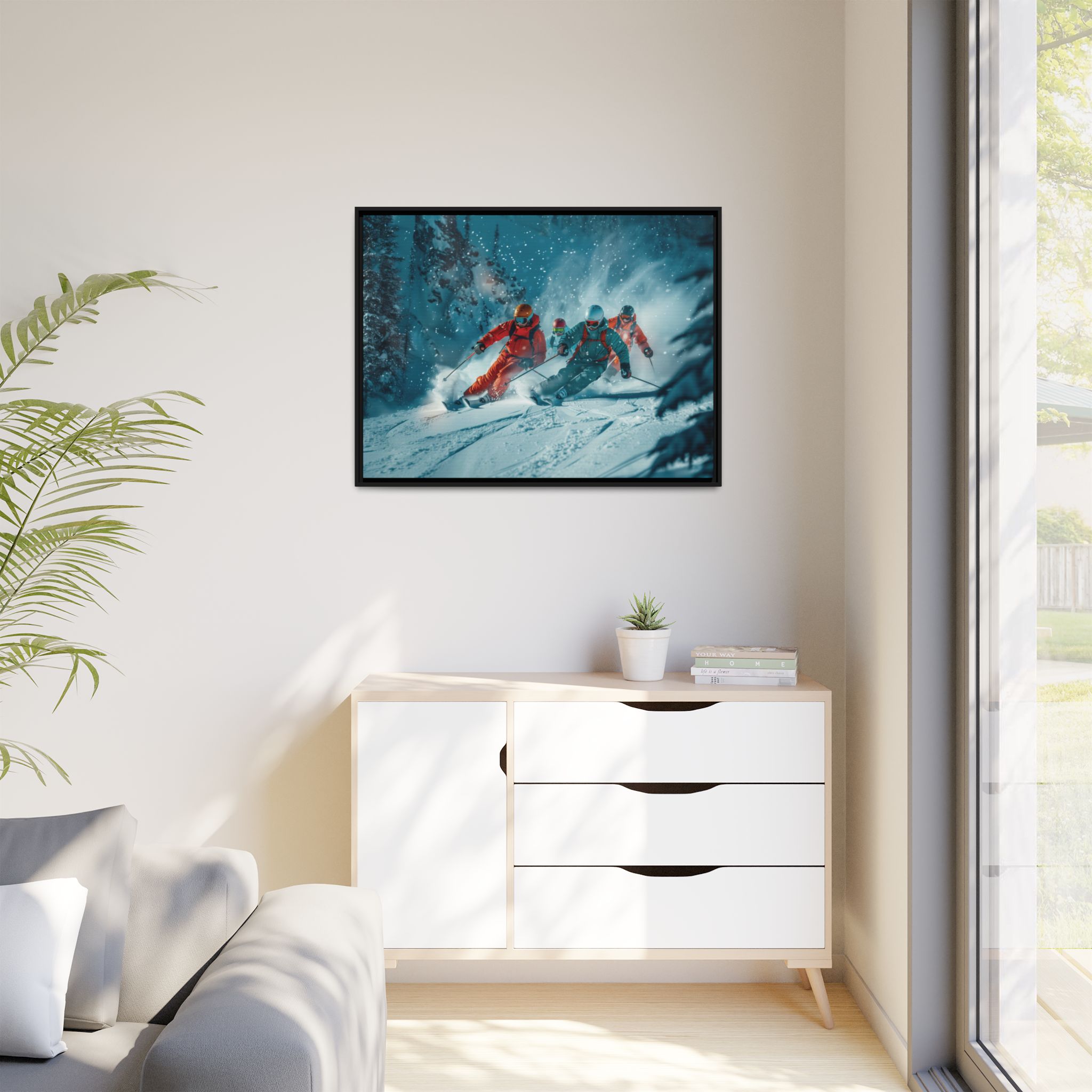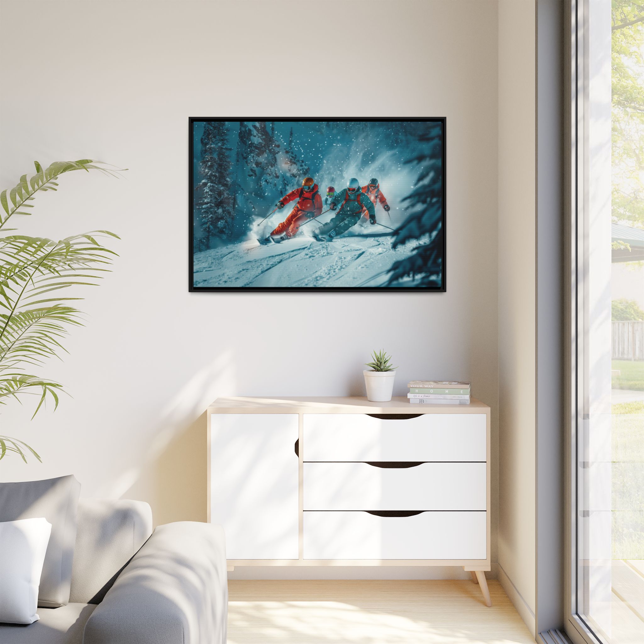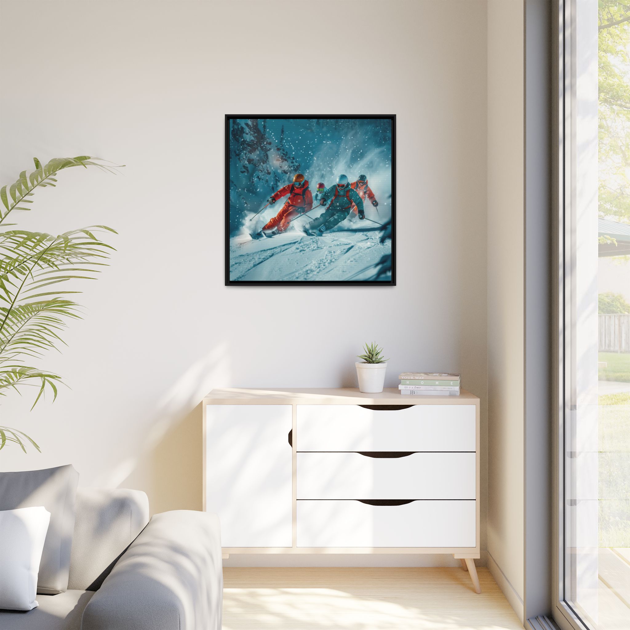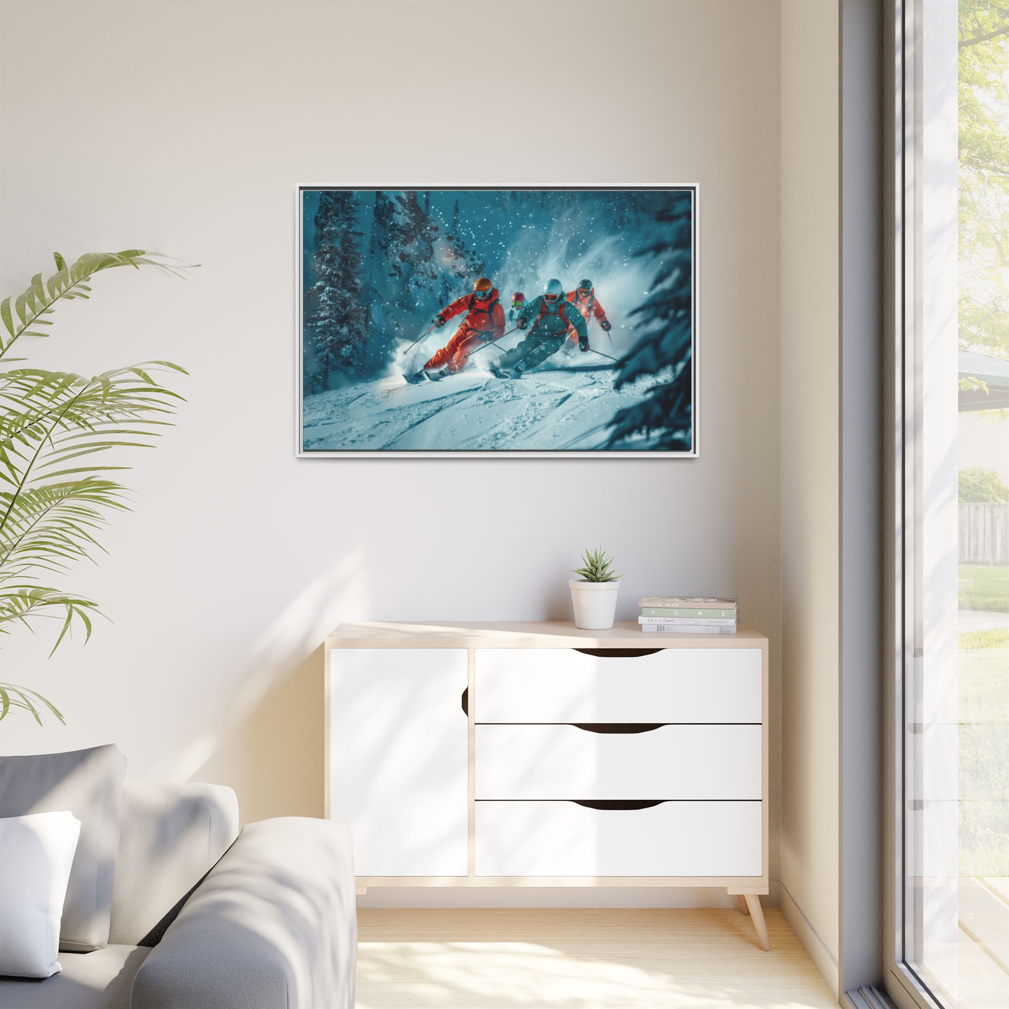 A dynamic action scene of skiers free skiing down the slopes in deep snow, a beutiful action landscape with intensity and excitement. The high-speed motion creates swirling snow clouds around them as they land on a snowy mountain slope. Experience the excitement of skiing with this dynamic action style canvas print. Perfect for adrenaline junkies and winter sports enthusiasts, this canvas brings intensity and motion to any room. Ideal for winter decor, sports enthusiasts, and anyone looking to add a thrilling touch to their space.