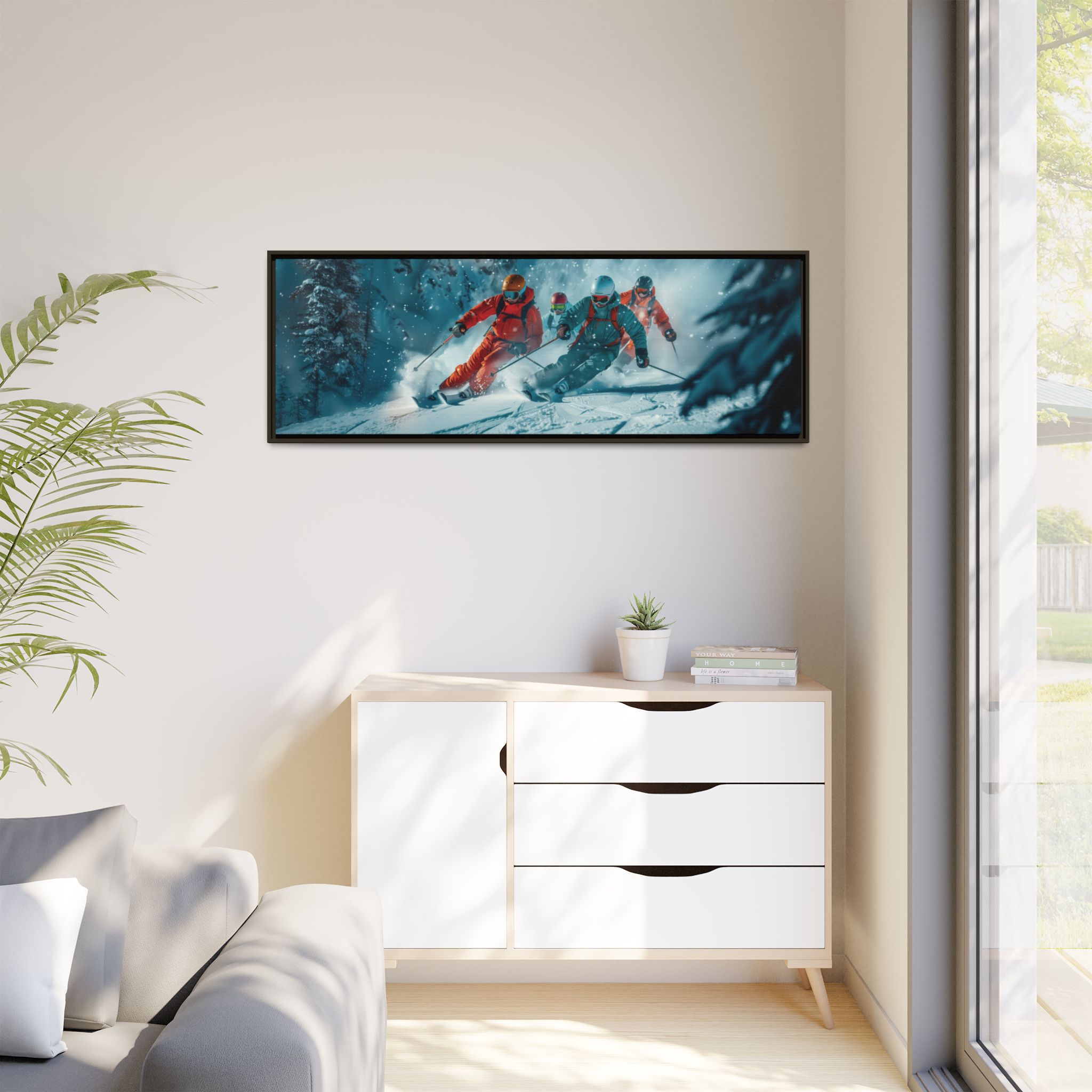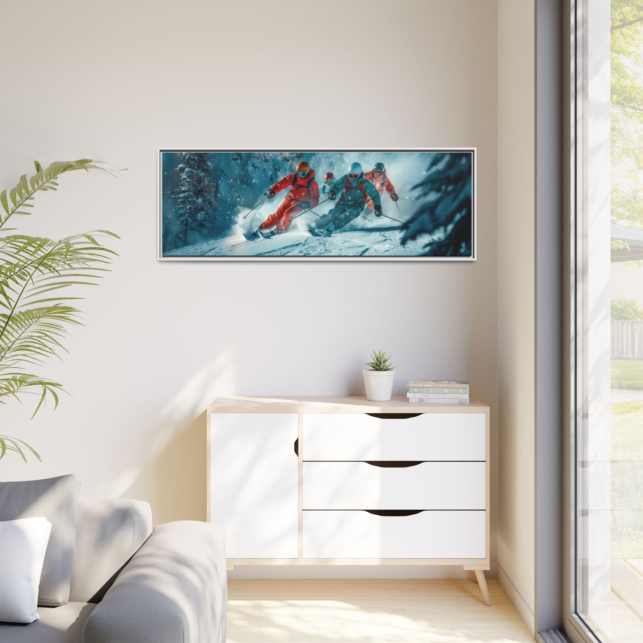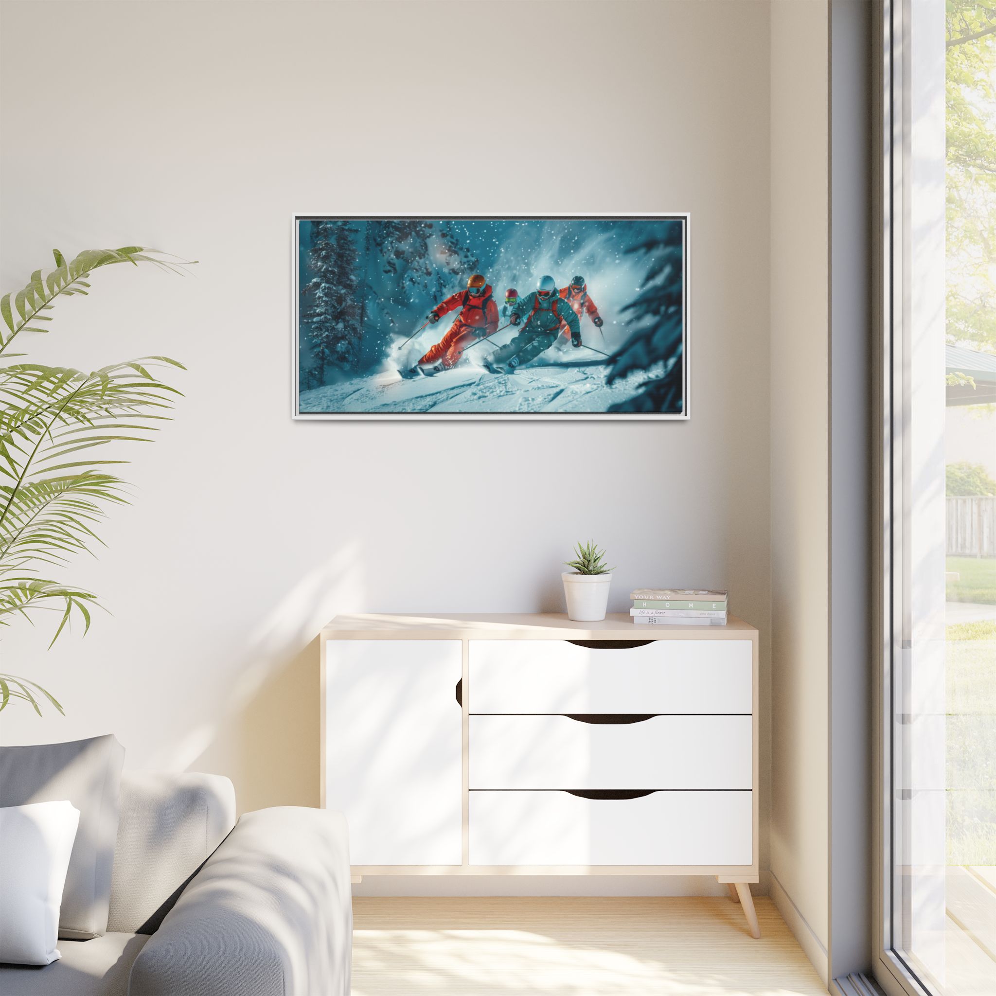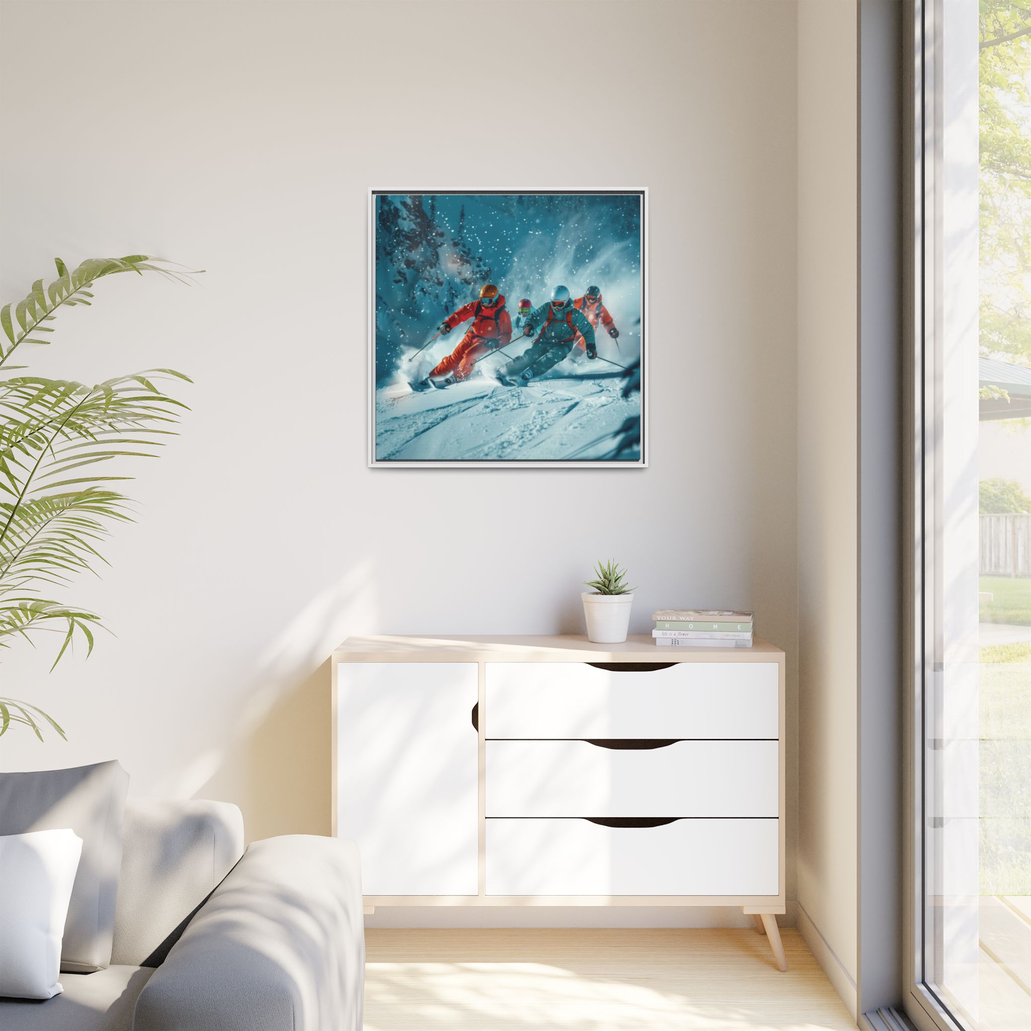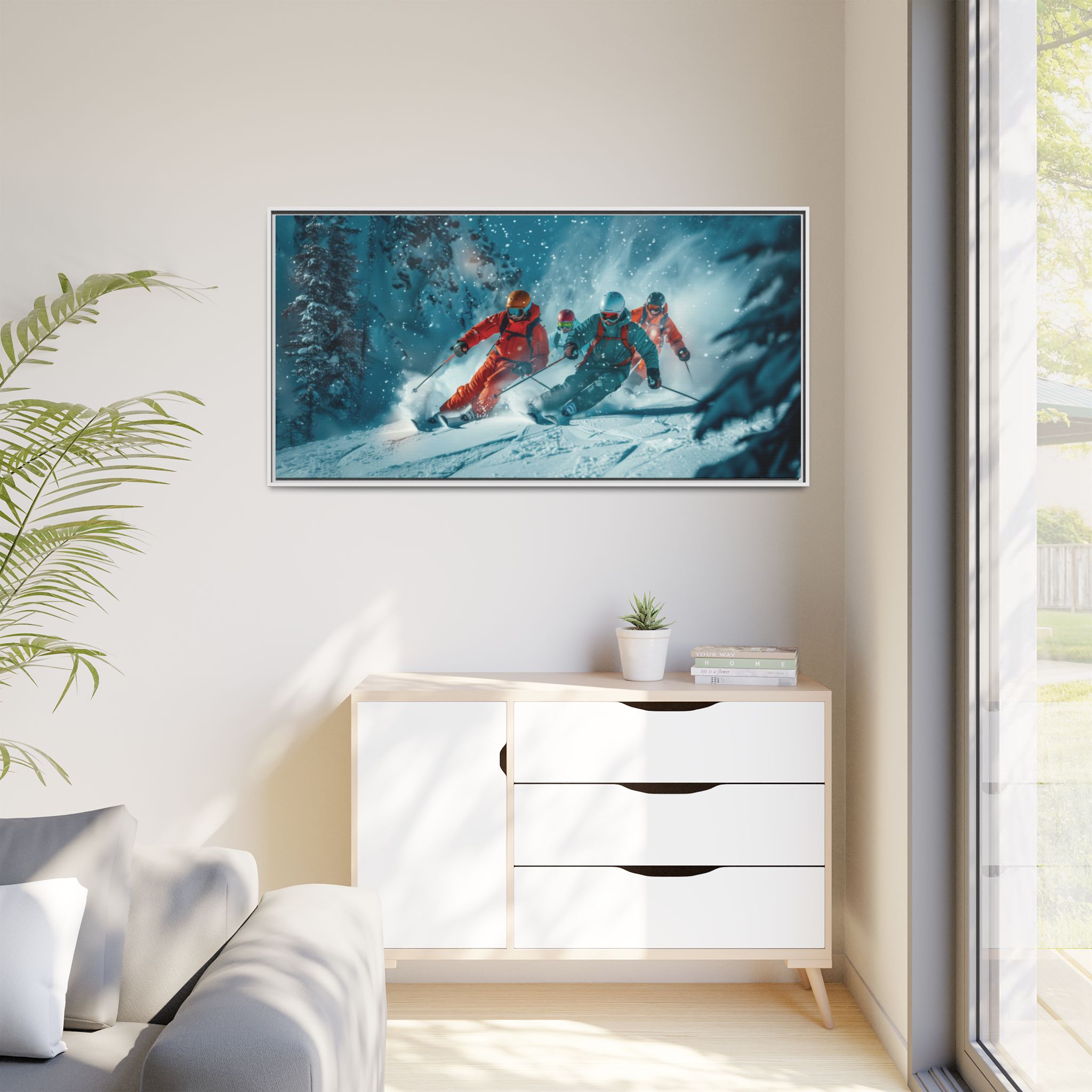 A dynamic action scene of skiers free skiing down the slopes in deep snow, a beutiful action landscape with intensity and excitement. The high-speed motion creates swirling snow clouds around them as they land on a snowy mountain slope. Experience the excitement of skiing with this dynamic action style canvas print. Perfect for adrenaline junkies and winter sports enthusiasts, this canvas brings intensity and motion to any room. Ideal for winter decor, sports enthusiasts, and anyone looking to add a thrilling touch to their space.