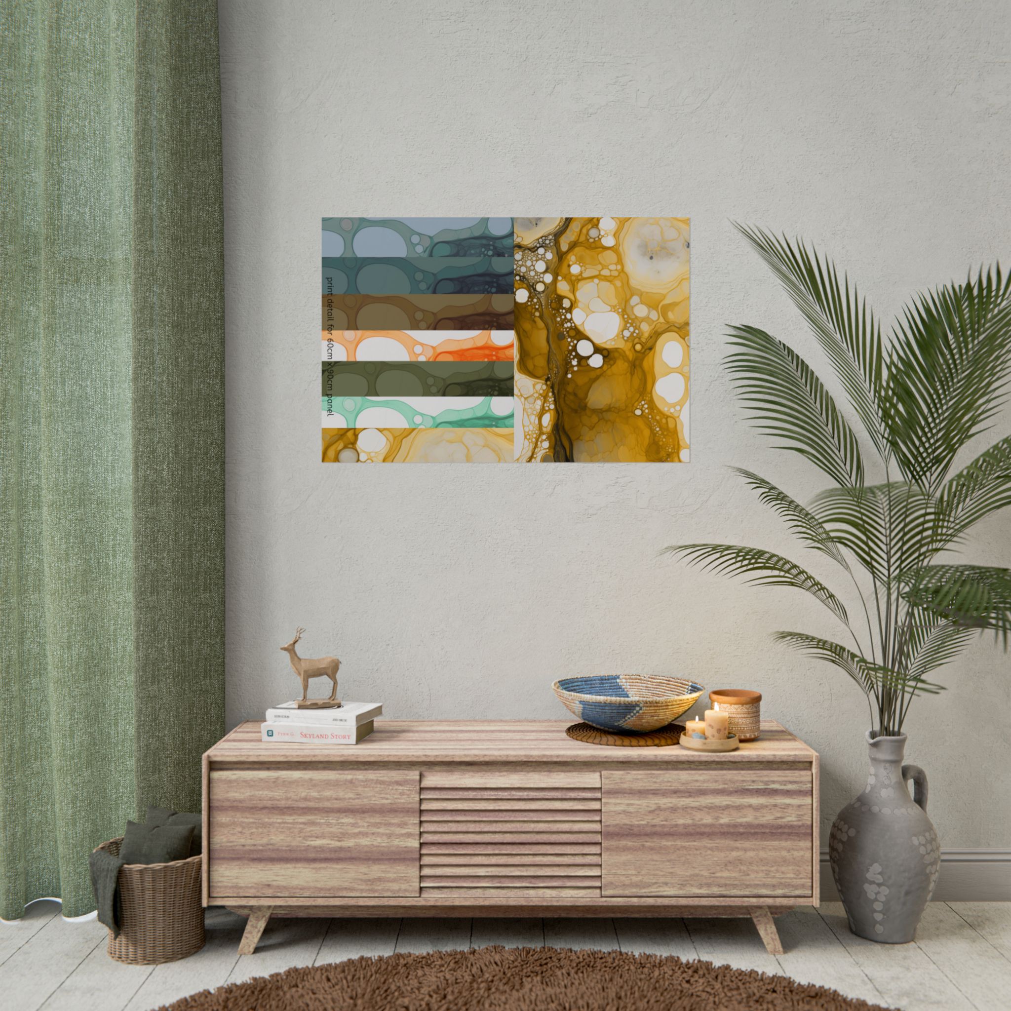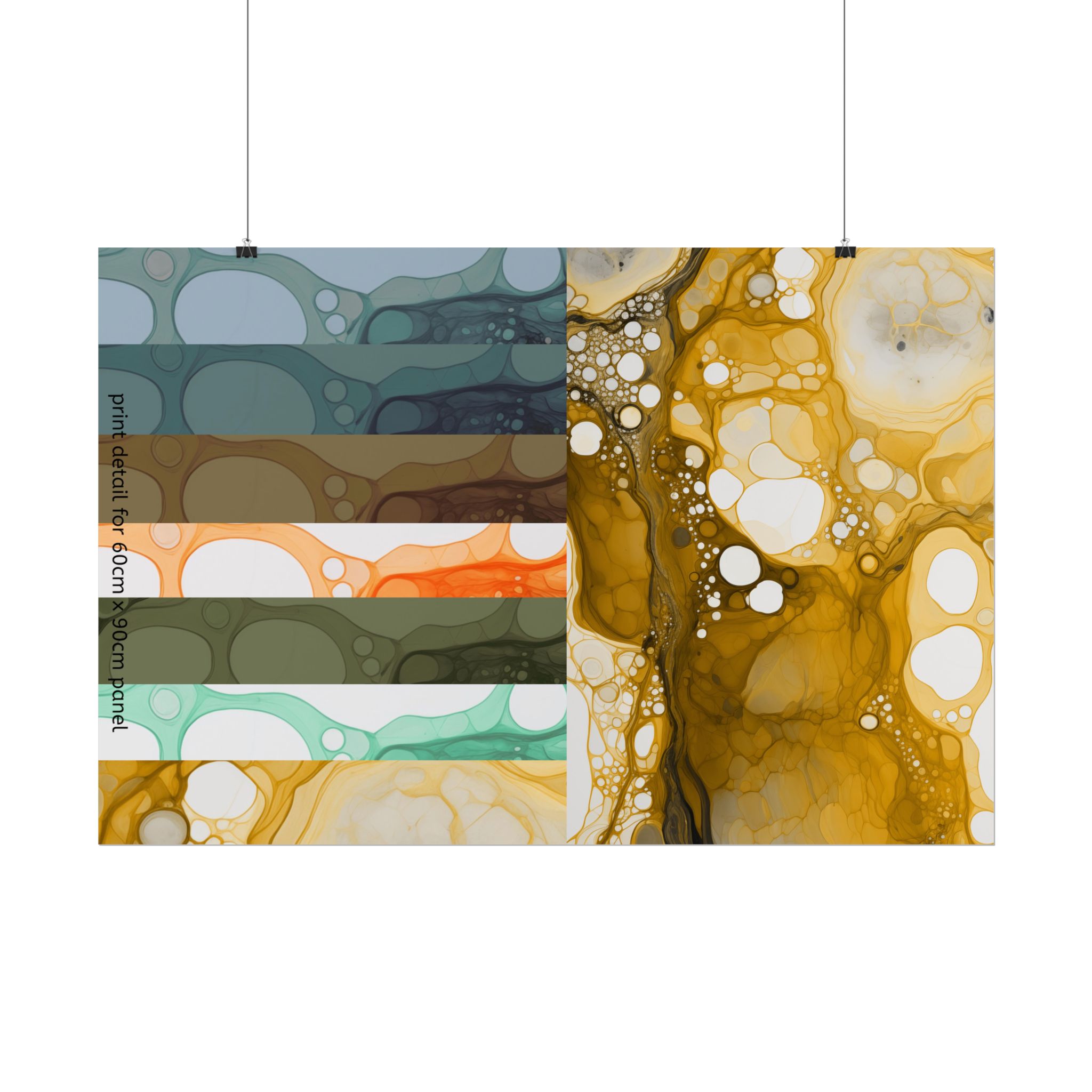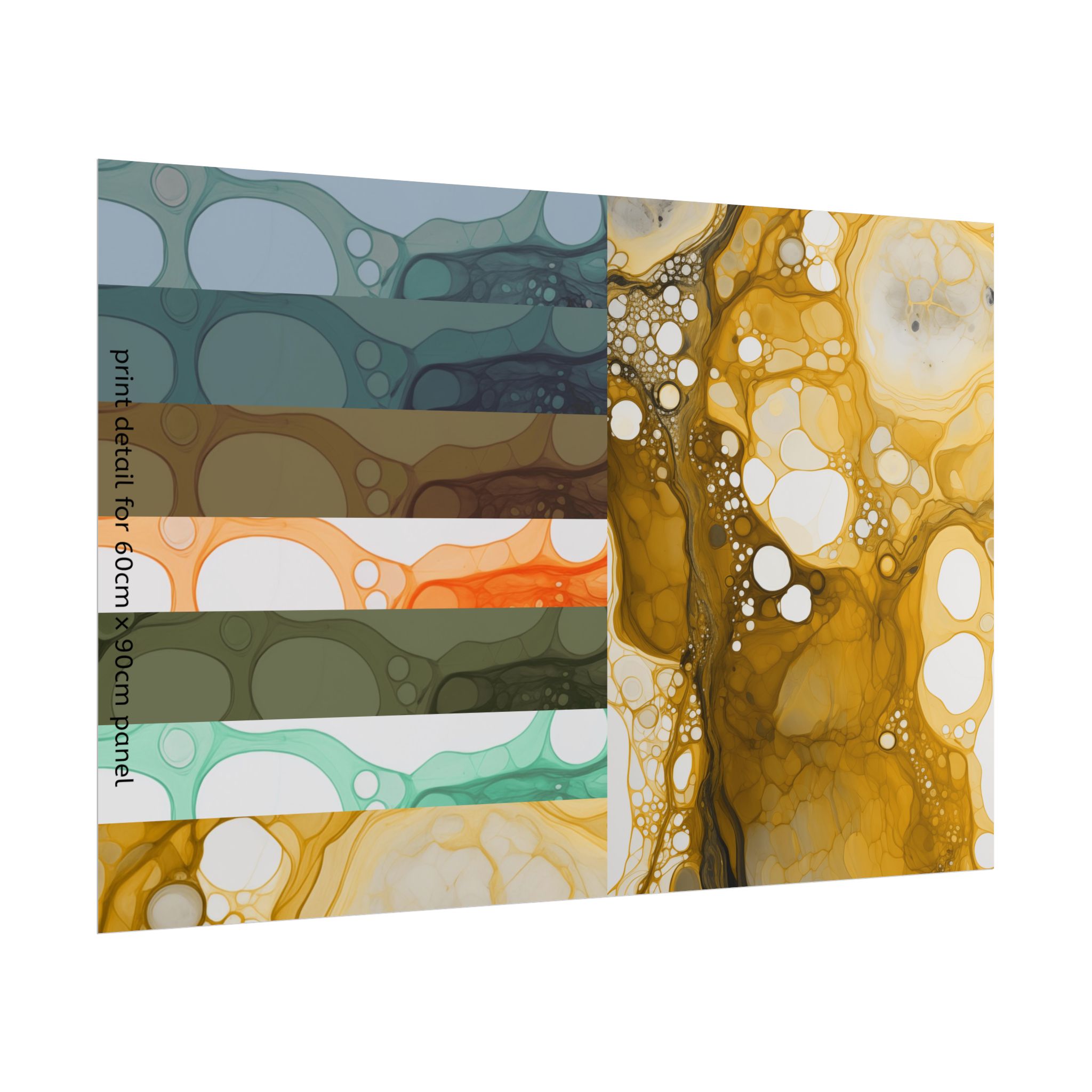 Not sure about the colours? our paper printed sample includes 1 actual artwork panel ( 24 inches / 60cm ) wide that you can upcycle into a framed print for your project. Along with this we combine a full scale sample block for detail of the final render (based on 24″x36″ / 60cm x 90cm print) and available colour variations of the collection in reduced size. All for a reduced rate, just choose your finish.