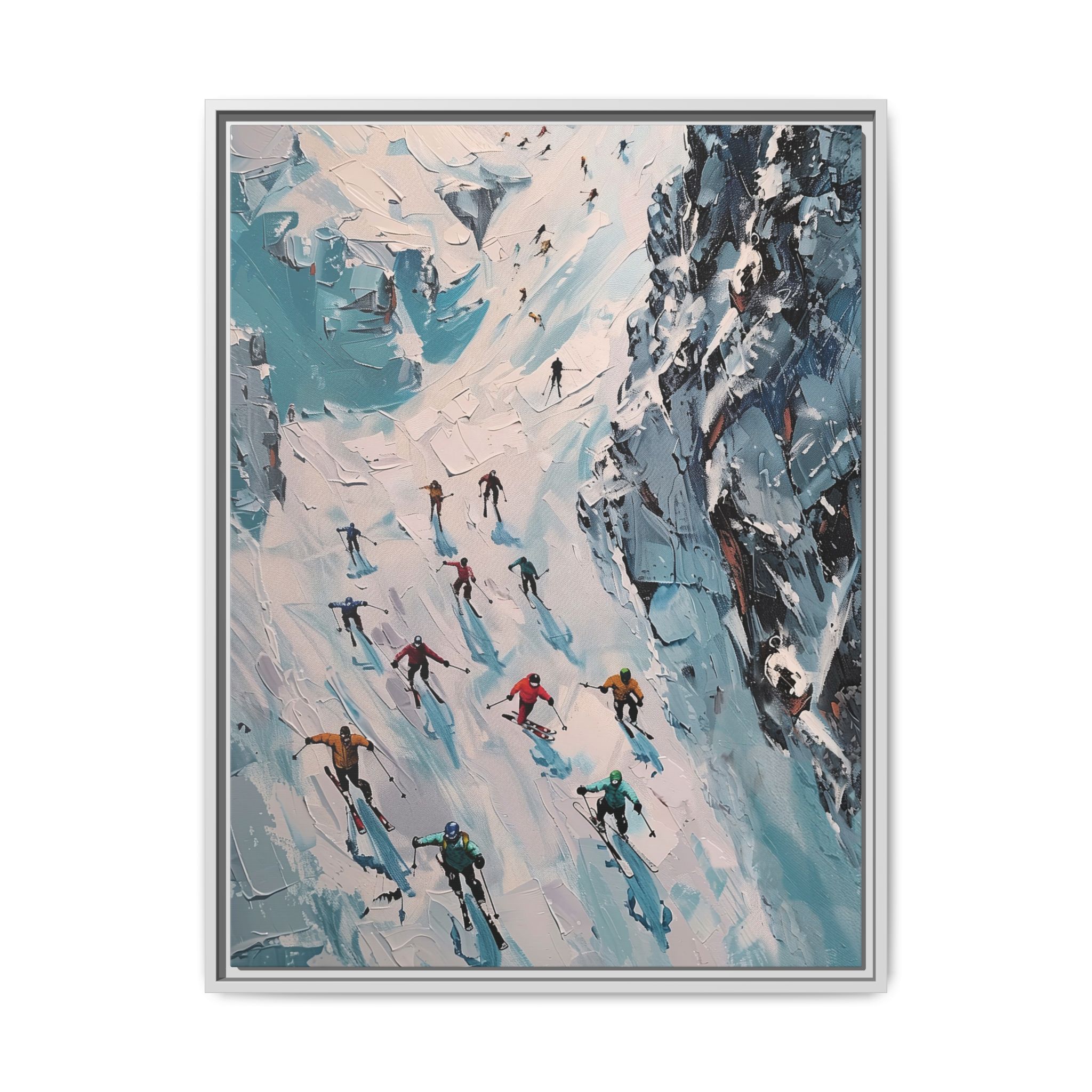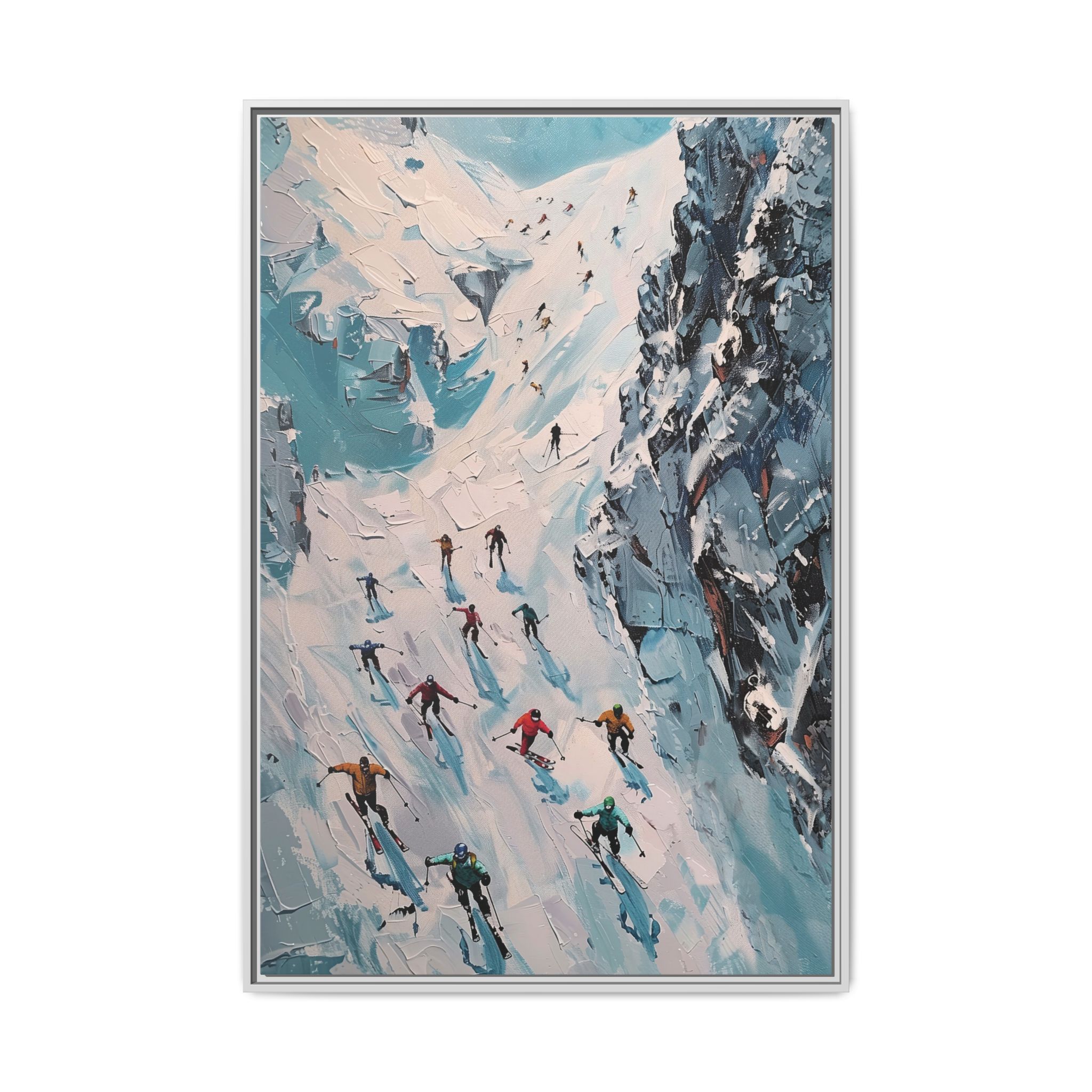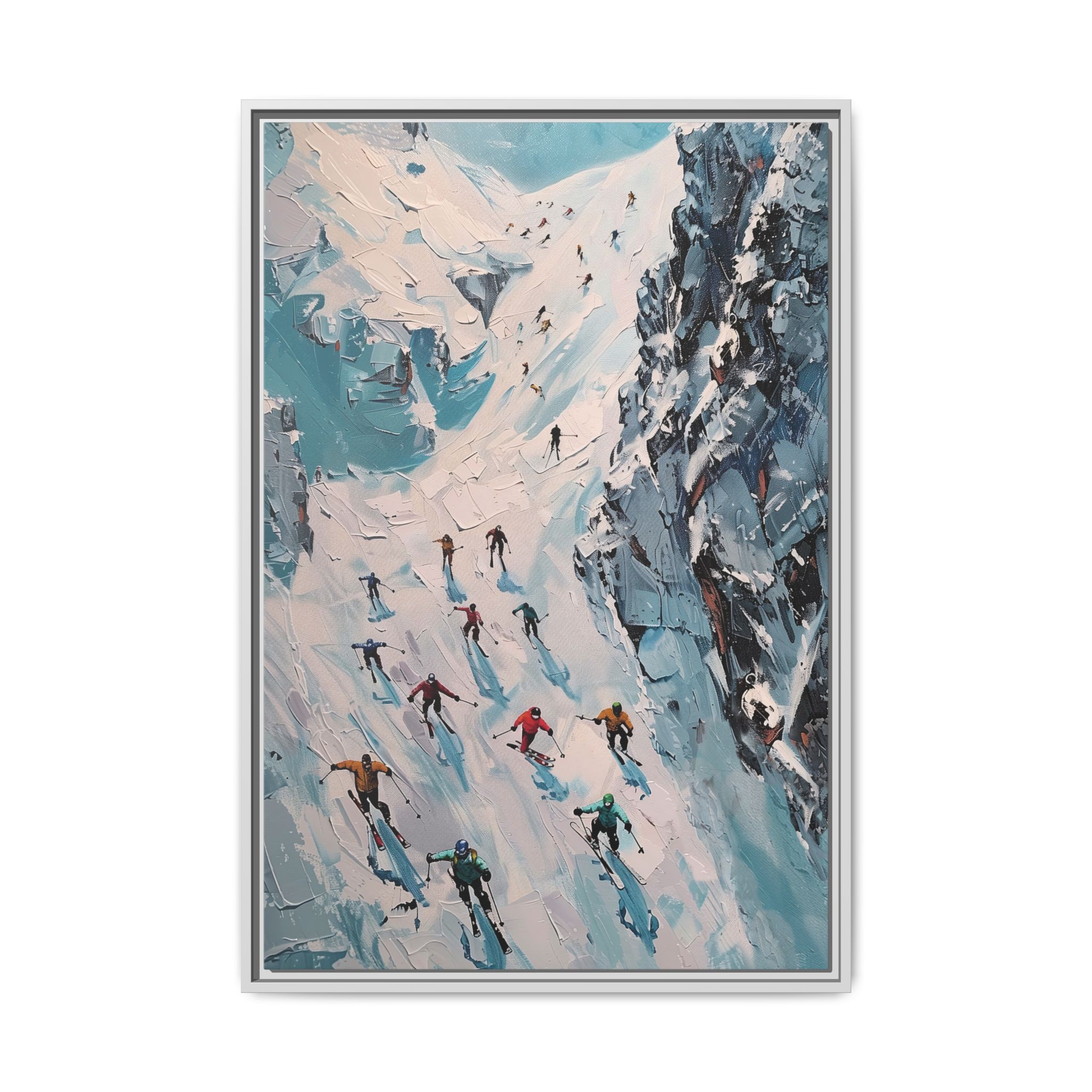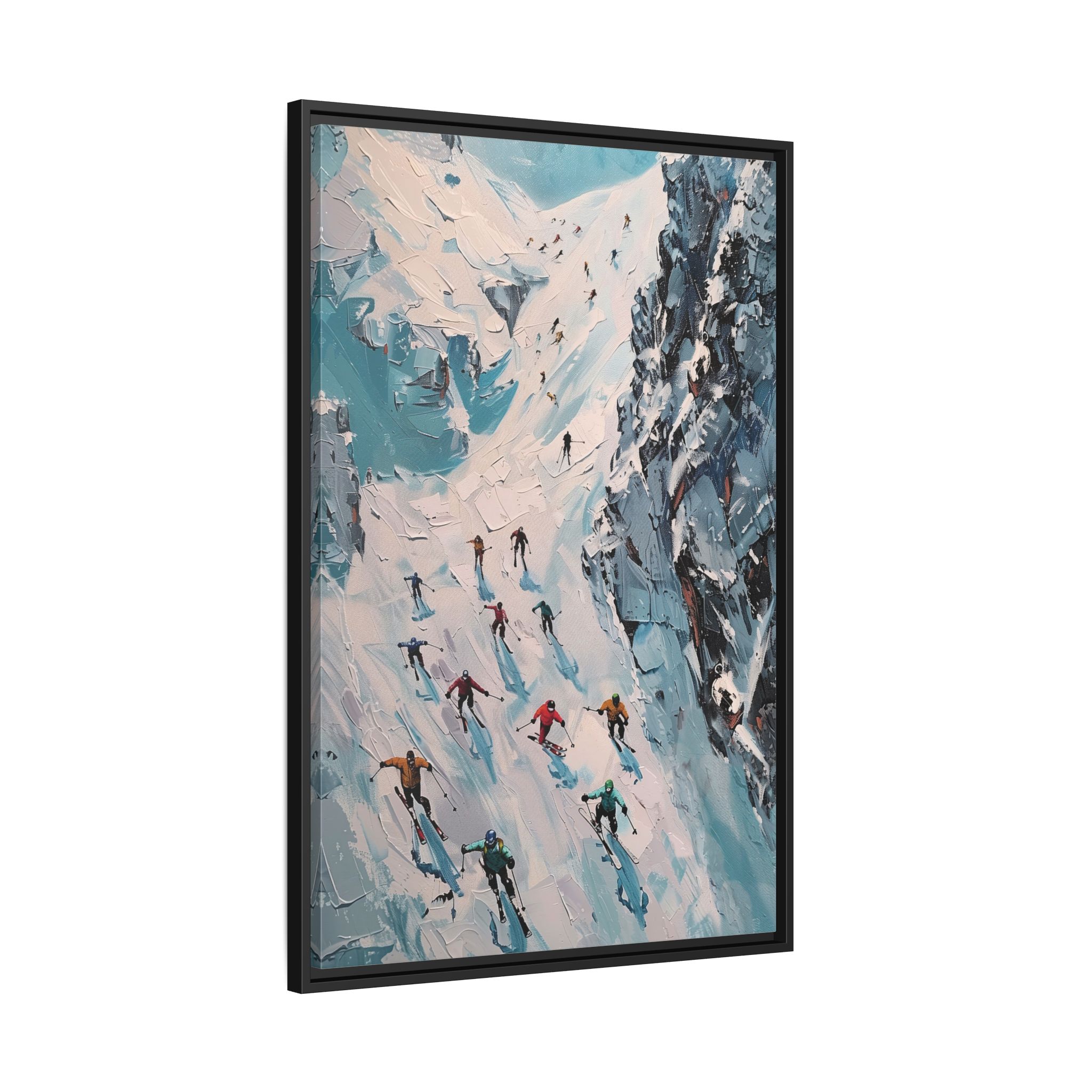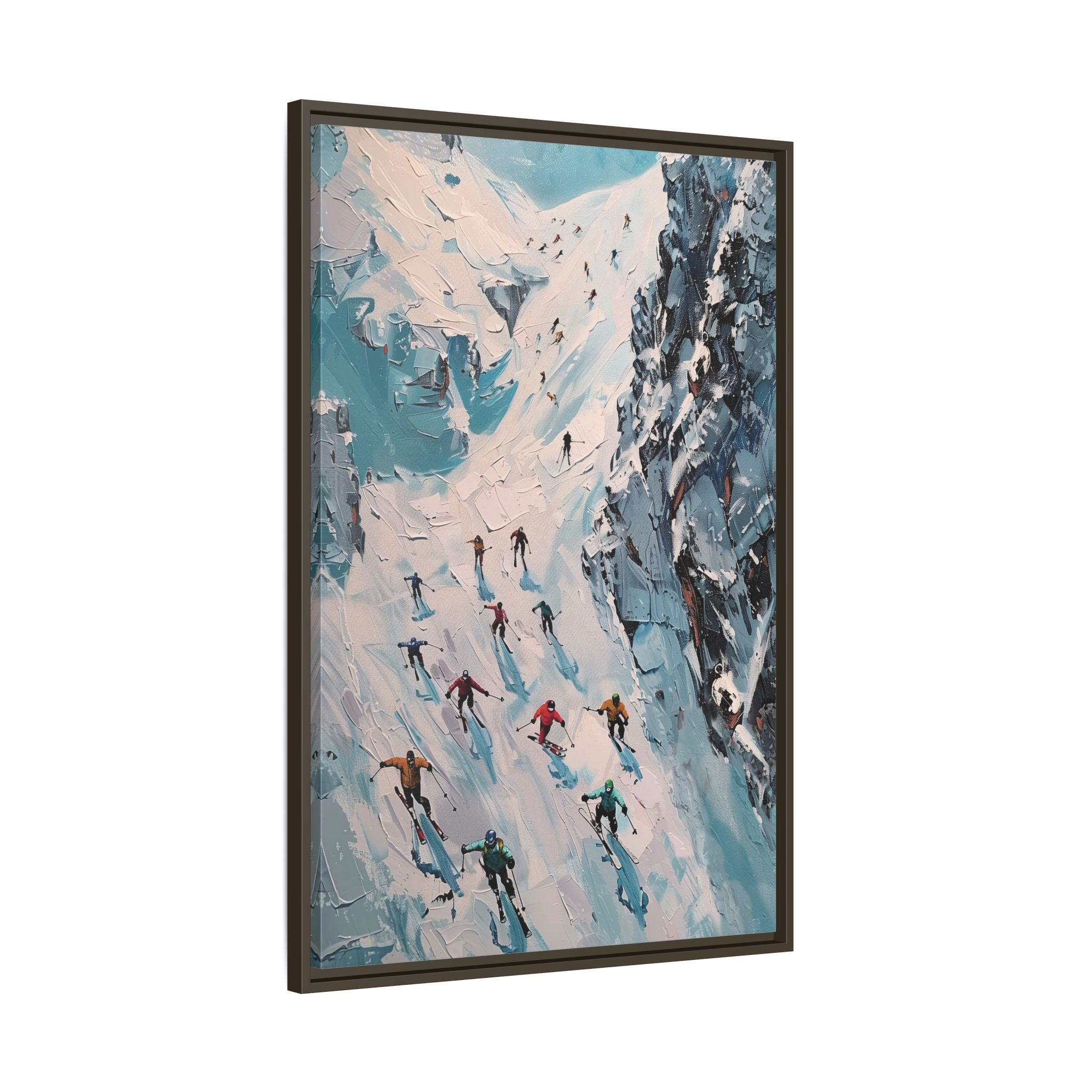Bring the casual fresh vibe of skiers skiing down a slope into your home with this oil painting style multi-coloured canvas print. Perfect for ski enthusiasts or those who love winter sports, this framed matte canvas print will add a touch of vibrancy to any room. Ideal for winter decor, ski lodge ambiance, or as a gift for someone who loves skiing.