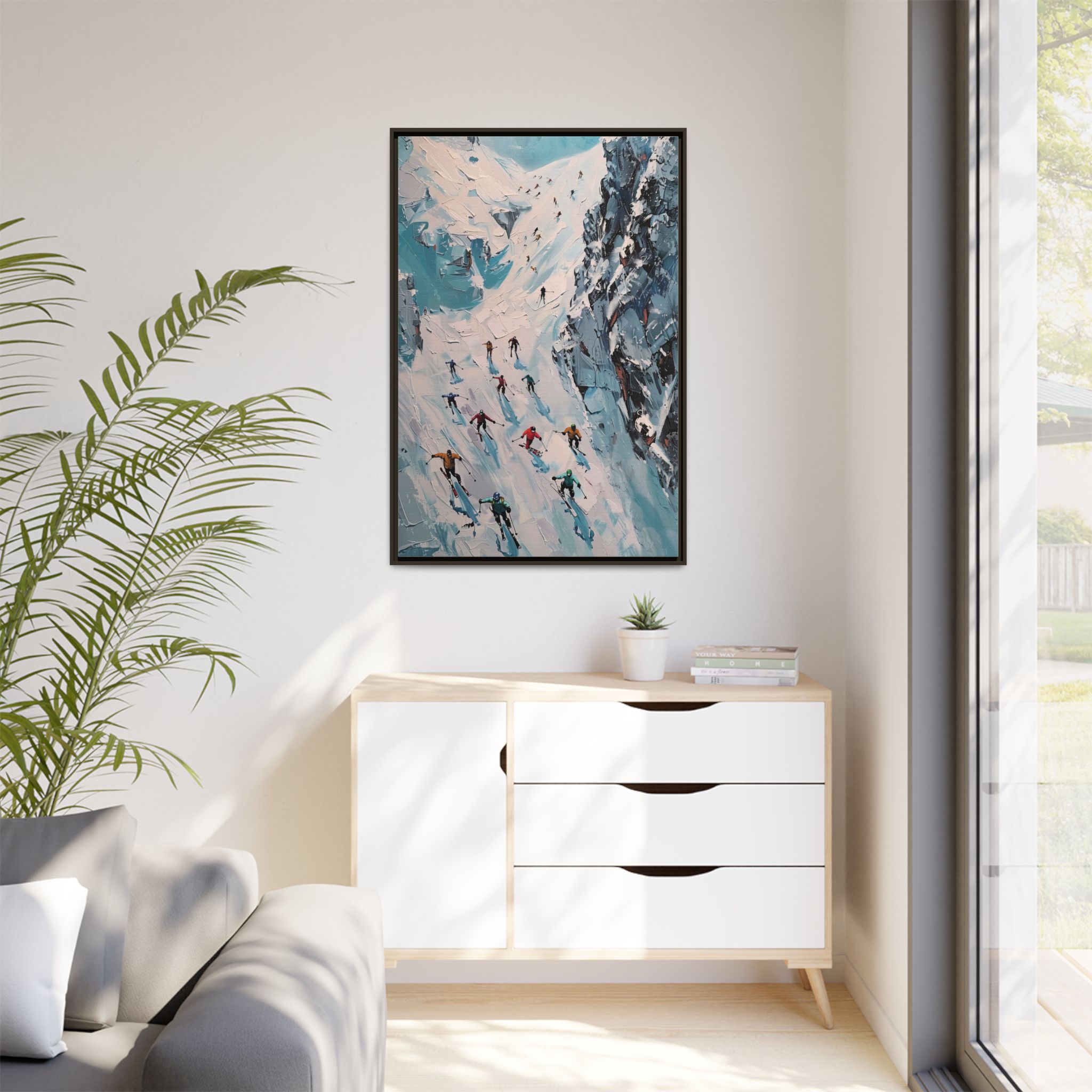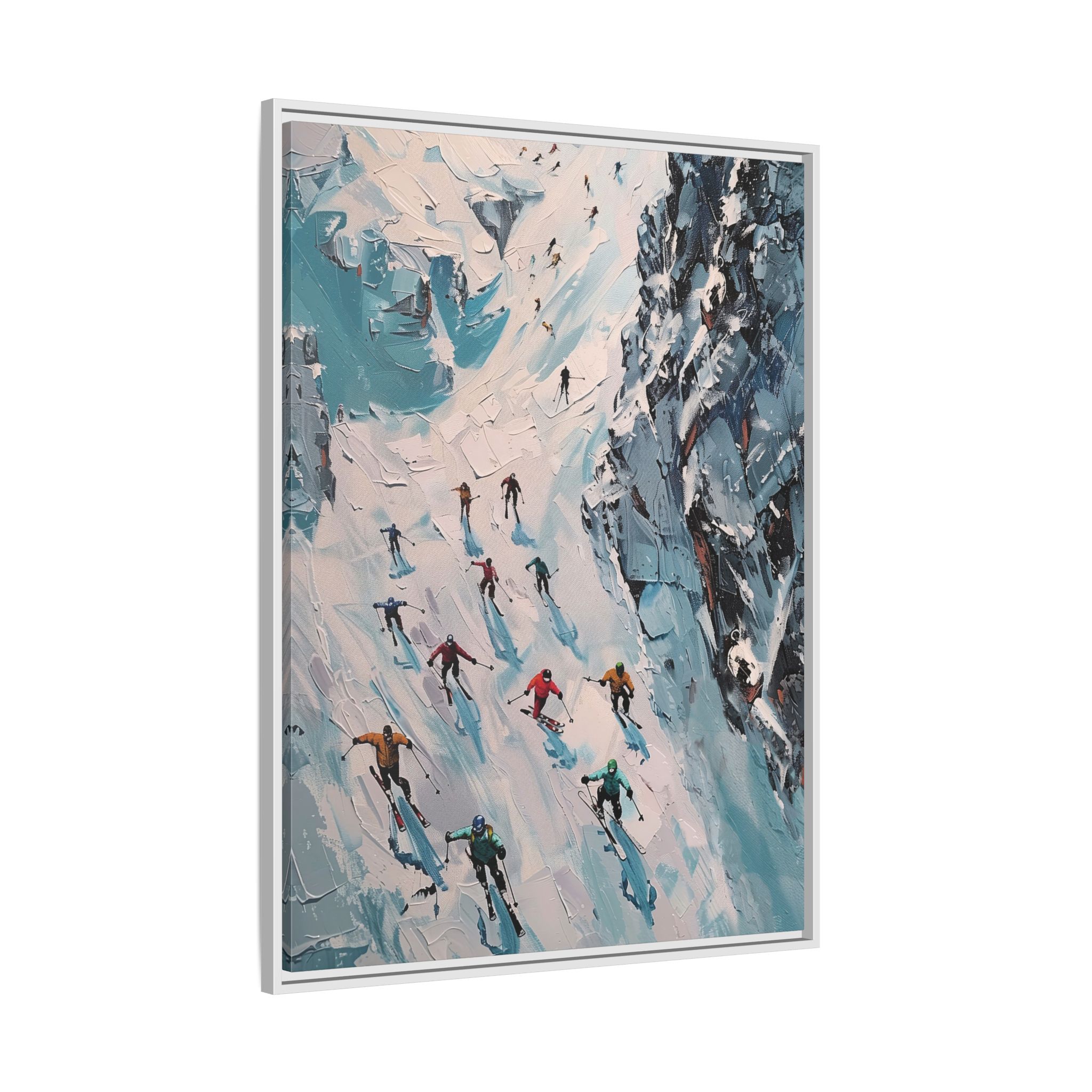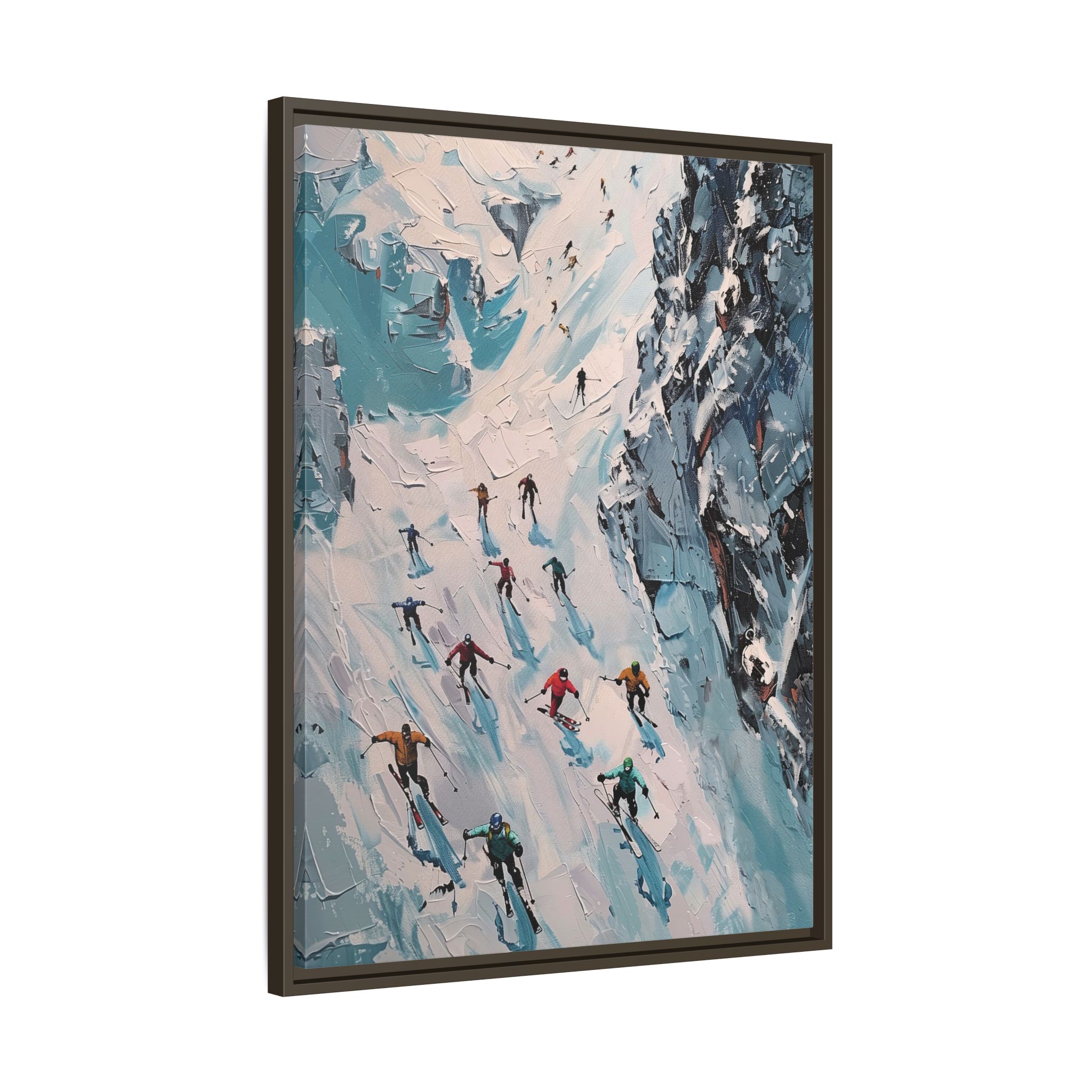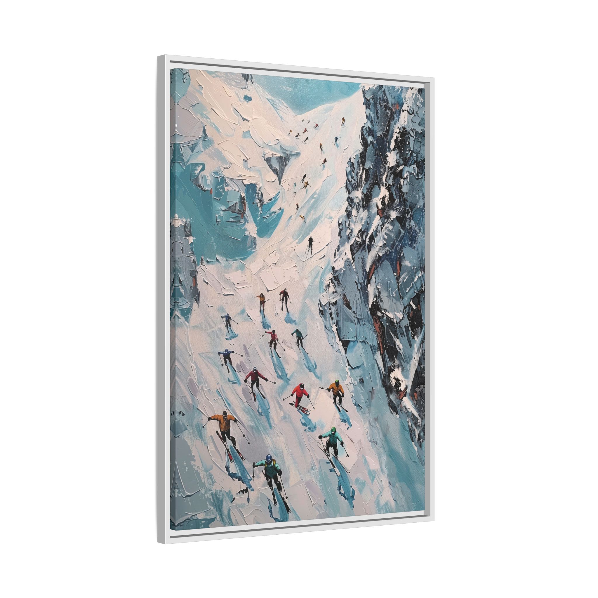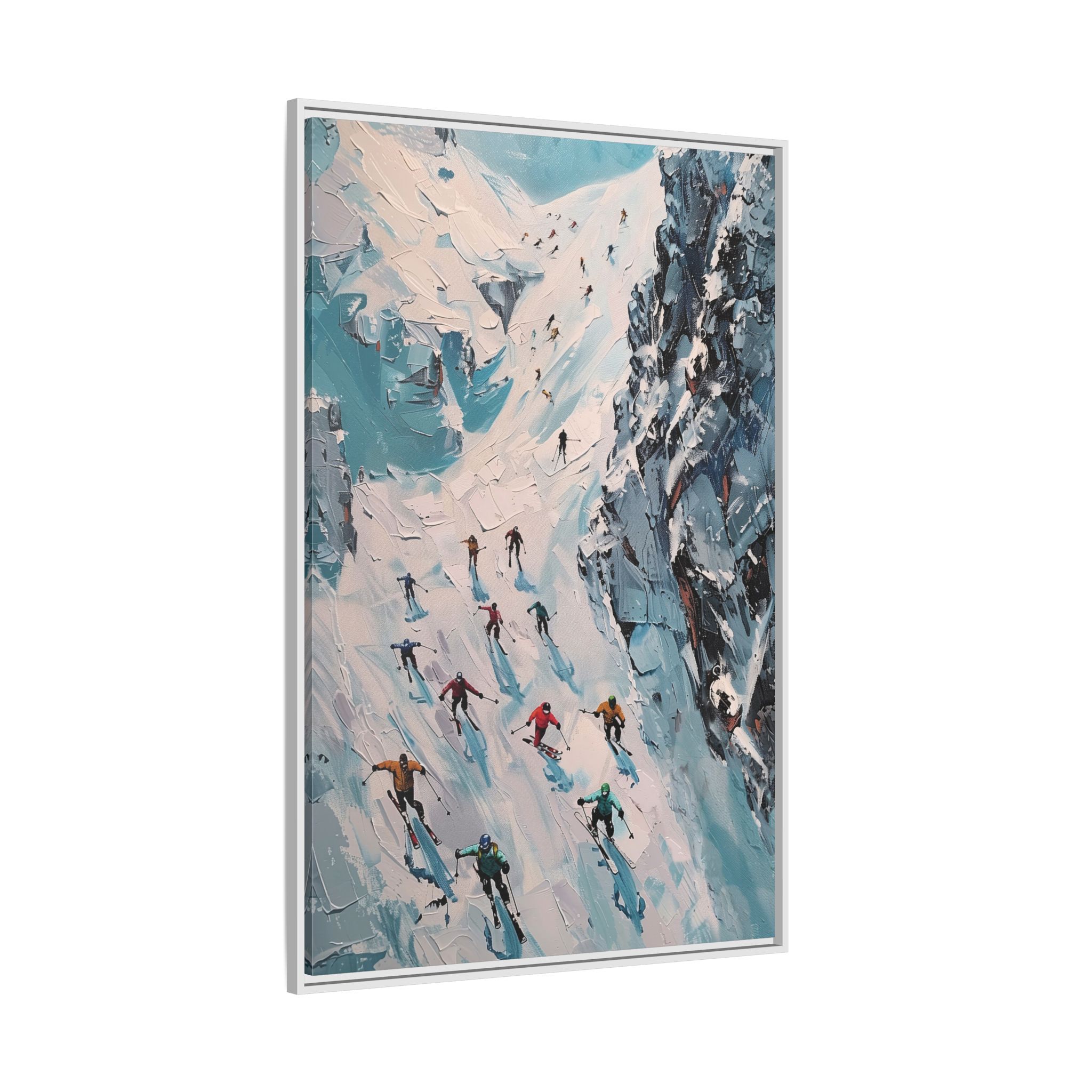 Bring the casual fresh vibe of skiers skiing down a slope into your home with this oil painting style multi-coloured canvas print. Perfect for ski enthusiasts or those who love winter sports, this framed matte canvas print will add a touch of vibrancy to any room. Ideal for winter decor, ski lodge ambiance, or as a gift for someone who loves skiing.