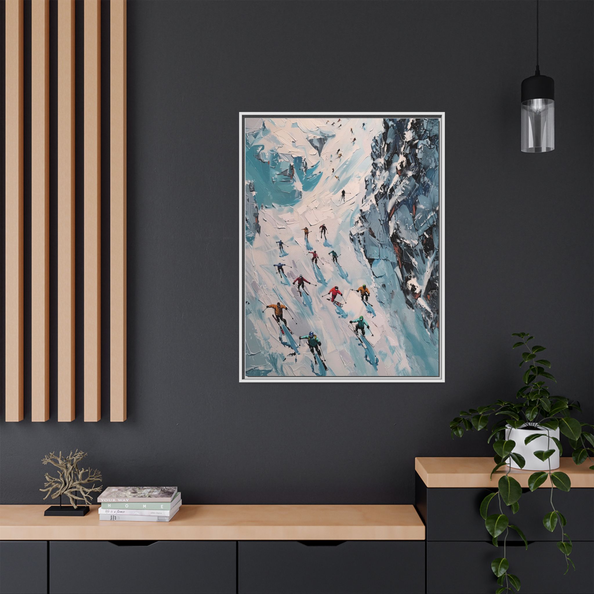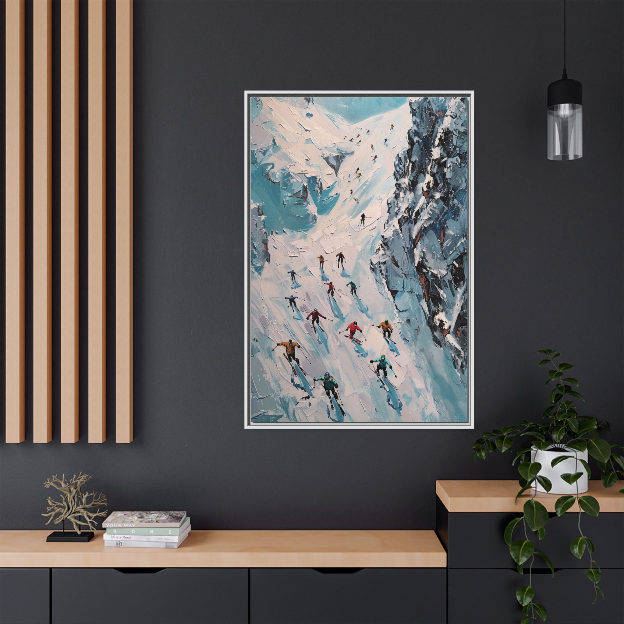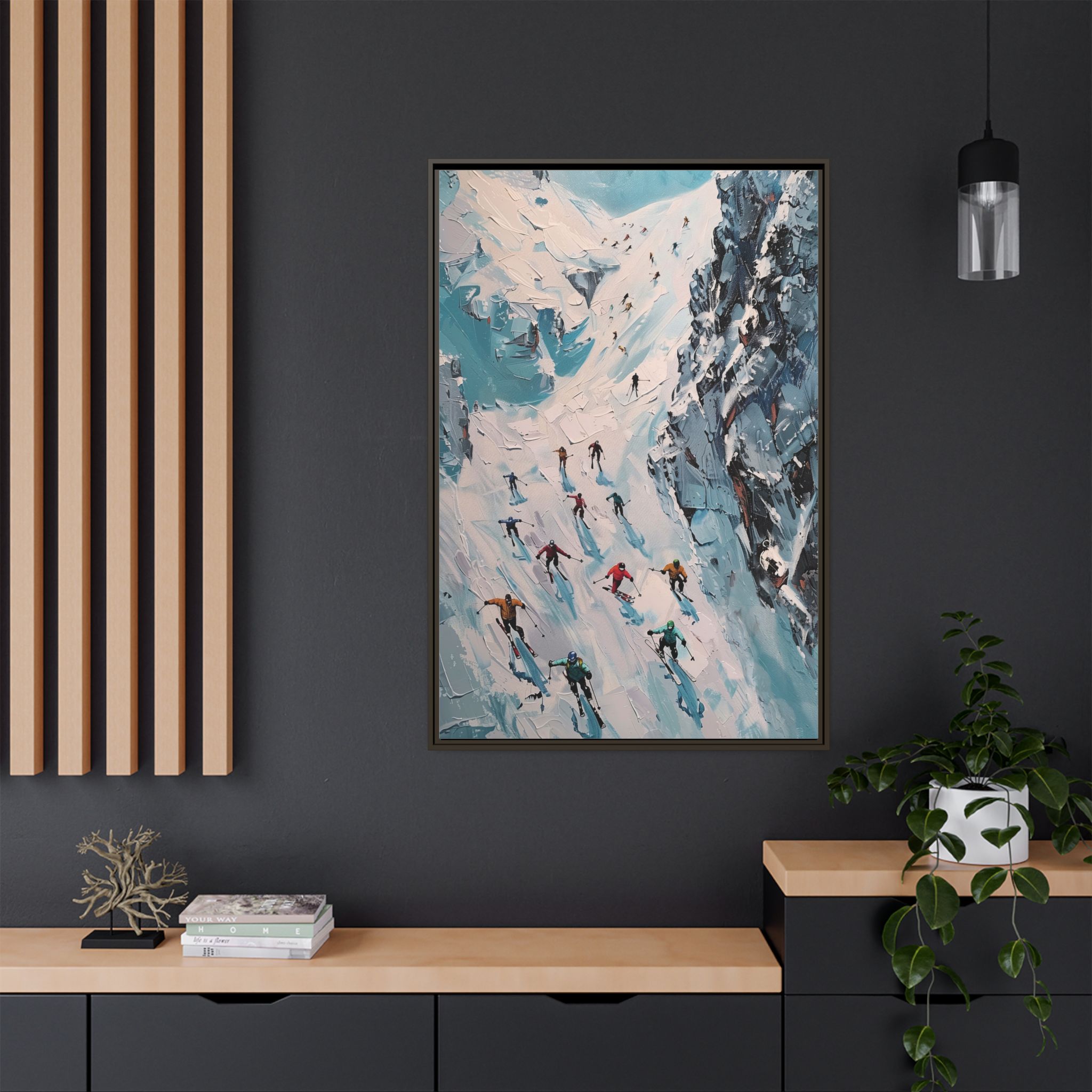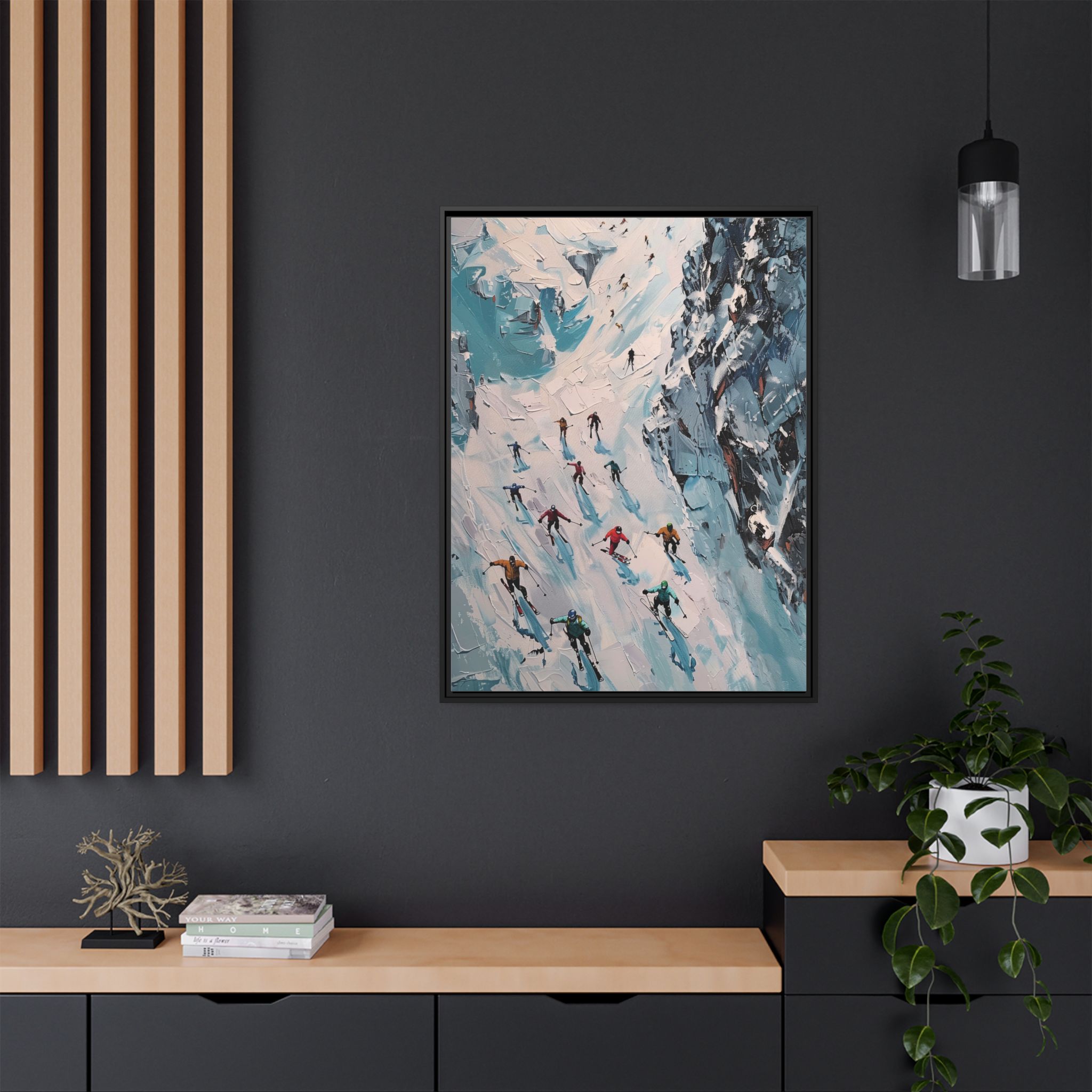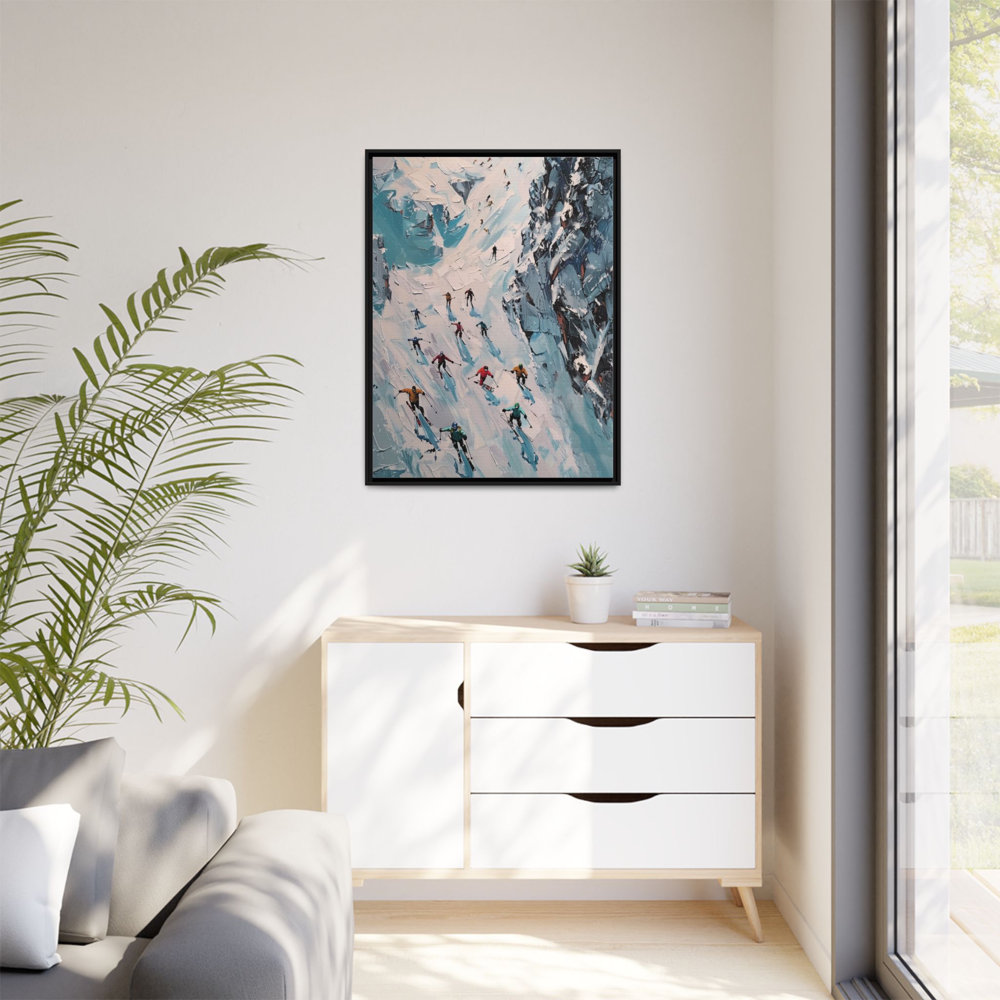 Bring the casual fresh vibe of skiers skiing down a slope into your home with this oil painting style multi-coloured canvas print. Perfect for ski enthusiasts or those who love winter sports, this framed matte canvas print will add a touch of vibrancy to any room. Ideal for winter decor, ski lodge ambiance, or as a gift for someone who loves skiing.