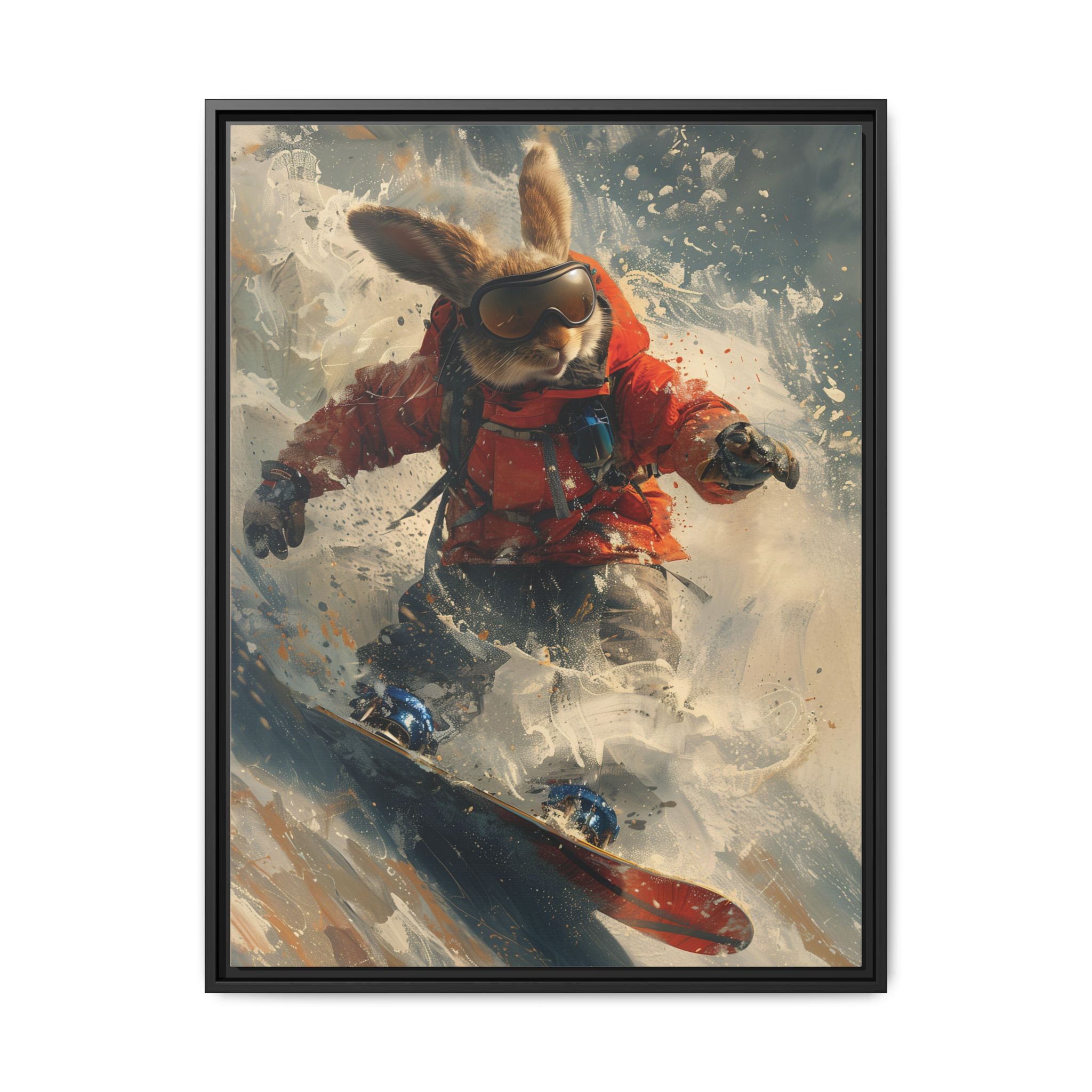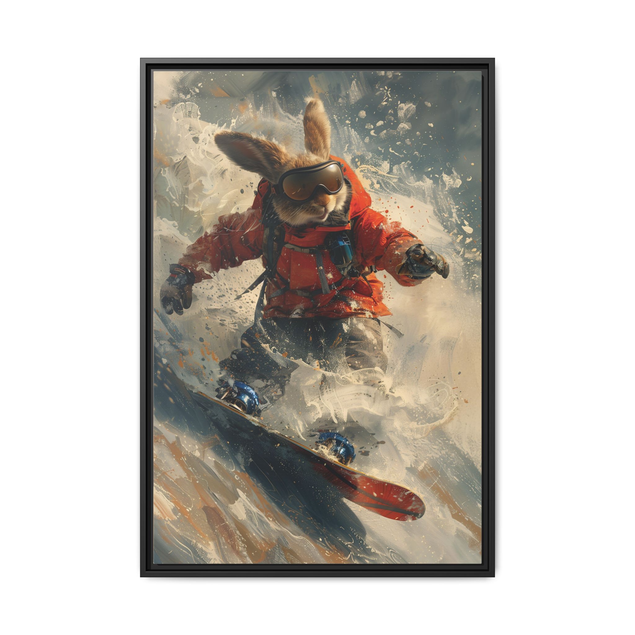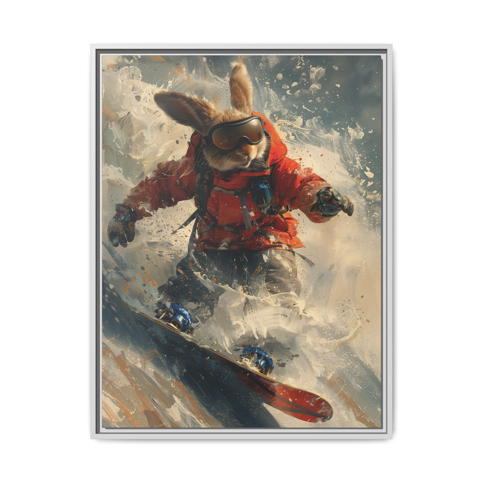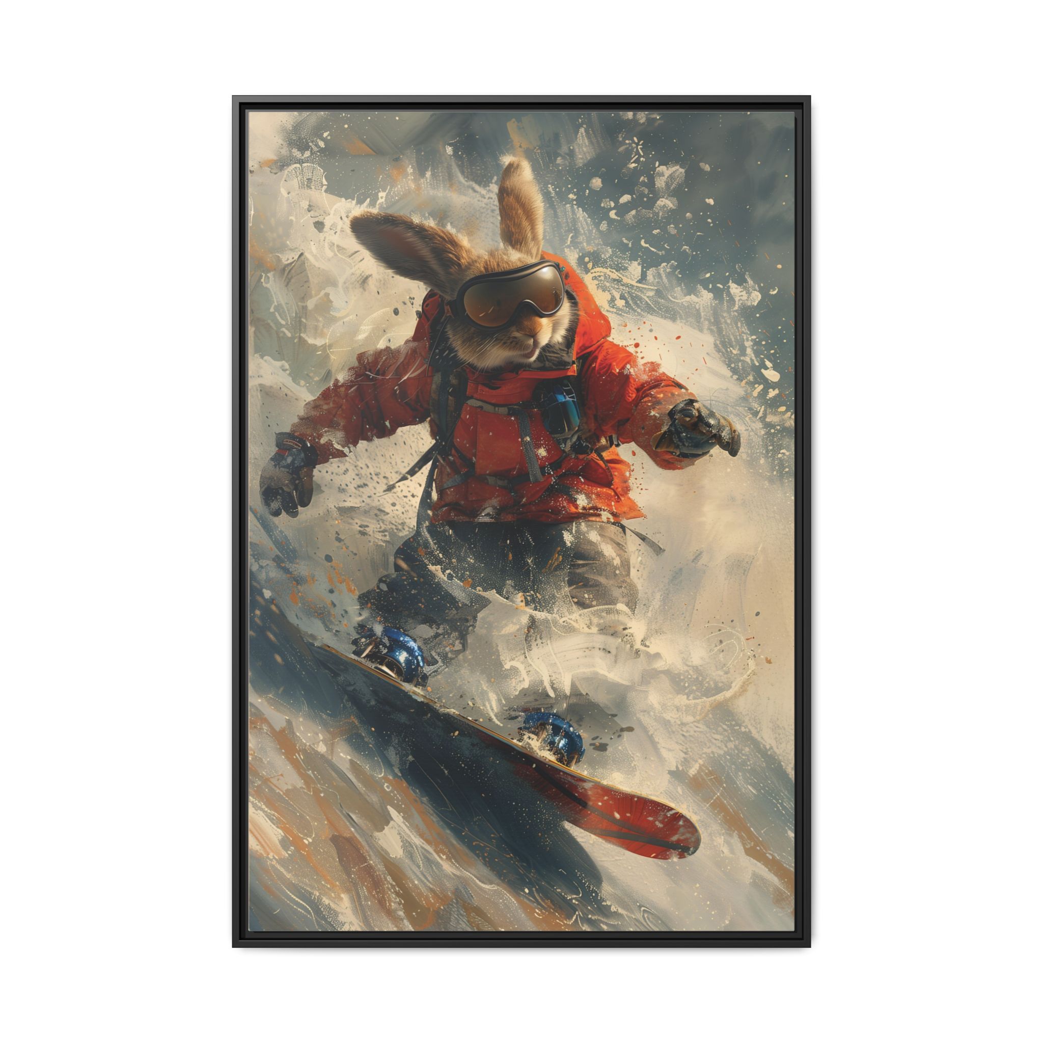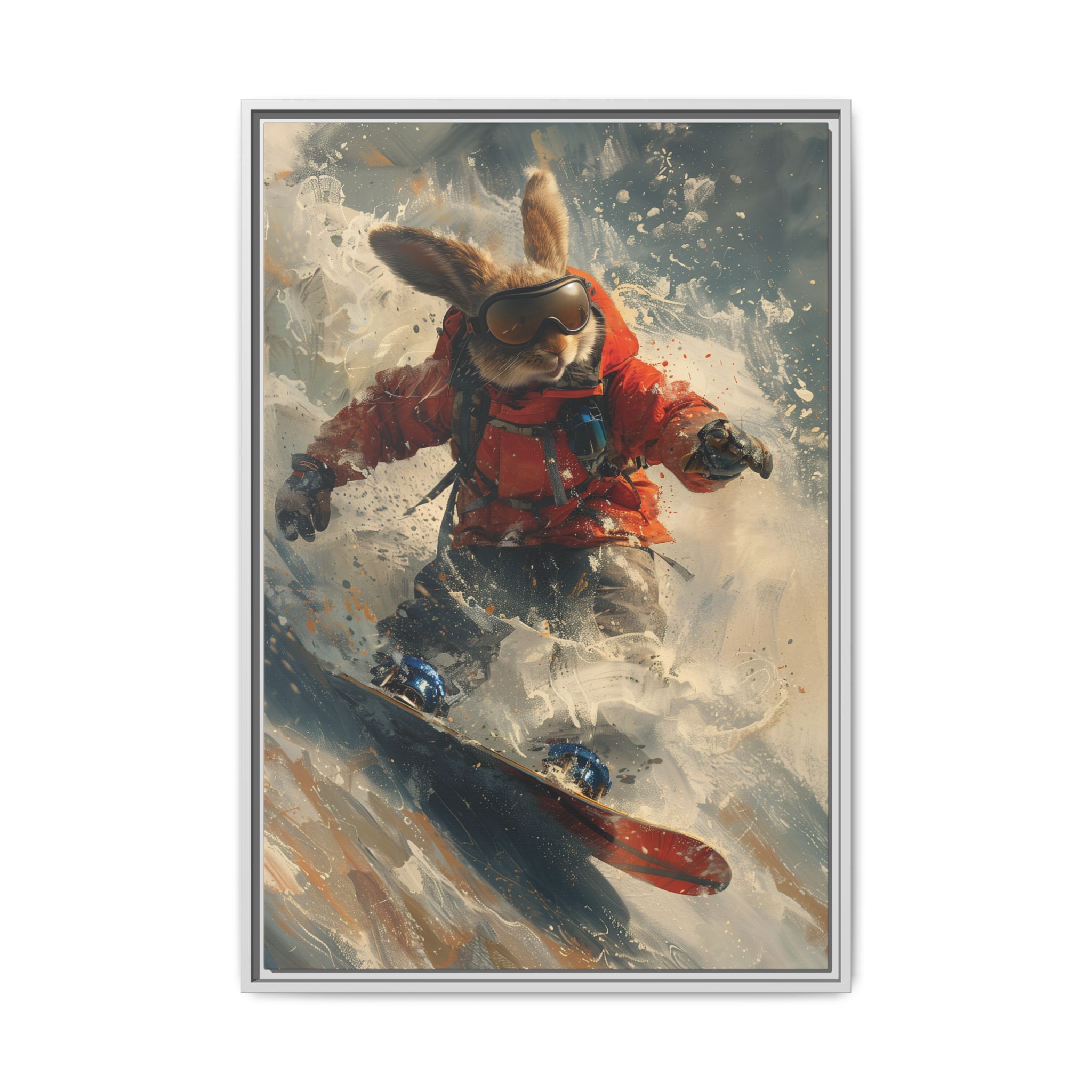 A fun poster of rabbit snowboarder in deep powder snow. Gives a nostalgic and adventurous vibe, perfect for winter sports enthusiasts and vintage decor lovers. Ideal for decorating homes during the winter season and great as a gift for skiers and snow sports fans.