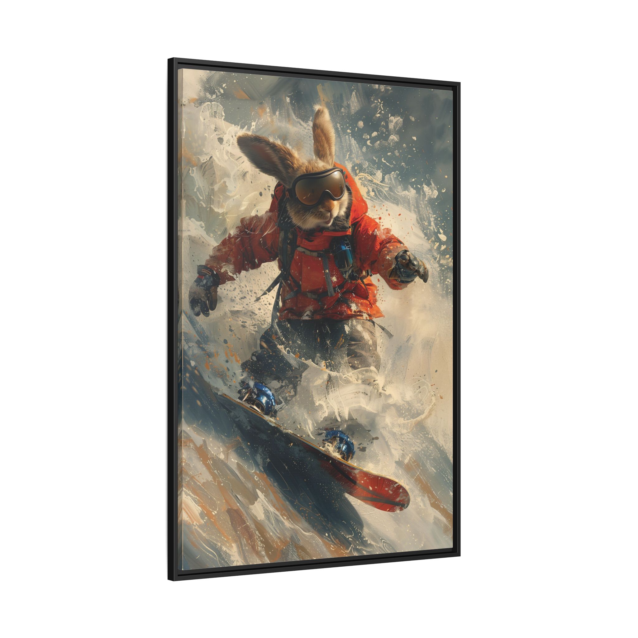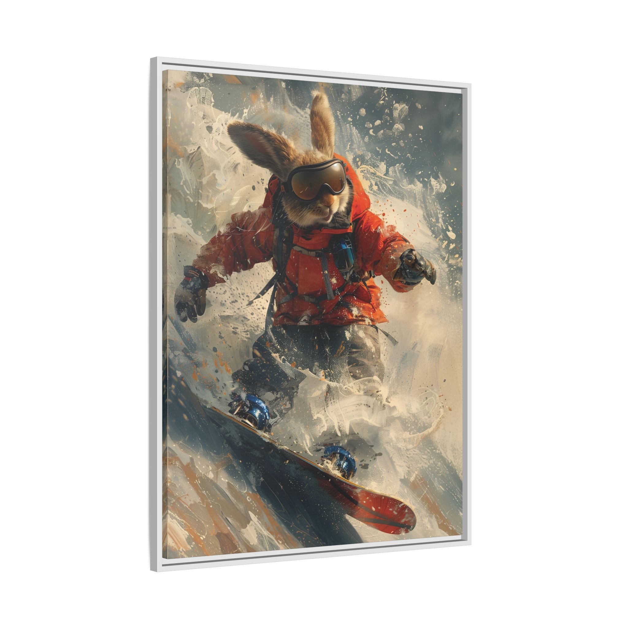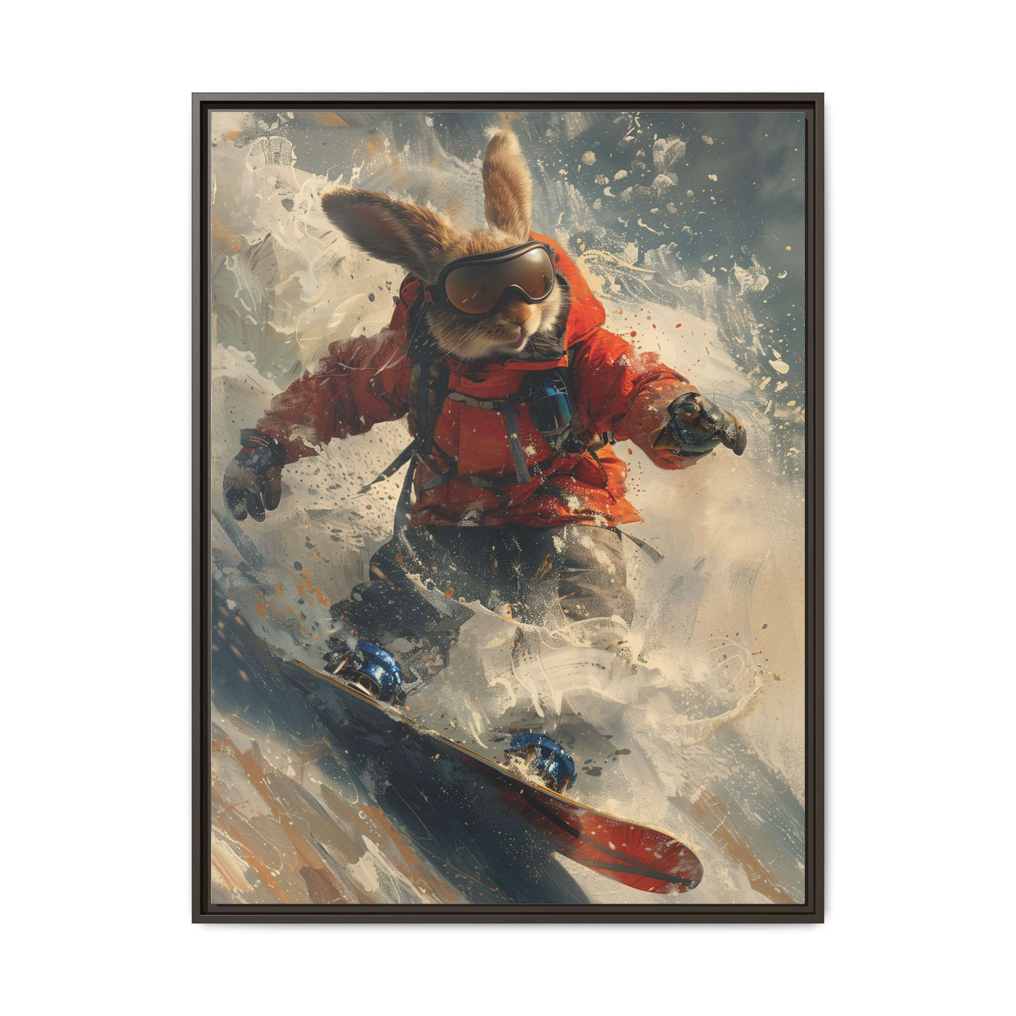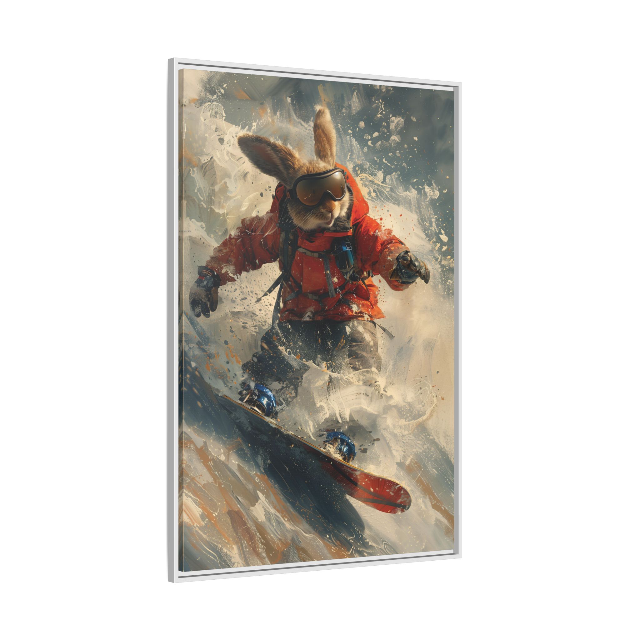 A fun poster of rabbit snowboarder in deep powder snow. Gives a nostalgic and adventurous vibe, perfect for winter sports enthusiasts and vintage decor lovers. Ideal for decorating homes during the winter season and great as a gift for skiers and snow sports fans.