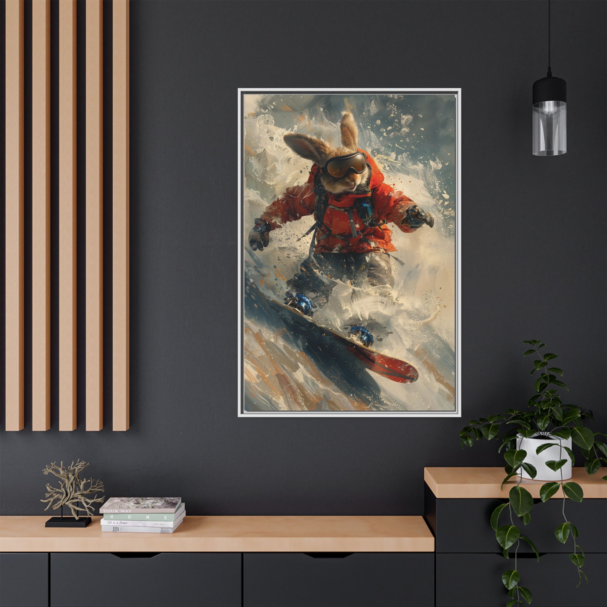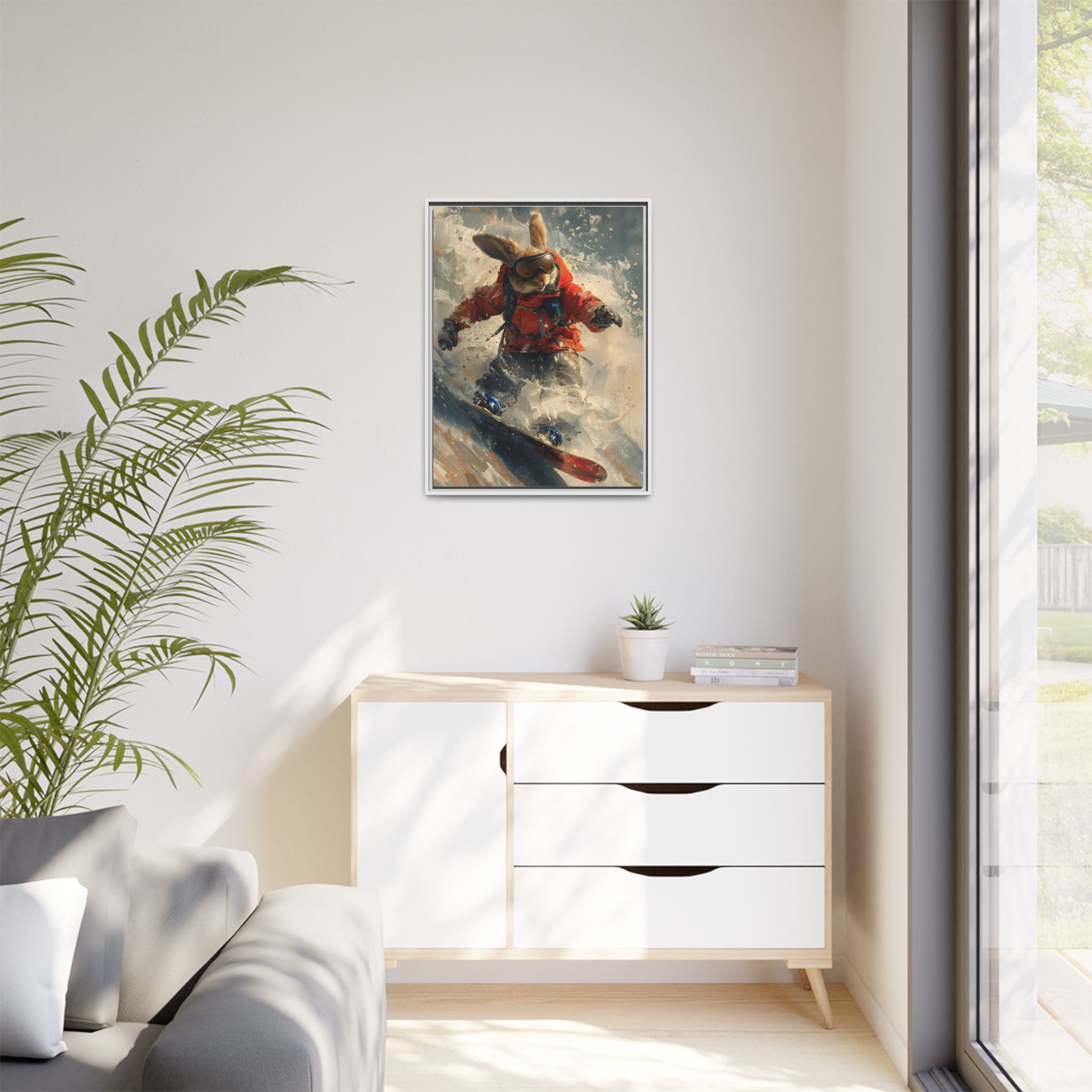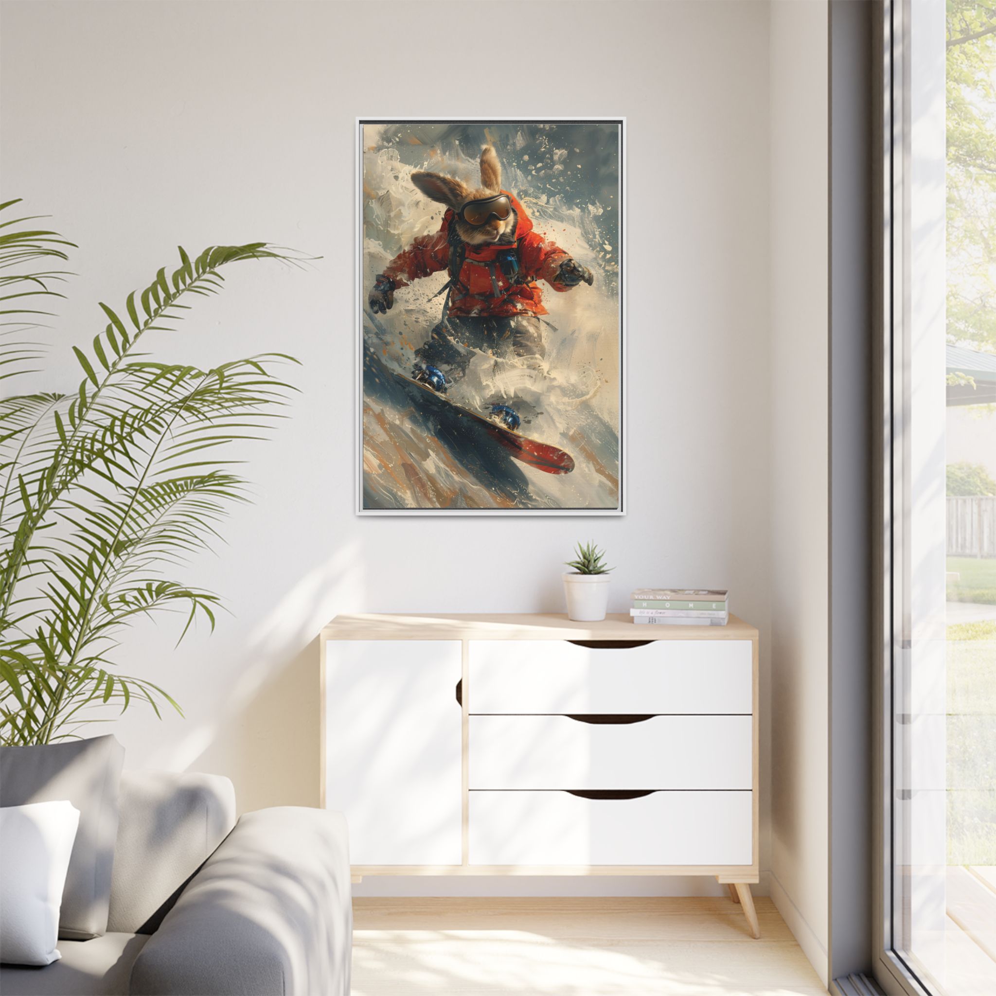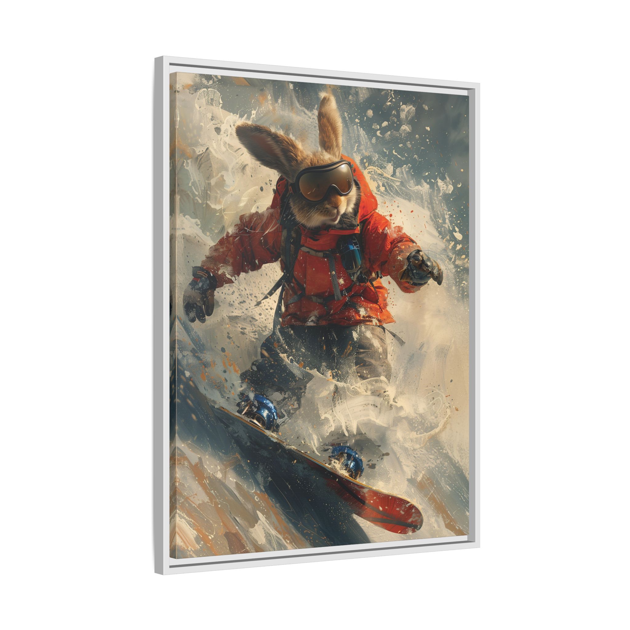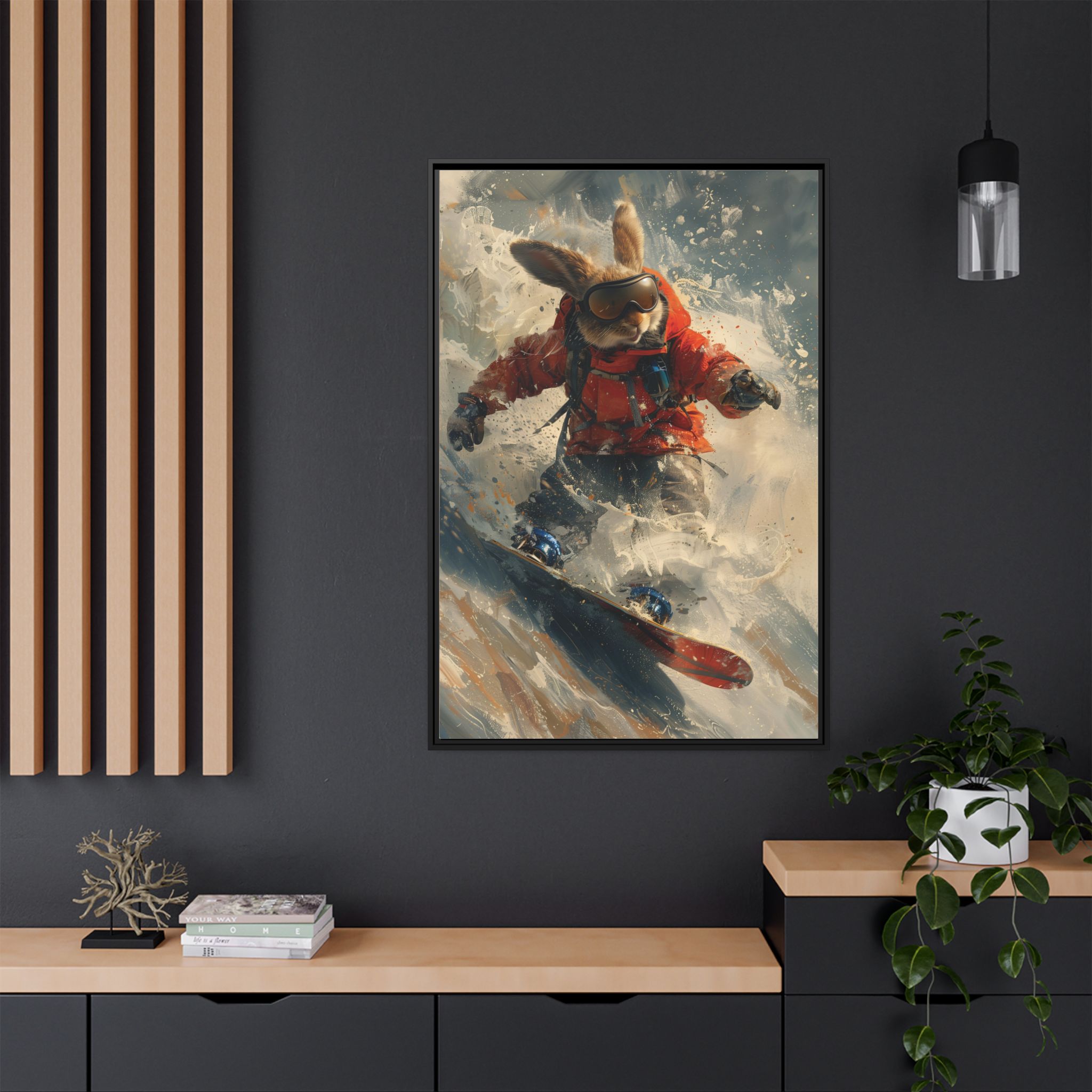 A fun poster of rabbit snowboarder in deep powder snow. Gives a nostalgic and adventurous vibe, perfect for winter sports enthusiasts and vintage decor lovers. Ideal for decorating homes during the winter season and great as a gift for skiers and snow sports fans.