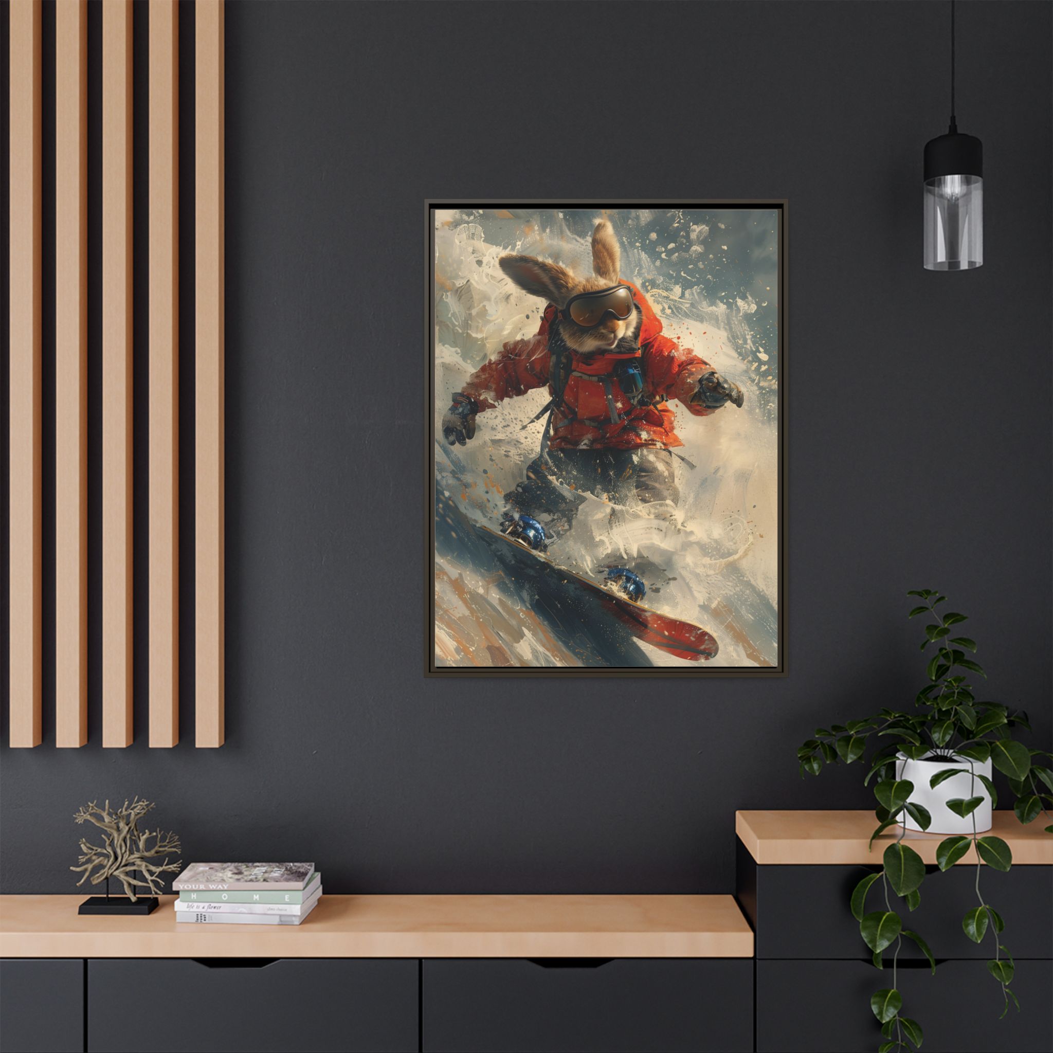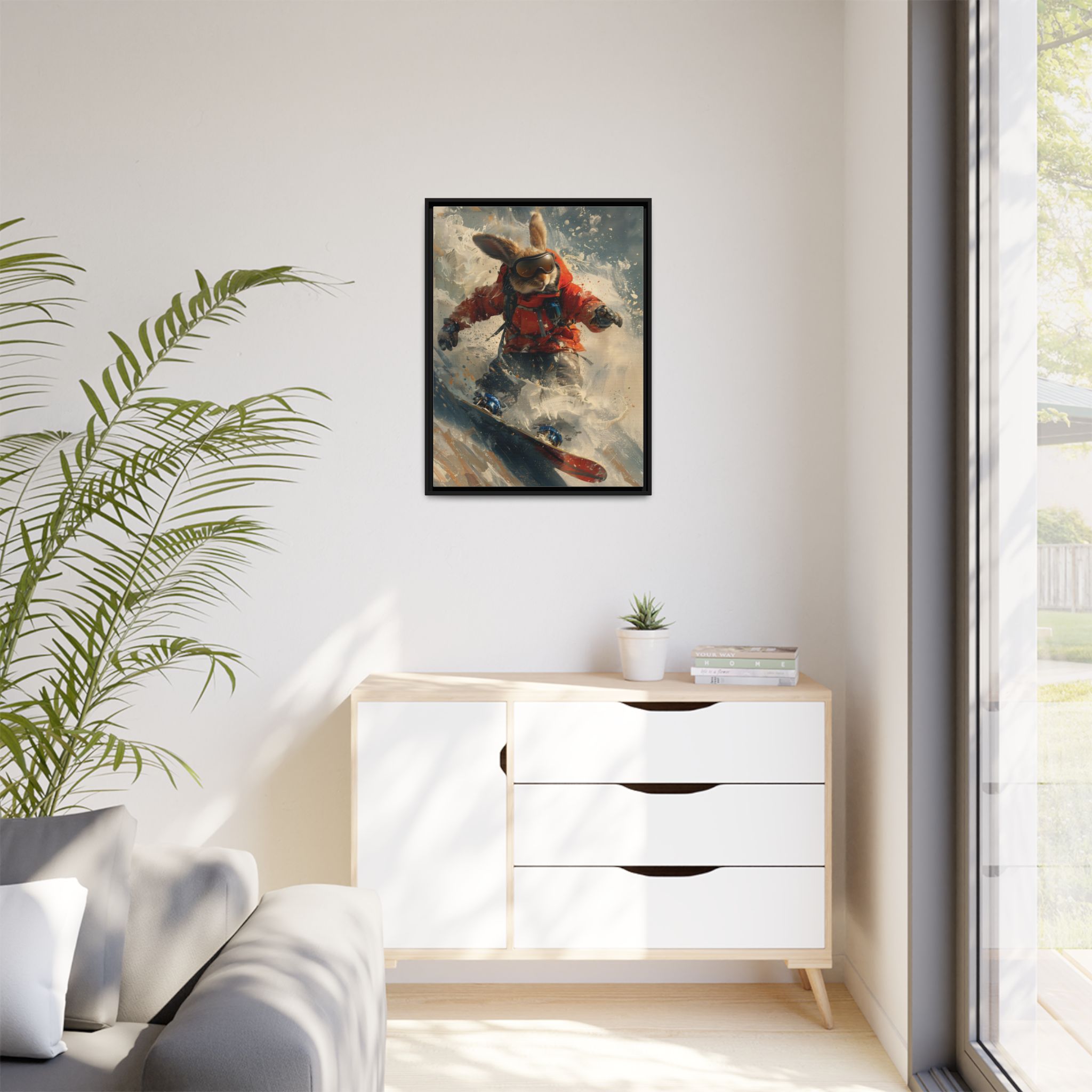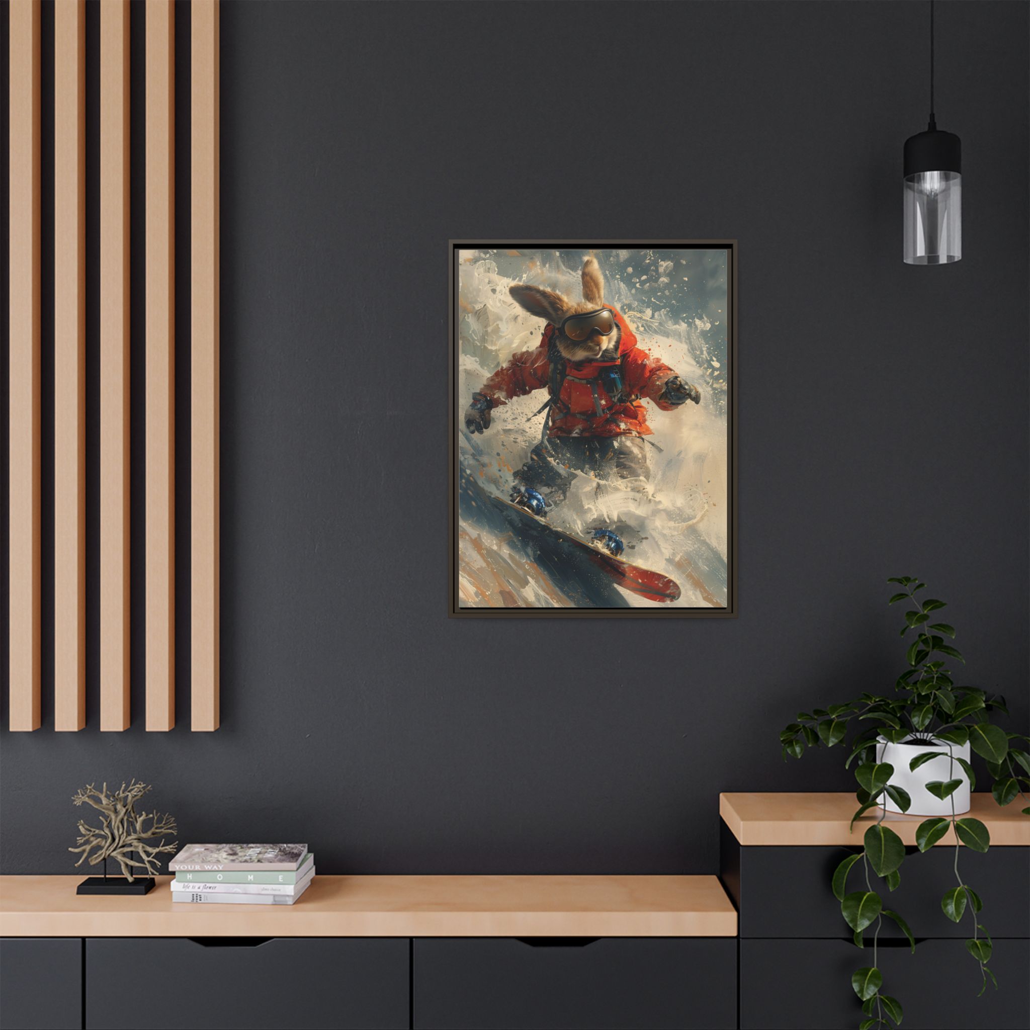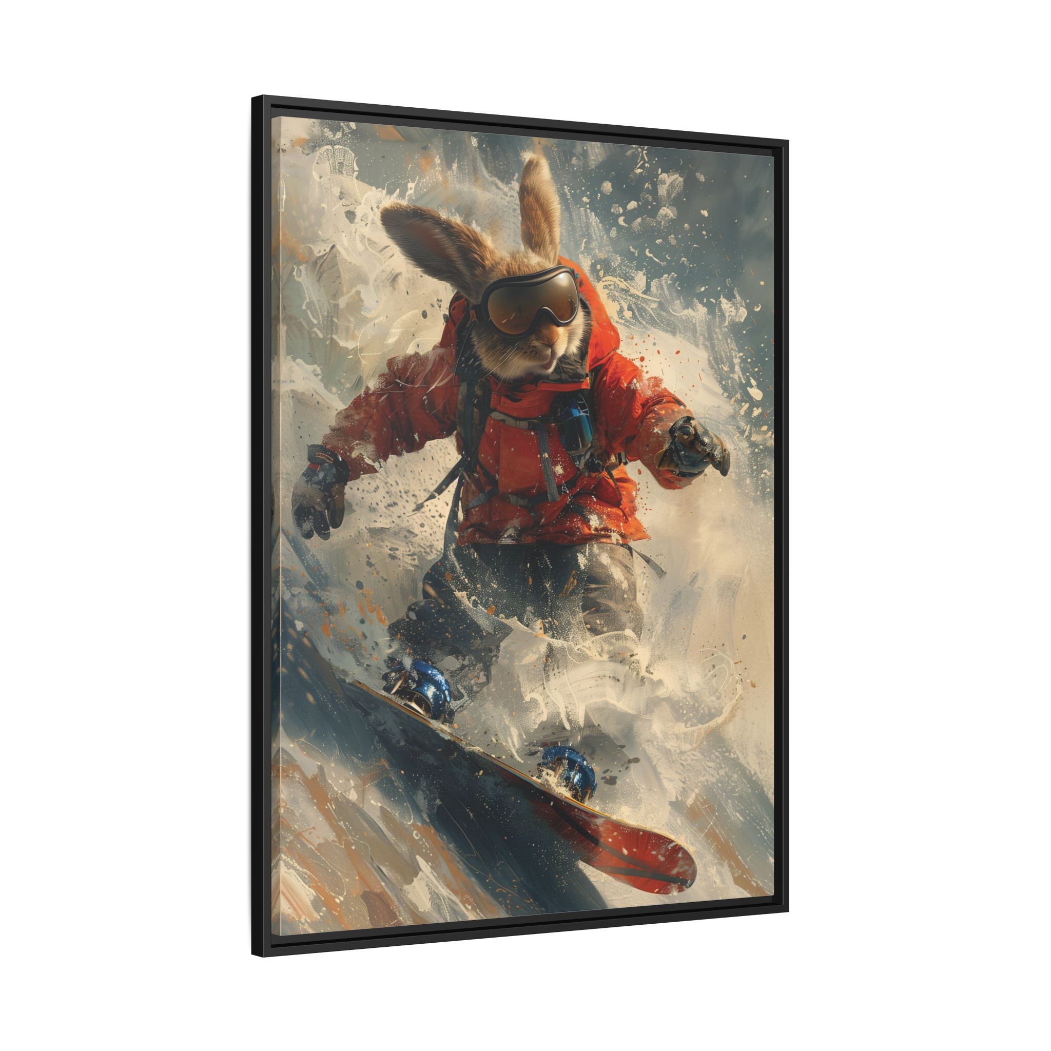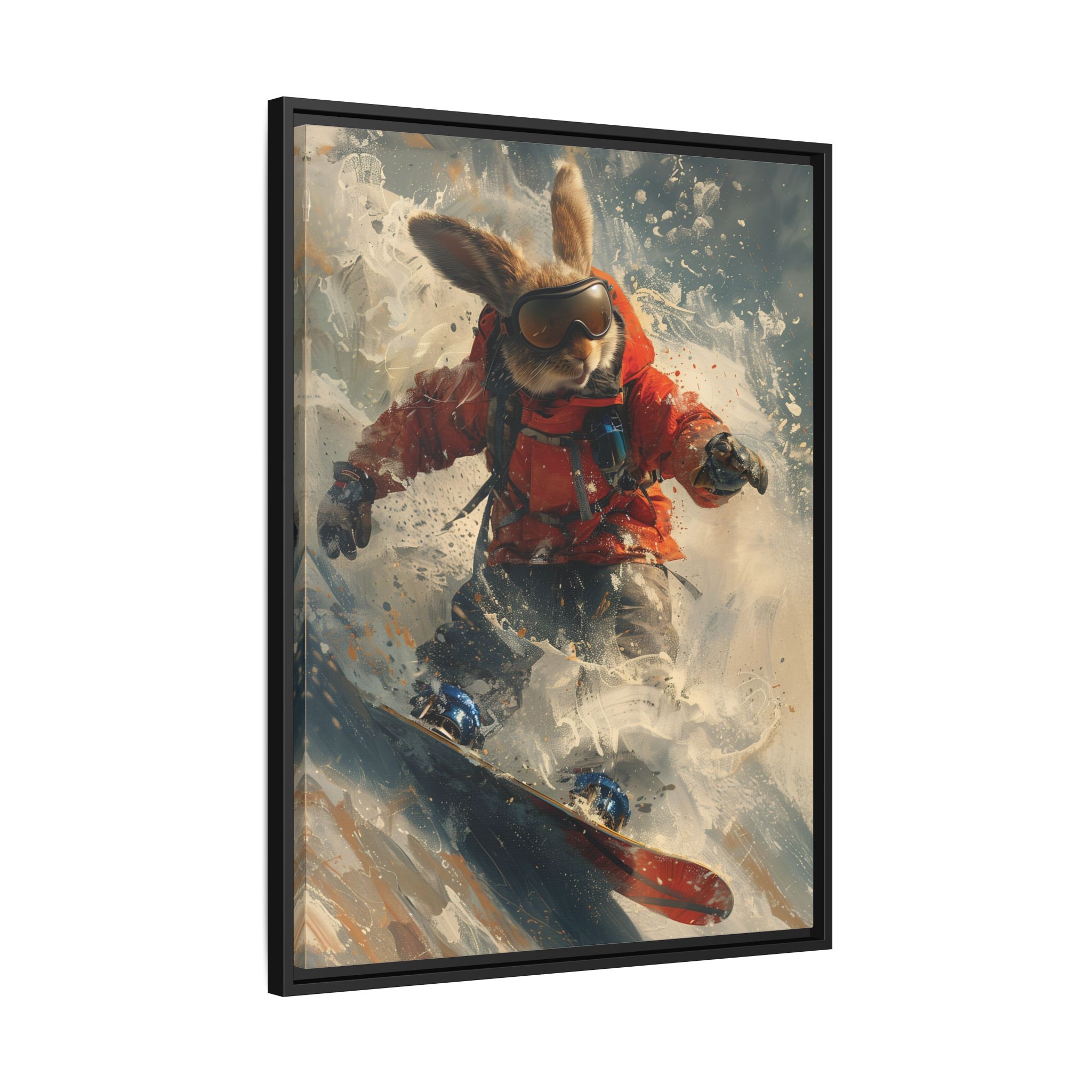 A fun poster of rabbit snowboarder in deep powder snow. Gives a nostalgic and adventurous vibe, perfect for winter sports enthusiasts and vintage decor lovers. Ideal for decorating homes during the winter season and great as a gift for skiers and snow sports fans.