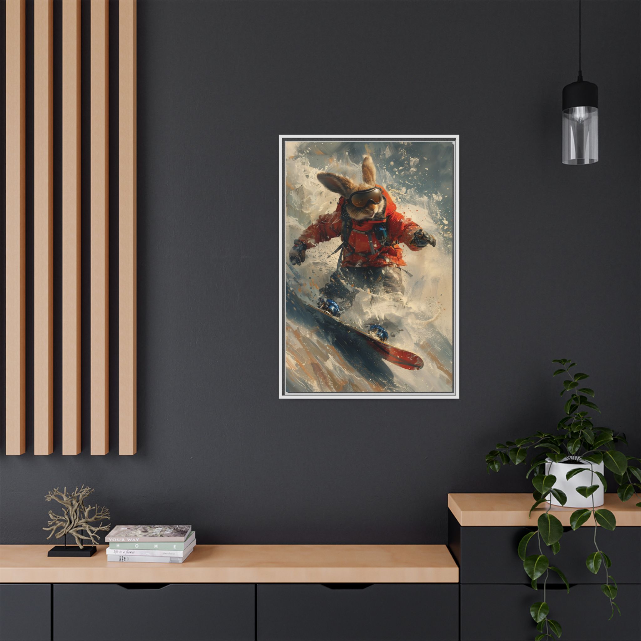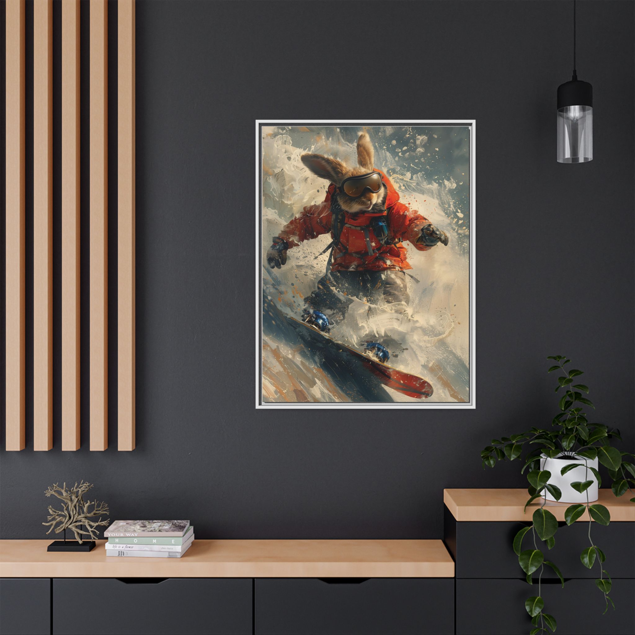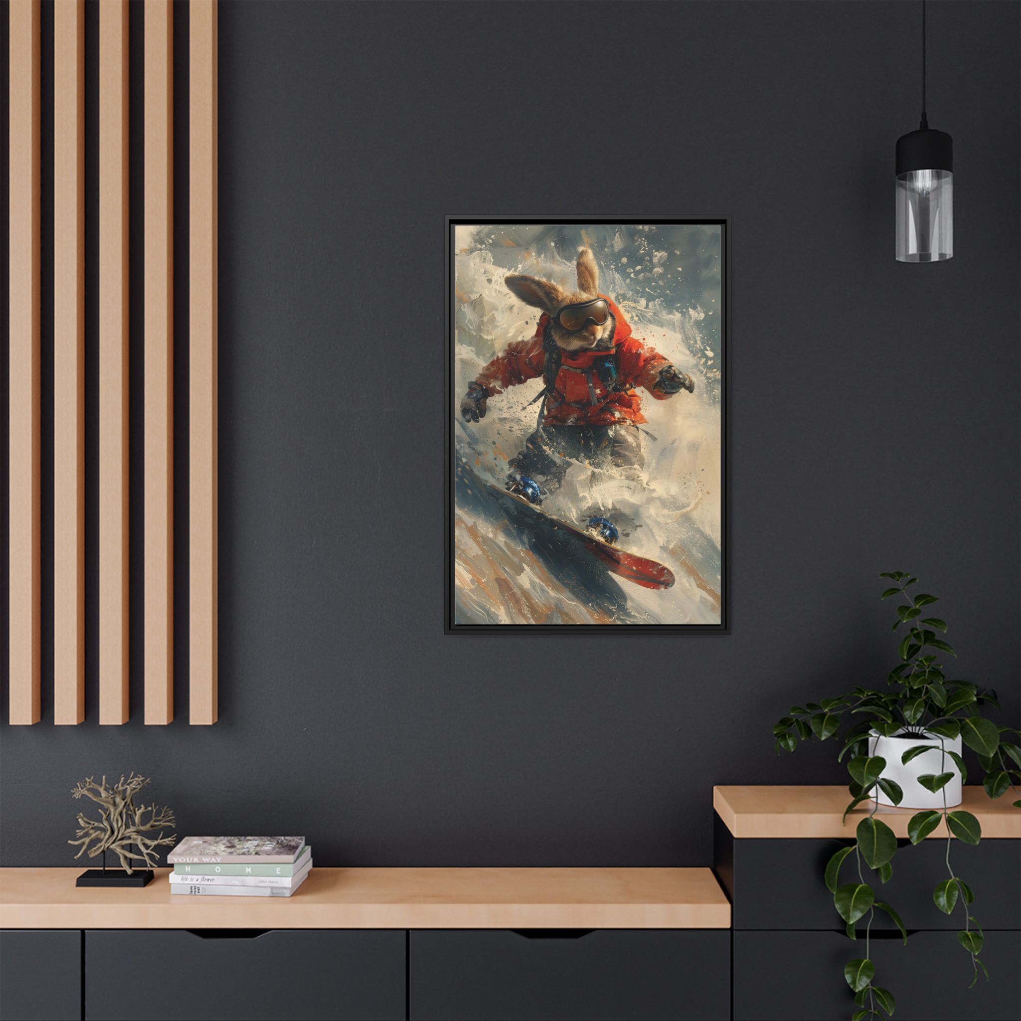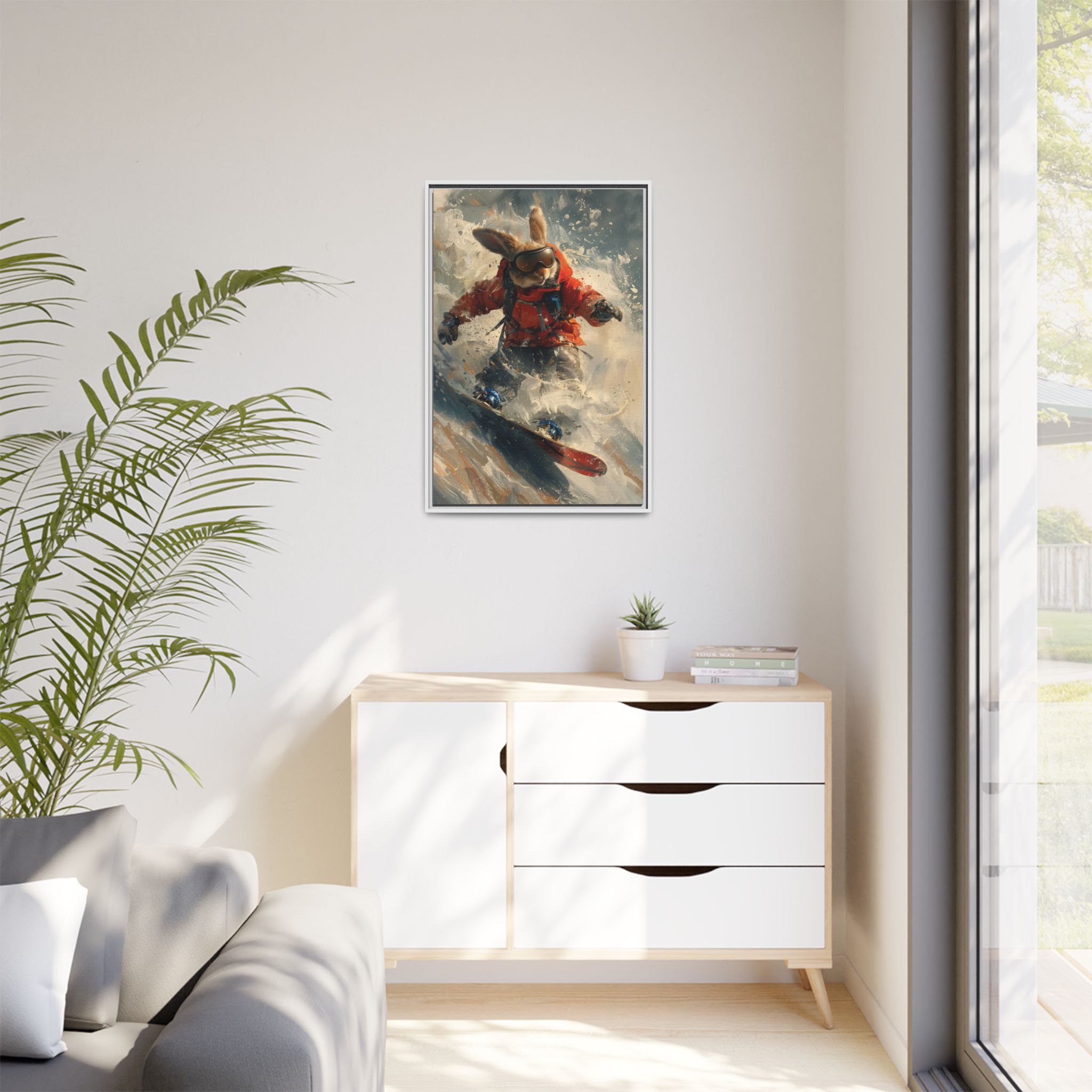 A fun poster of rabbit snowboarder in deep powder snow. Gives a nostalgic and adventurous vibe, perfect for winter sports enthusiasts and vintage decor lovers. Ideal for decorating homes during the winter season and great as a gift for skiers and snow sports fans.