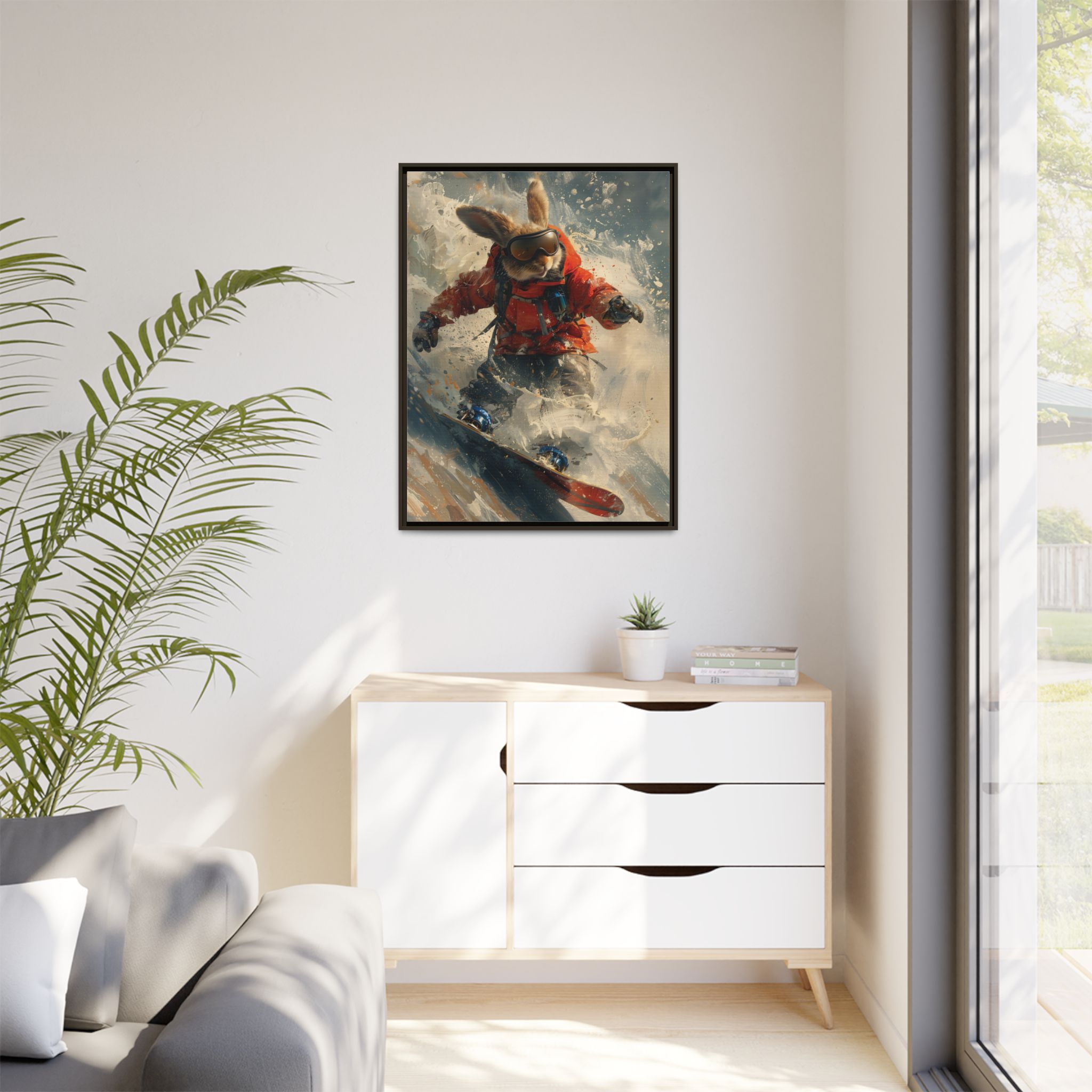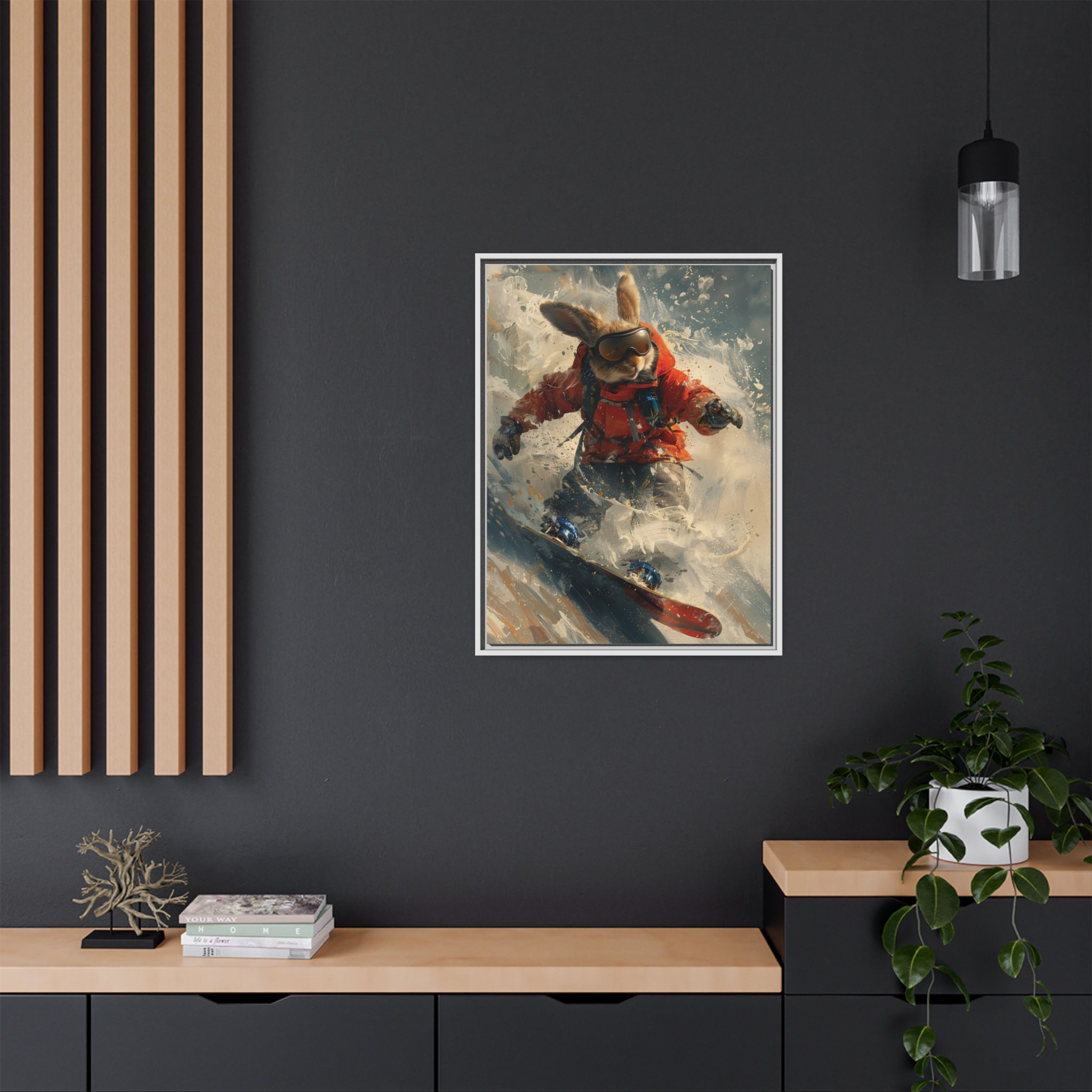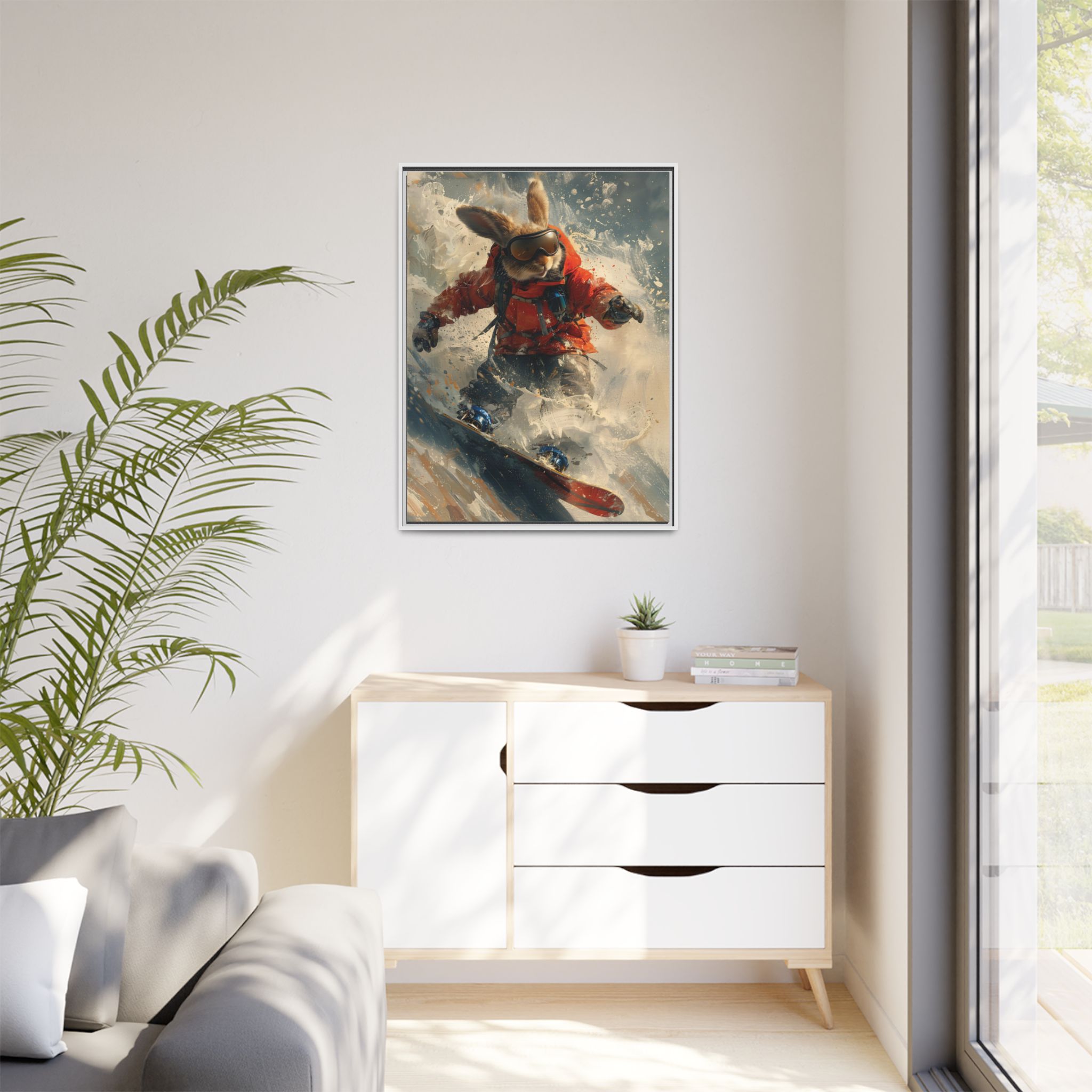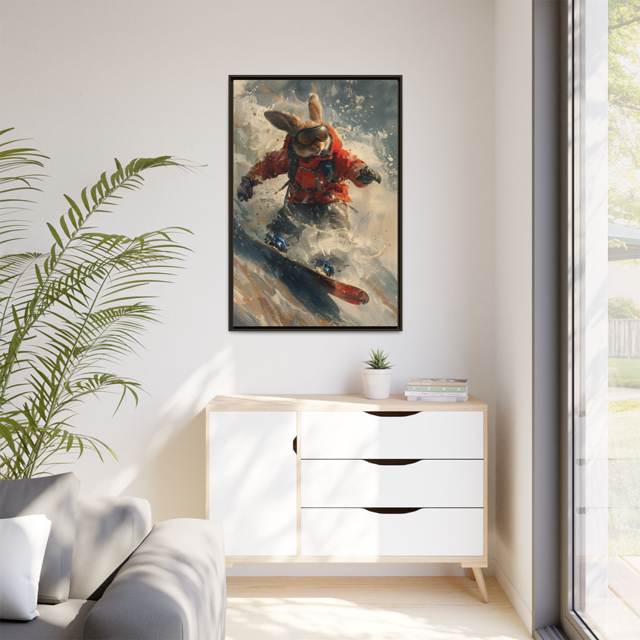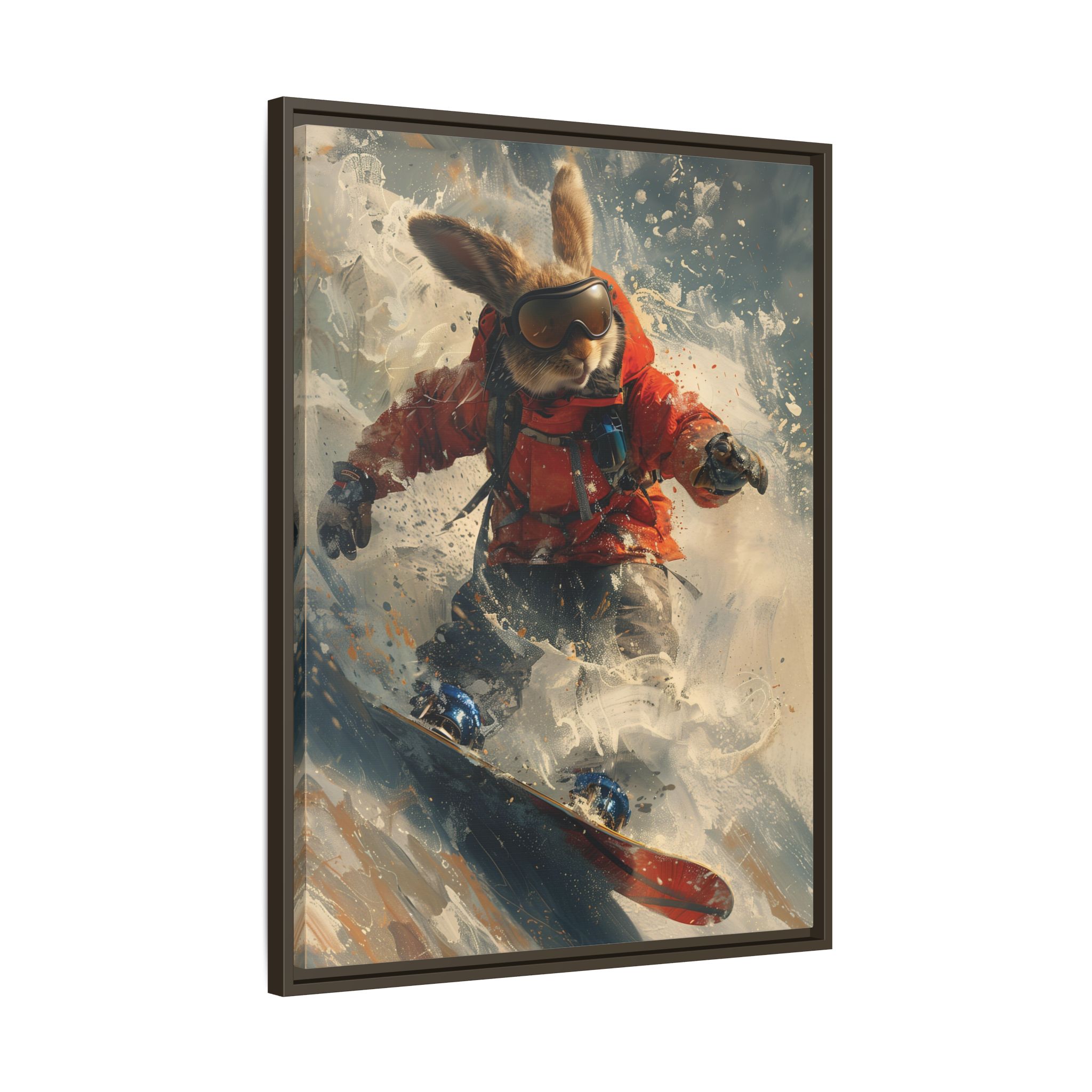 A fun poster of rabbit snowboarder in deep powder snow. Gives a nostalgic and adventurous vibe, perfect for winter sports enthusiasts and vintage decor lovers. Ideal for decorating homes during the winter season and great as a gift for skiers and snow sports fans.