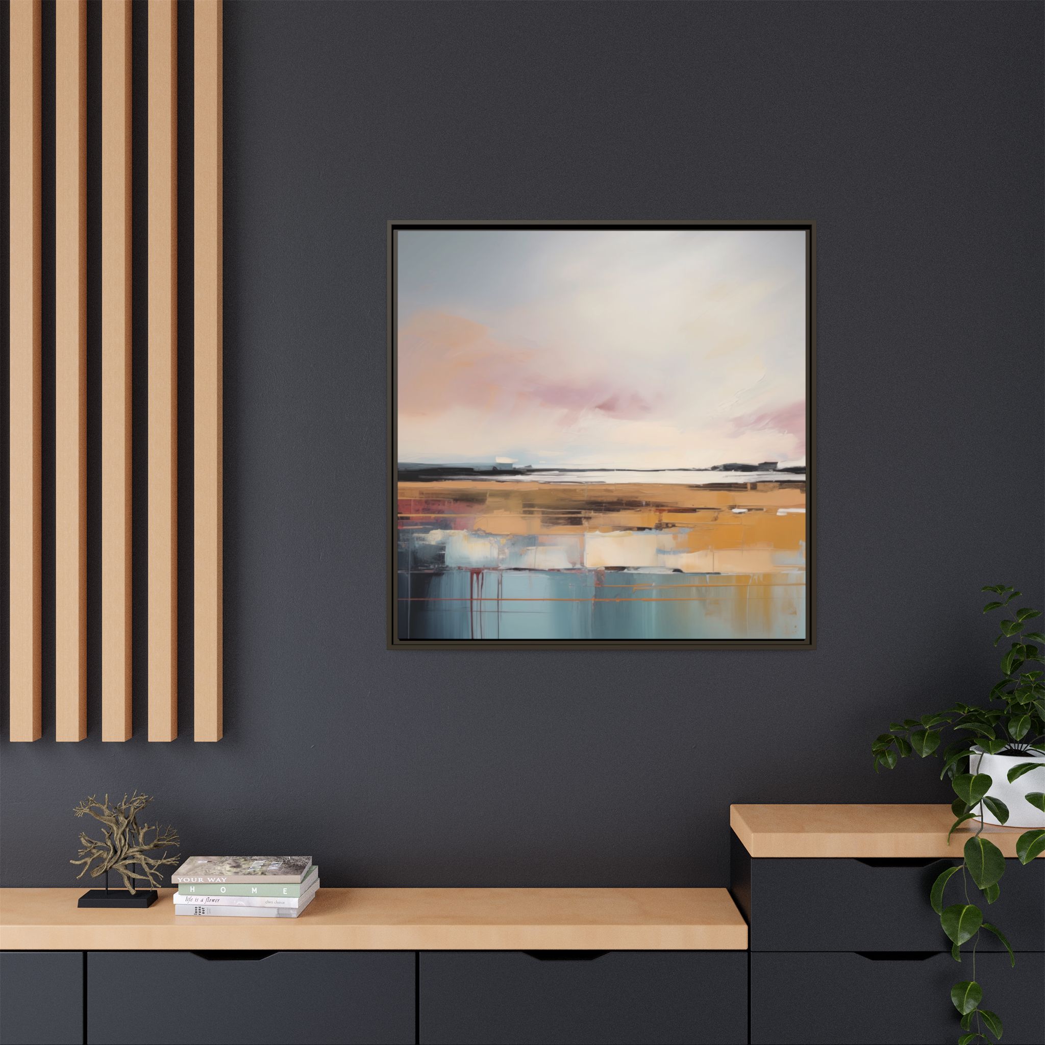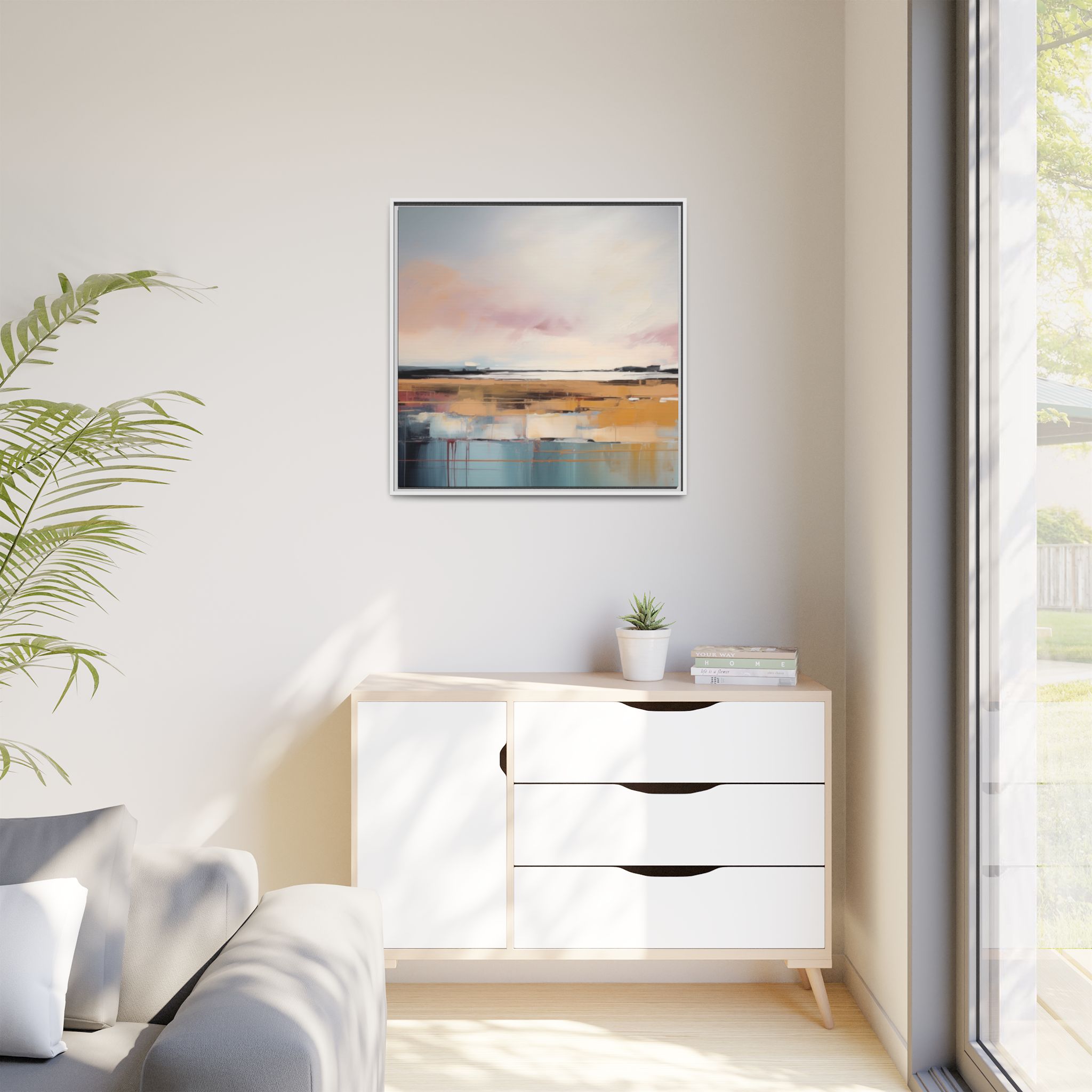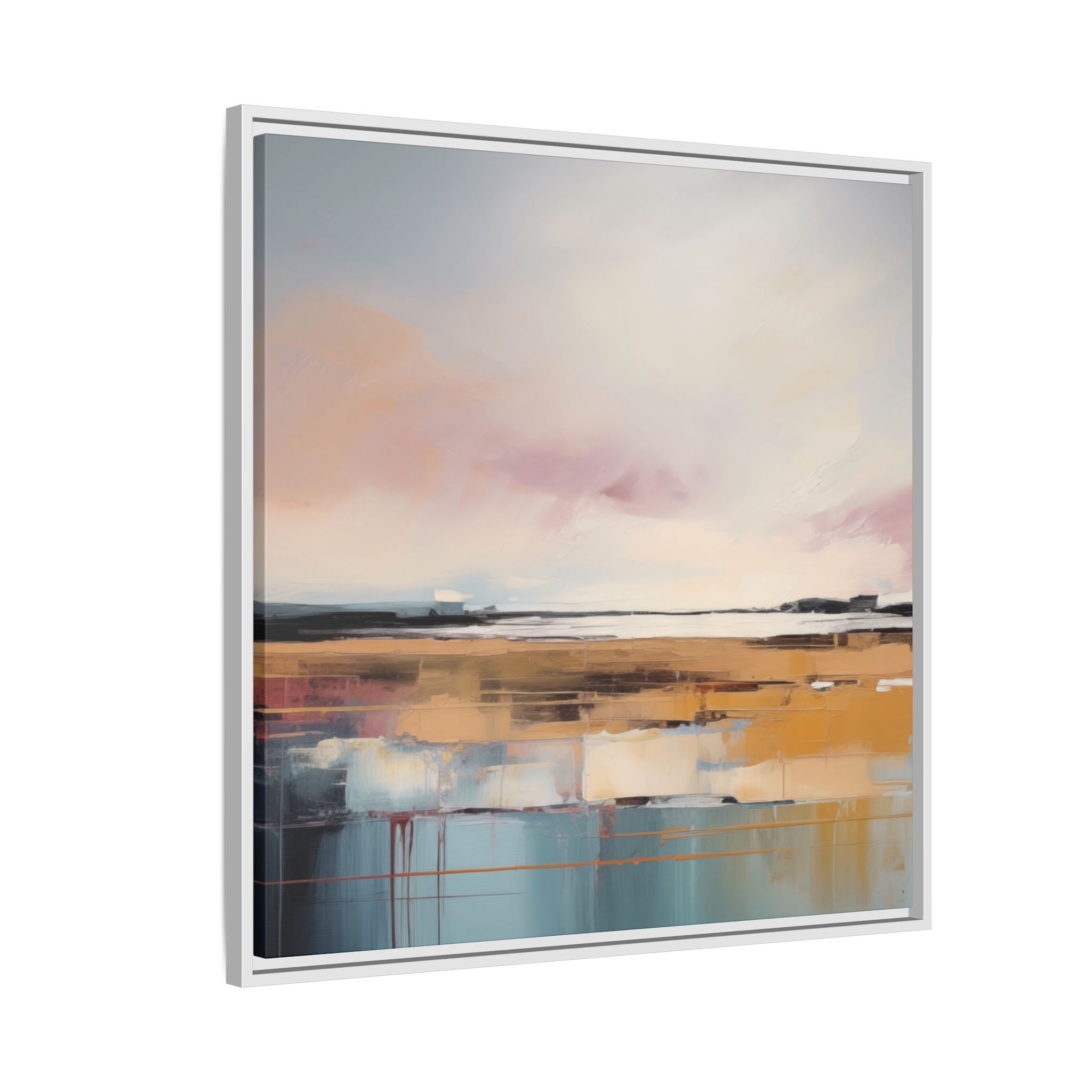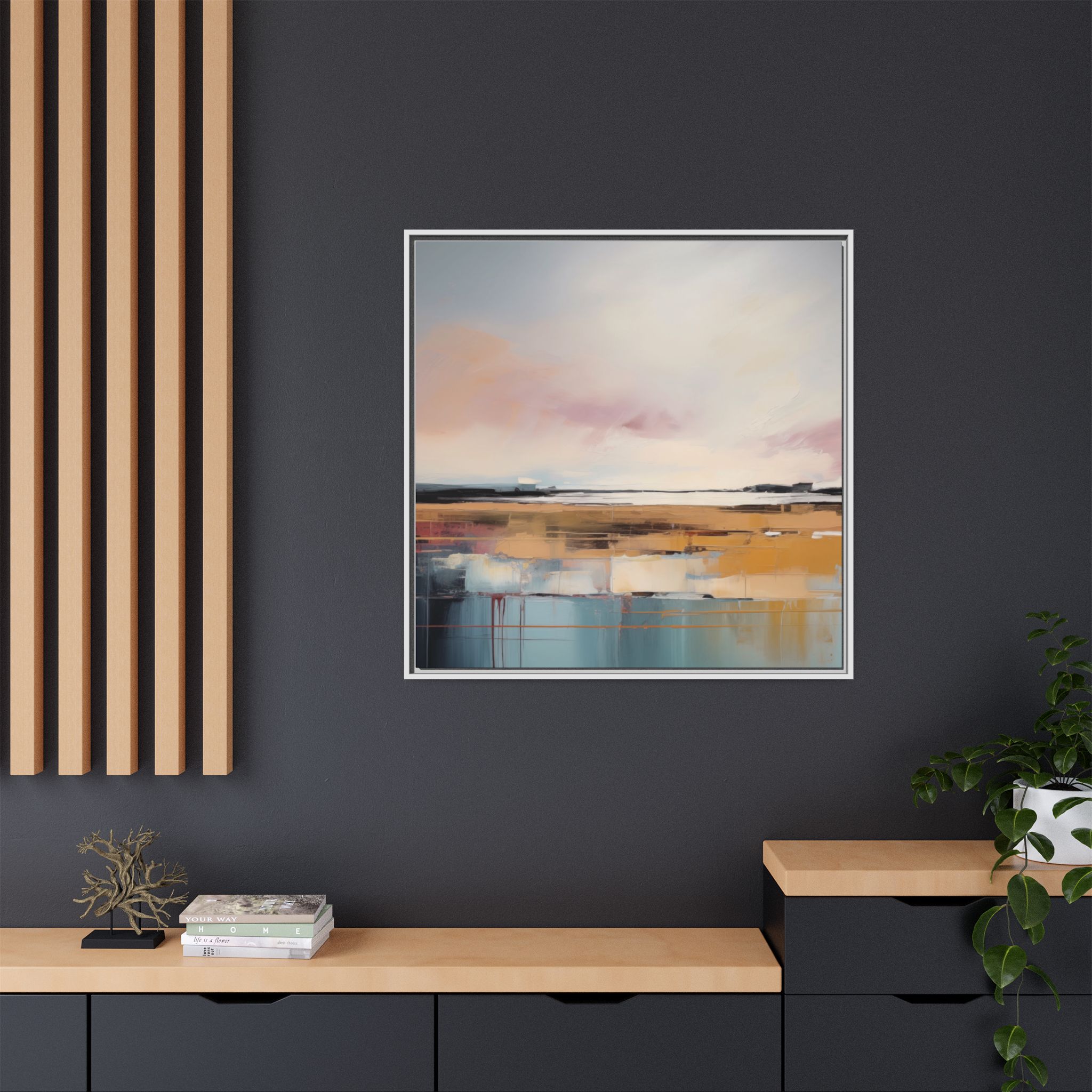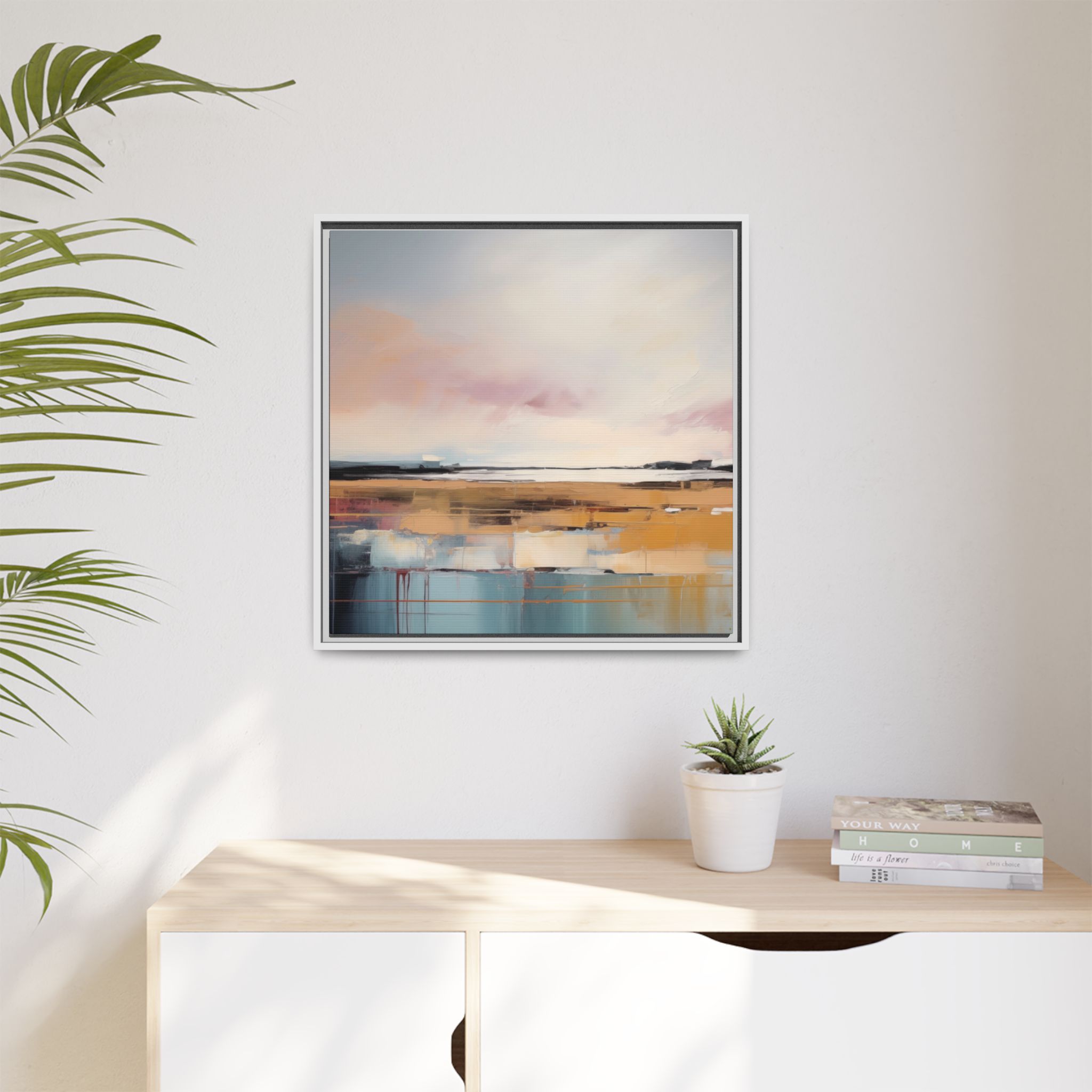 A minimalist art canvas featuring shapes and lines in a palette of pink, grey, navy blue, and white, creating a serene and modern abstract vibe. Perfect for adding a touch of sophistication to any room, this canvas is relevant for home decor enthusiasts, art lovers, and those looking to elevate their space. Ideal for gifting during birthdays, housewarmings, or as a special treat for yourself.