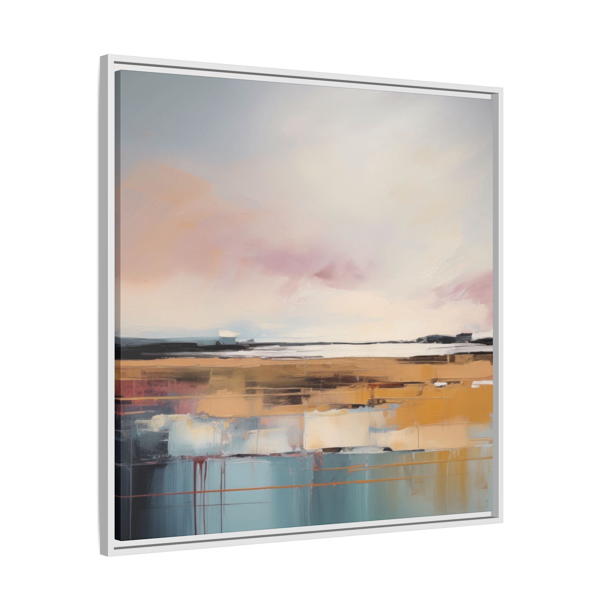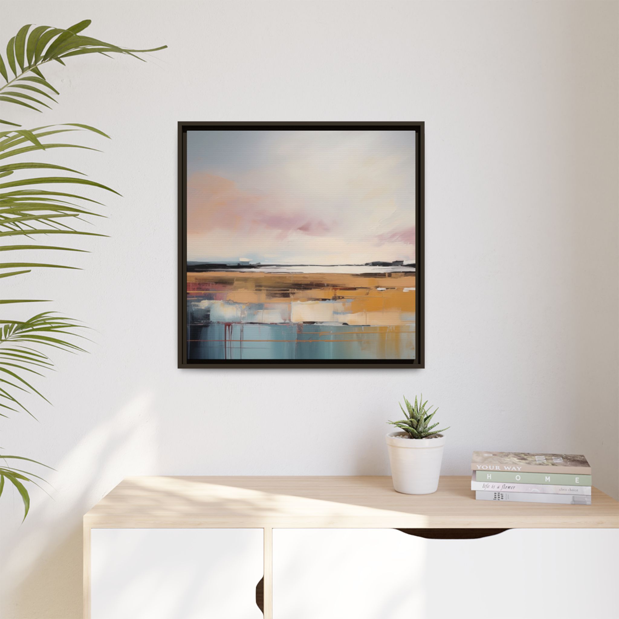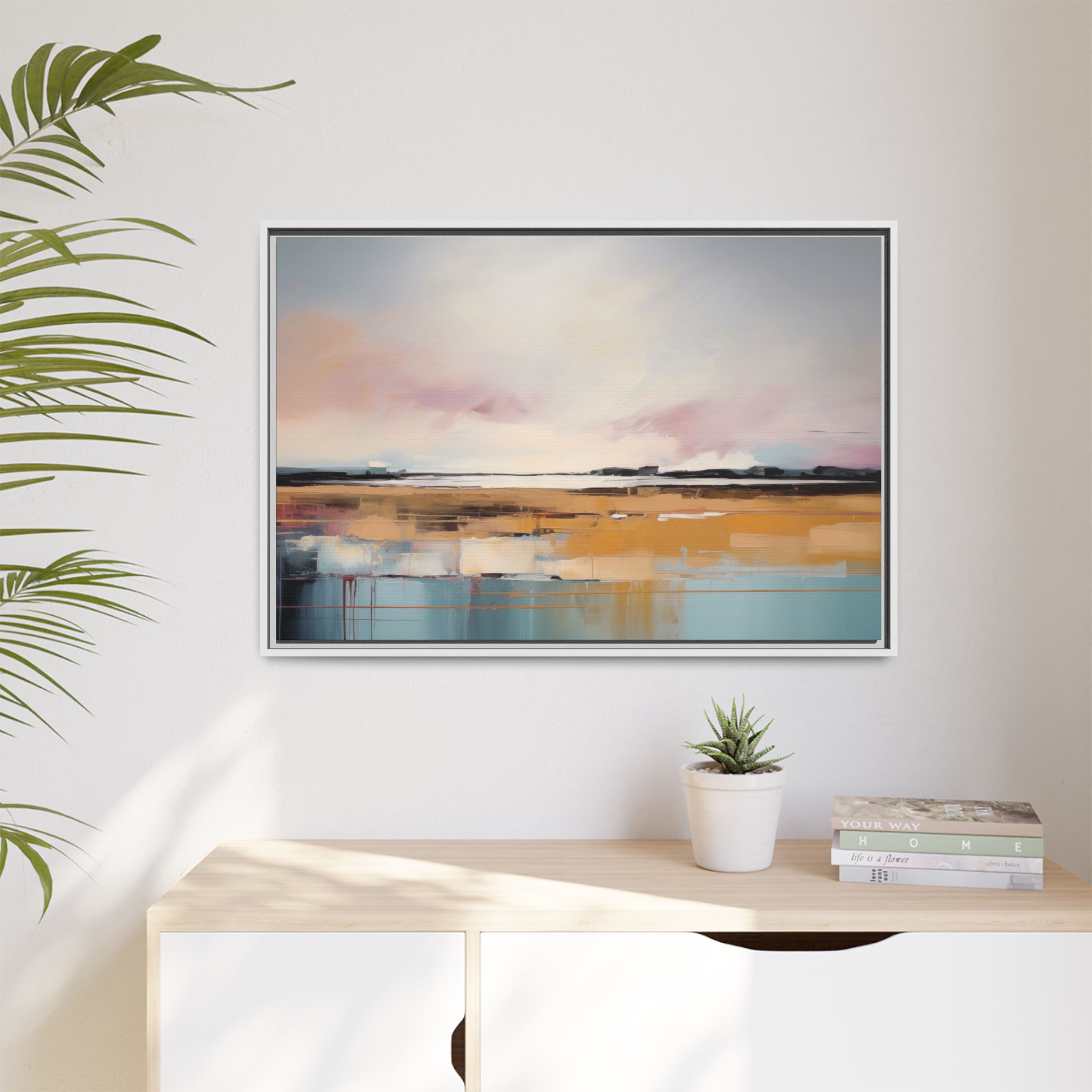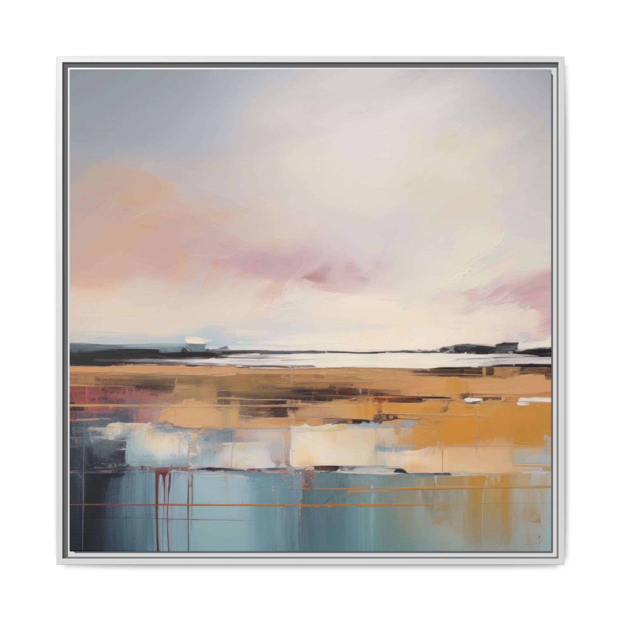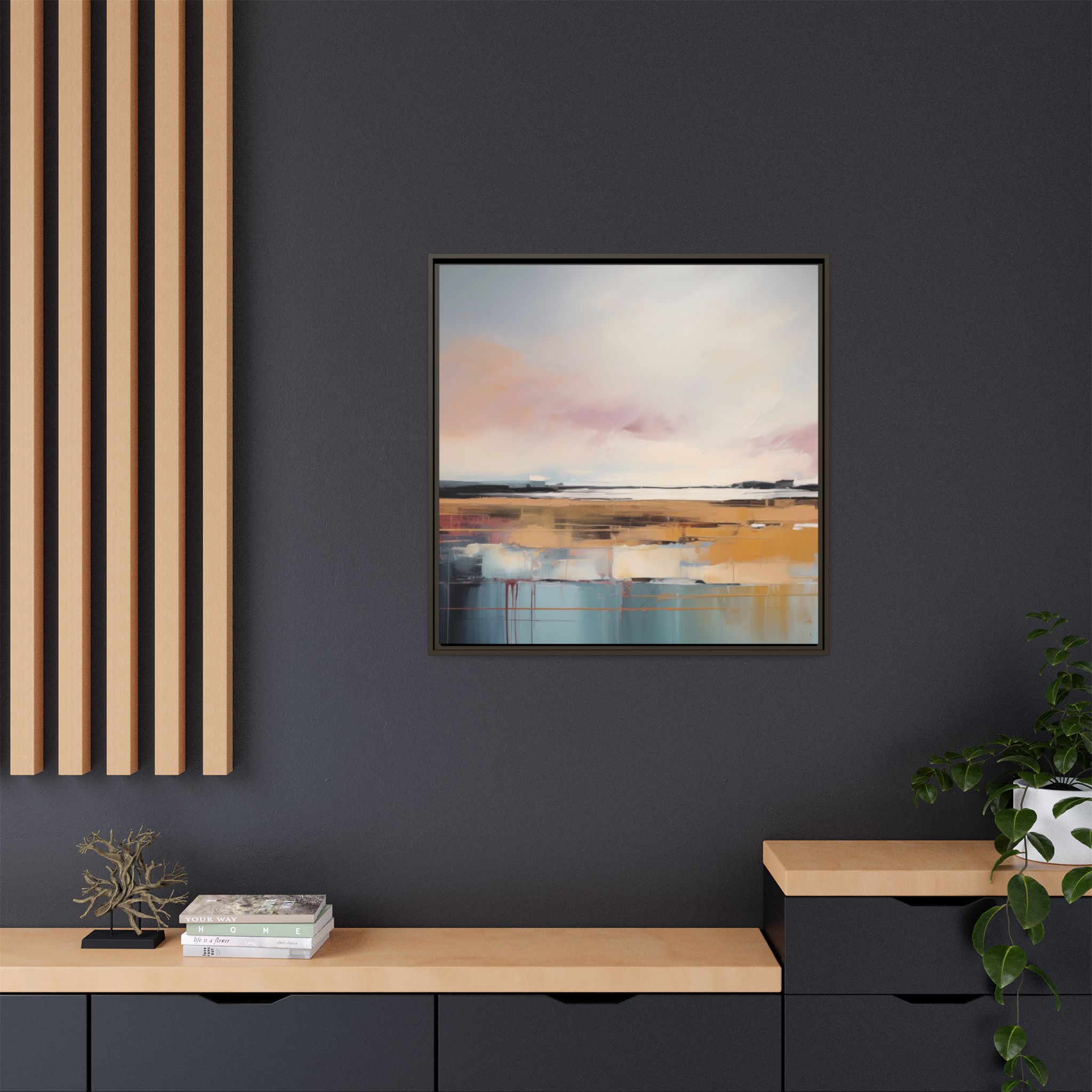 A minimalist art canvas featuring shapes and lines in a palette of pink, grey, navy blue, and white, creating a serene and modern abstract vibe. Perfect for adding a touch of sophistication to any room, this canvas is relevant for home decor enthusiasts, art lovers, and those looking to elevate their space. Ideal for gifting during birthdays, housewarmings, or as a special treat for yourself.