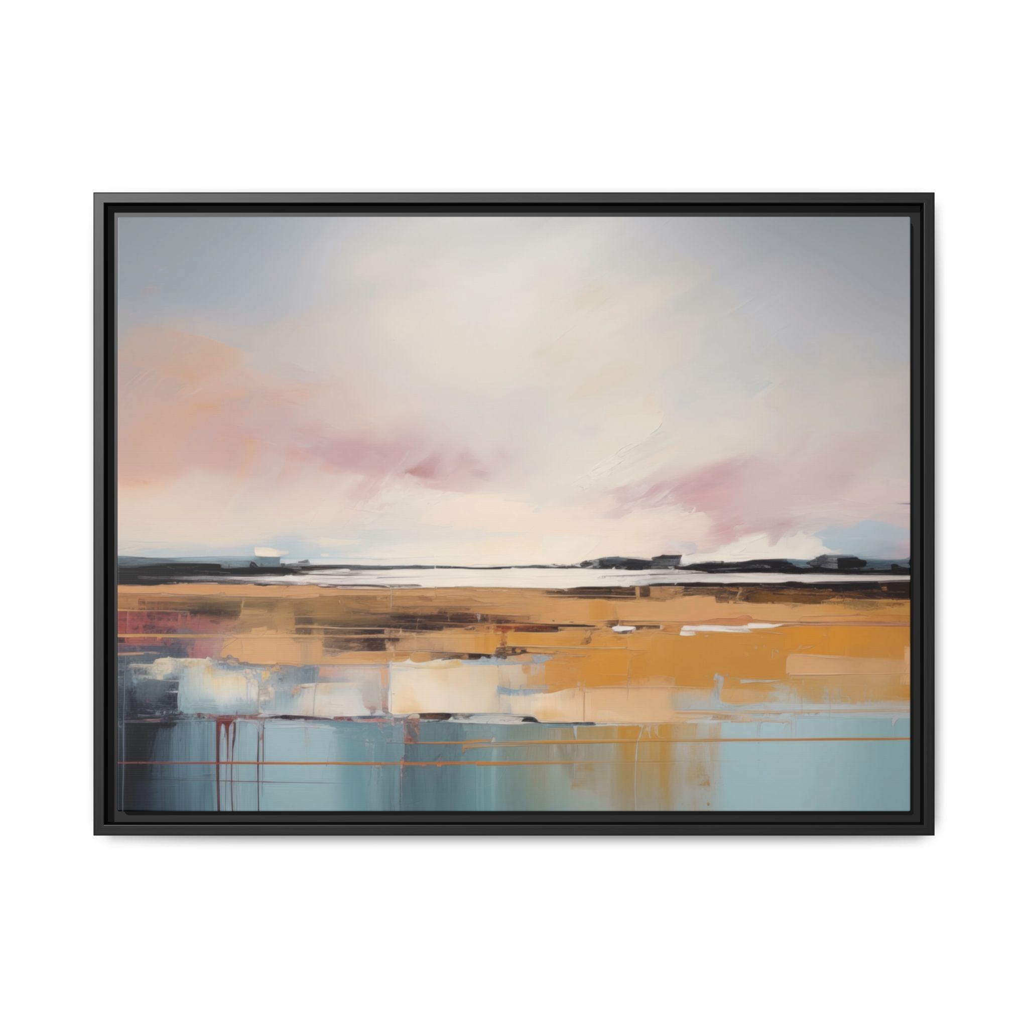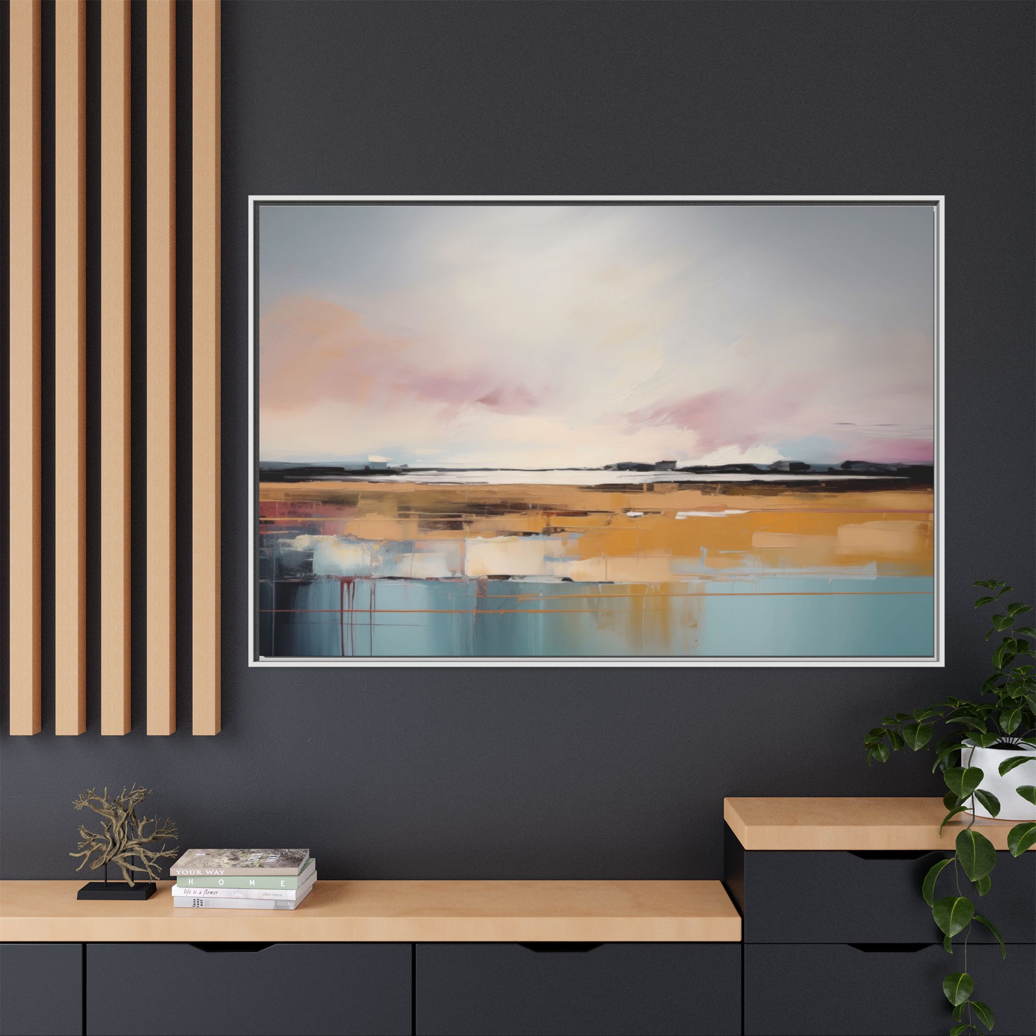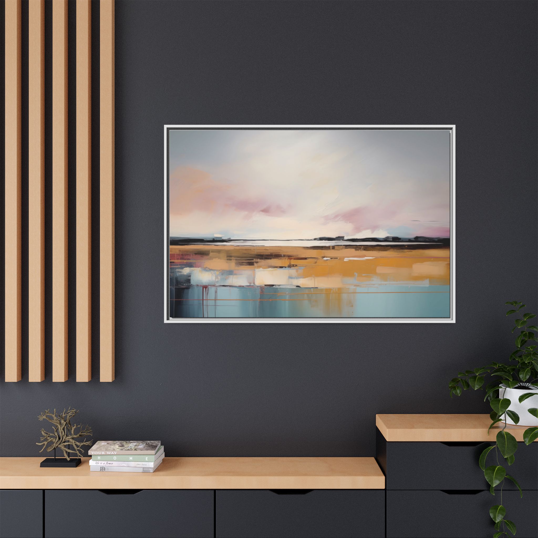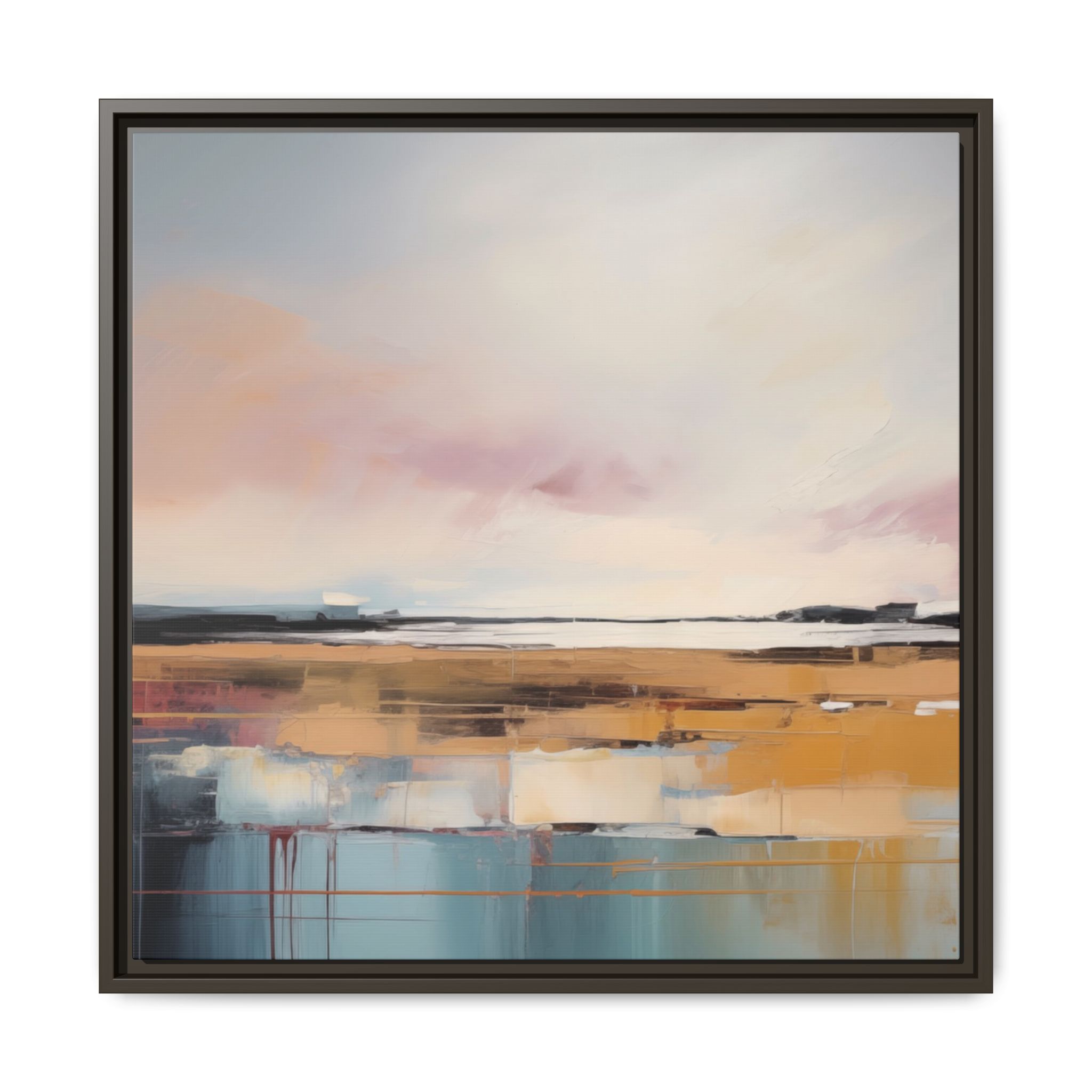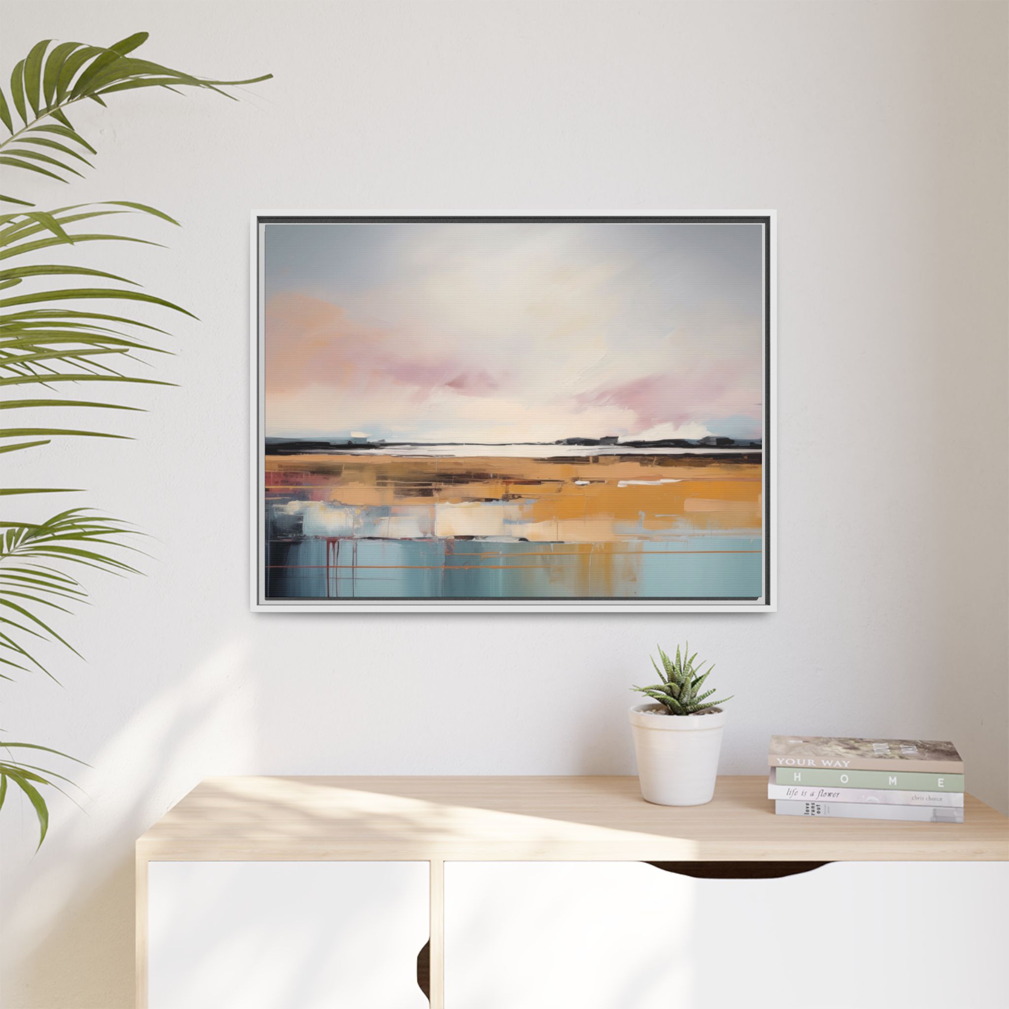 A minimalist art canvas featuring shapes and lines in a palette of pink, grey, navy blue, and white, creating a serene and modern abstract vibe. Perfect for adding a touch of sophistication to any room, this canvas is relevant for home decor enthusiasts, art lovers, and those looking to elevate their space. Ideal for gifting during birthdays, housewarmings, or as a special treat for yourself.