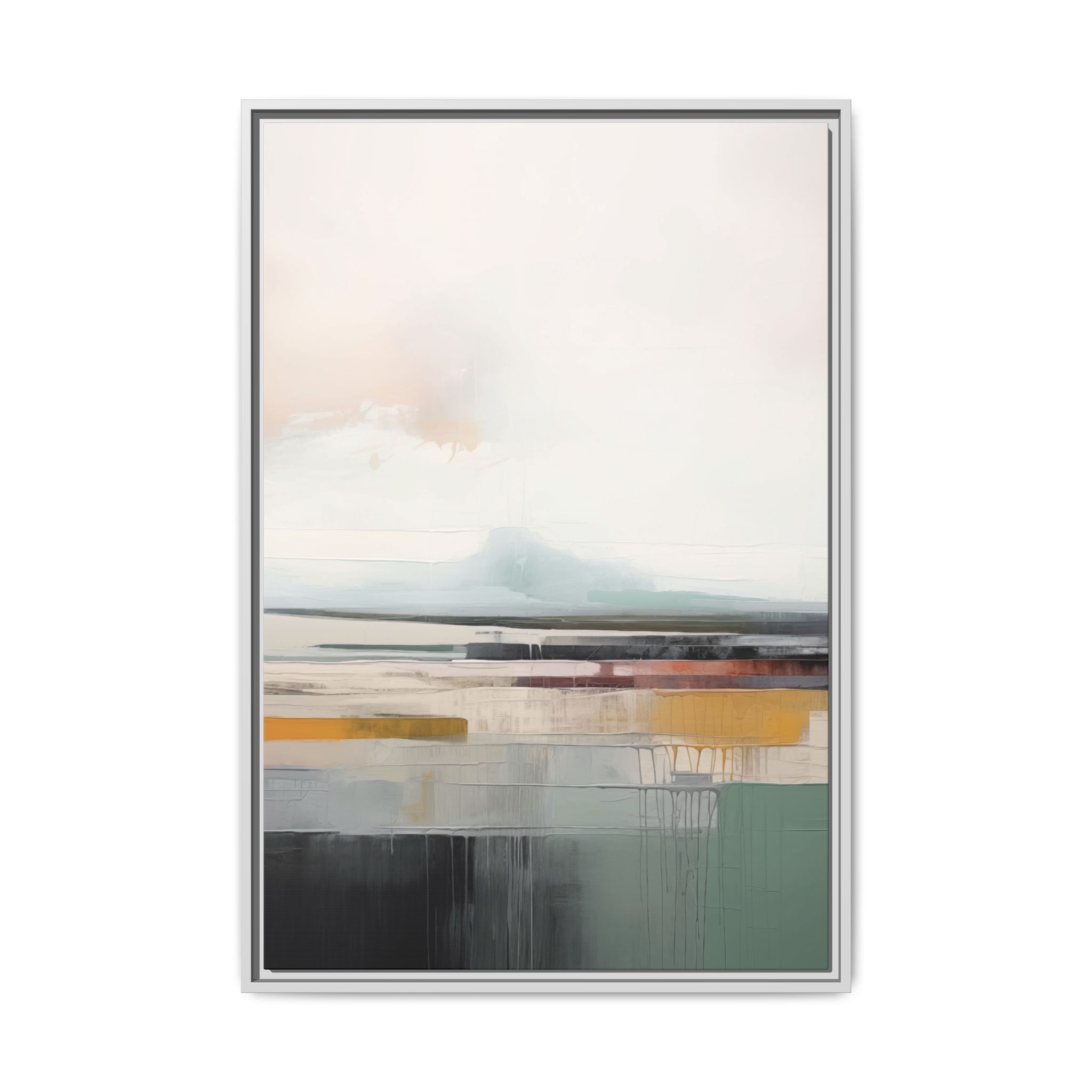 A minimalist art canvas featuring shapes and lines in a palette of pink, grey, green, and white, creating a serene and modern abstract vibe. Perfect for adding a touch of sophistication to any room, this canvas is relevant for home decor enthusiasts, art lovers, and those looking to elevate their space. Ideal for gifting during birthdays, housewarmings, or as a special treat for yourself.