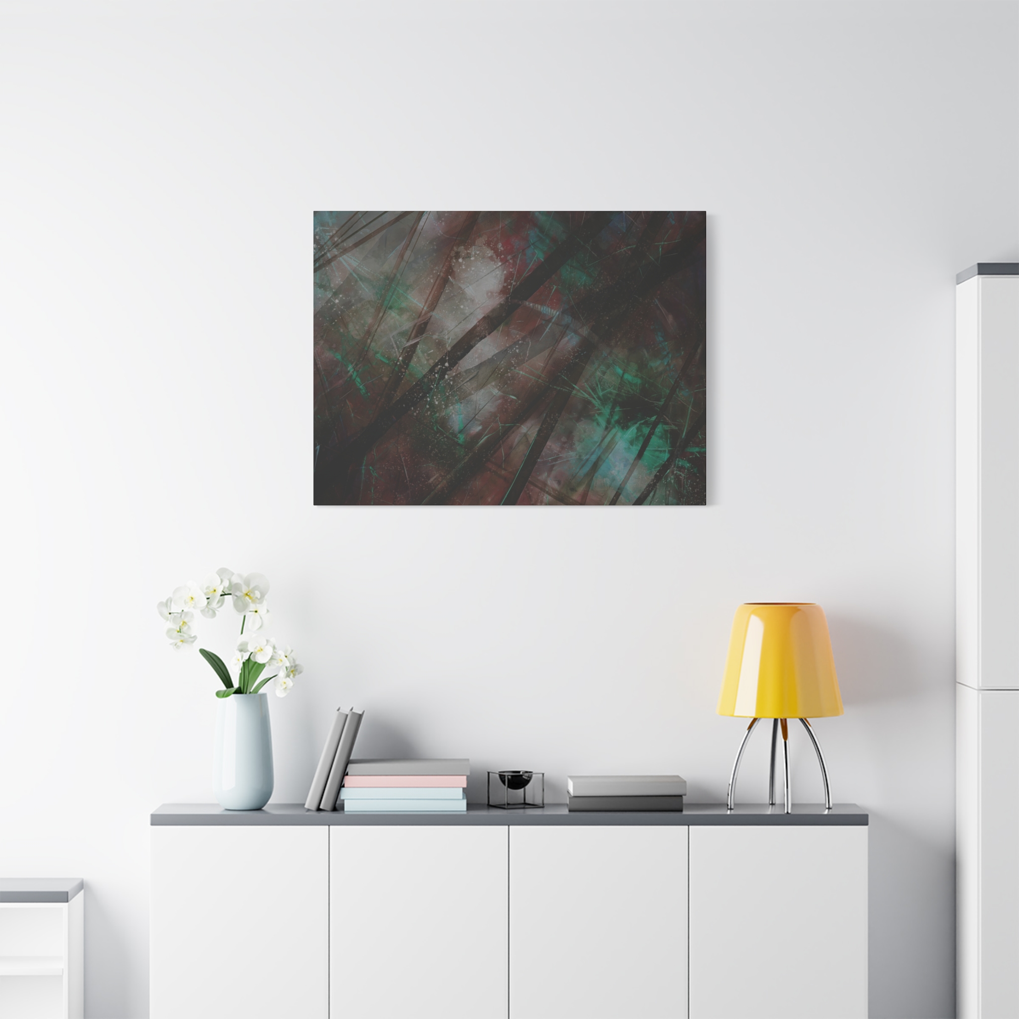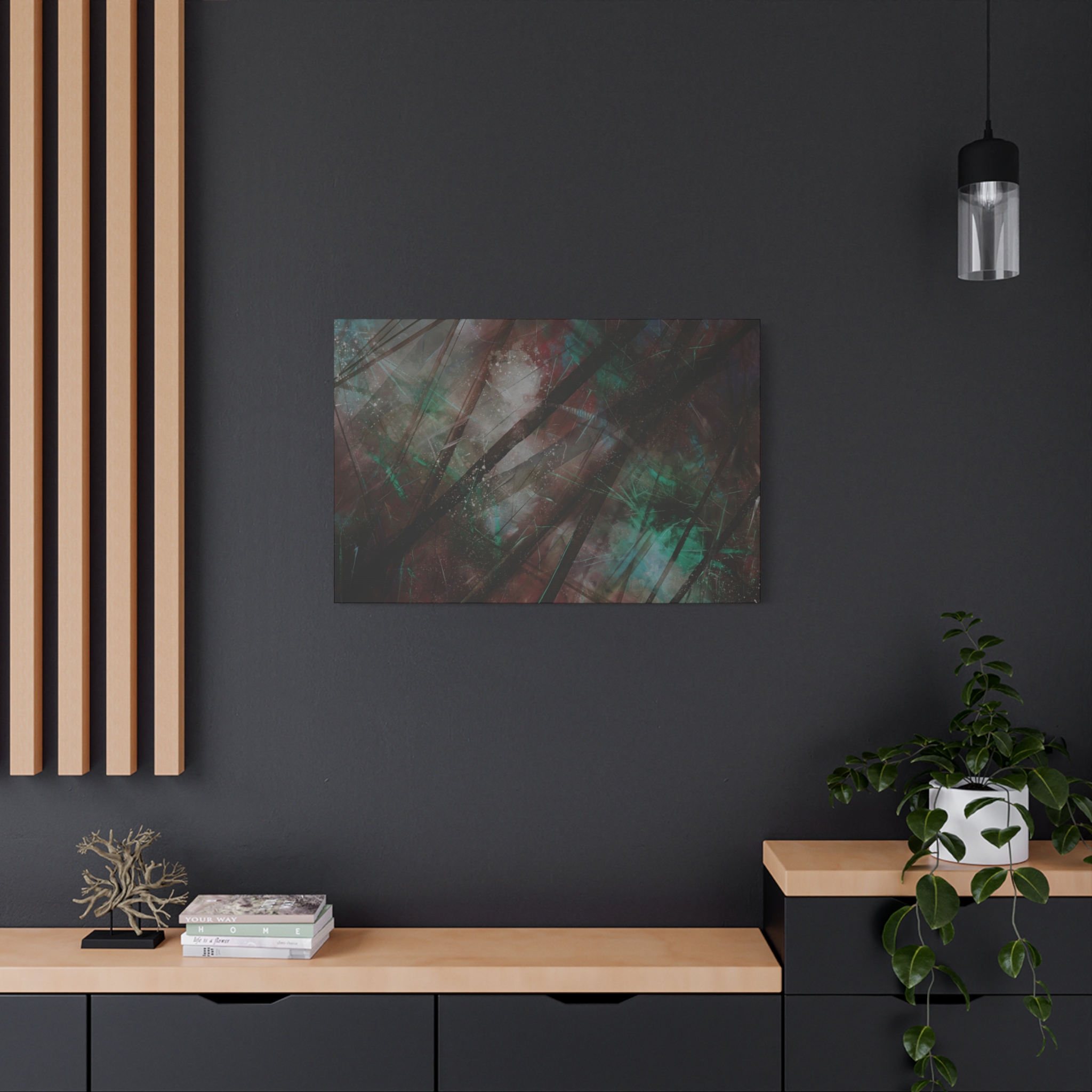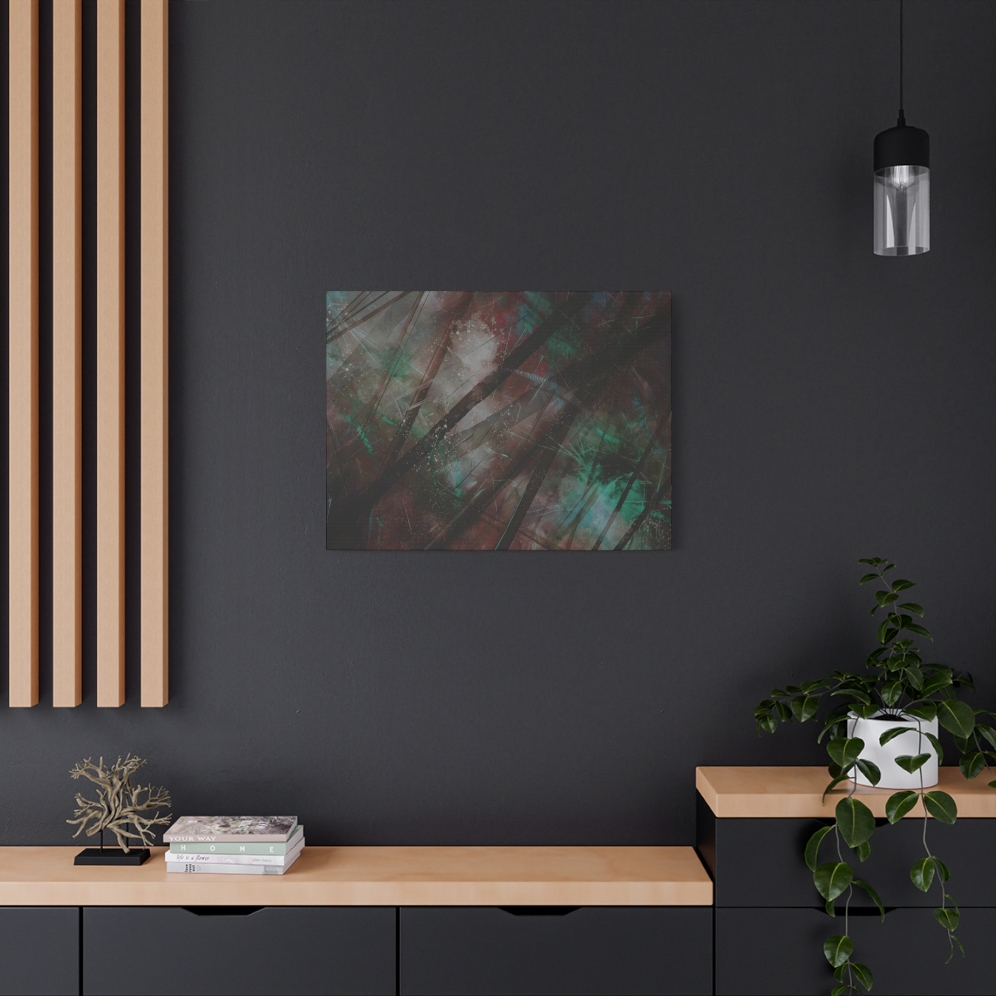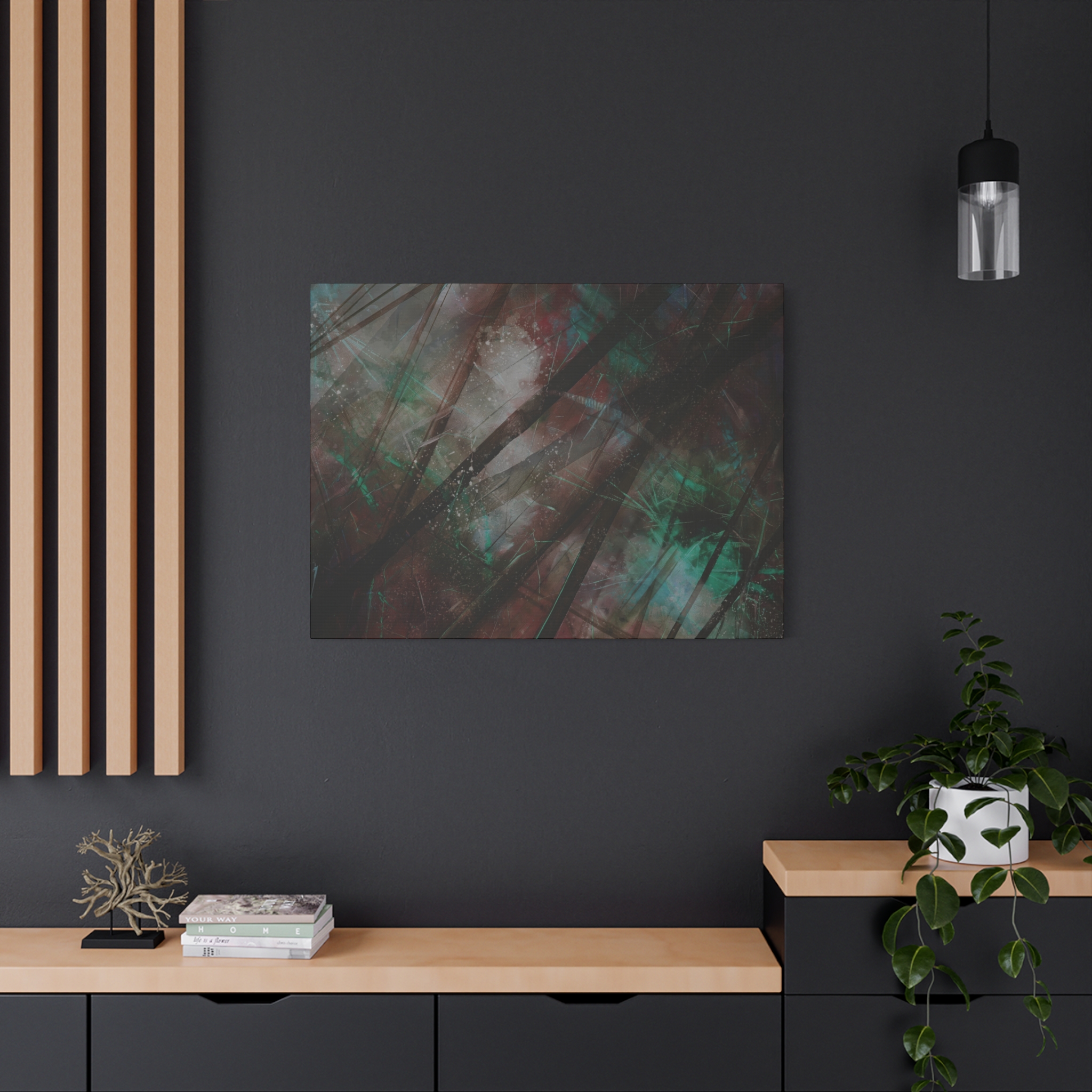 Custom digitally printed artwork on a quality canvas. Every print in a black pinewood frame will look sleek and beautiful in any interior. The artwork will be printed on the cotton-polyester canvas with a special proprietary coating to make sure it stays vibrant for ages.