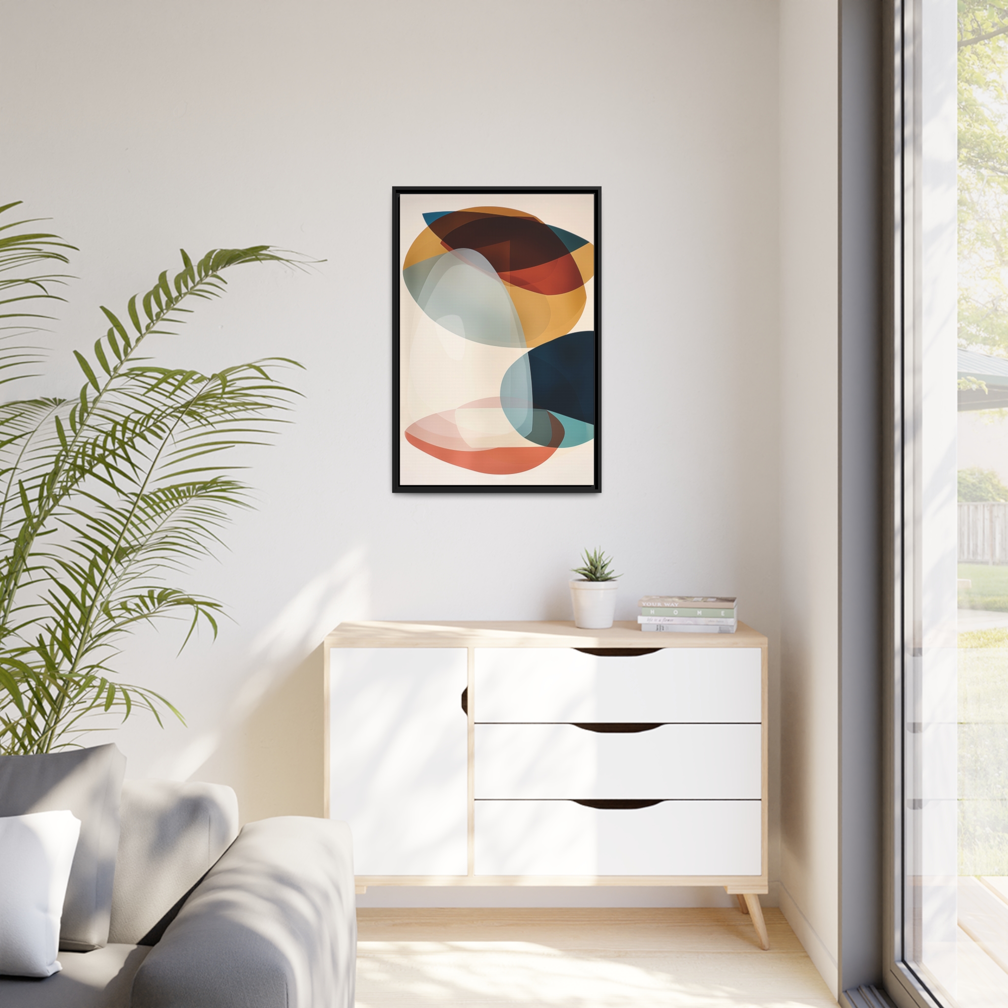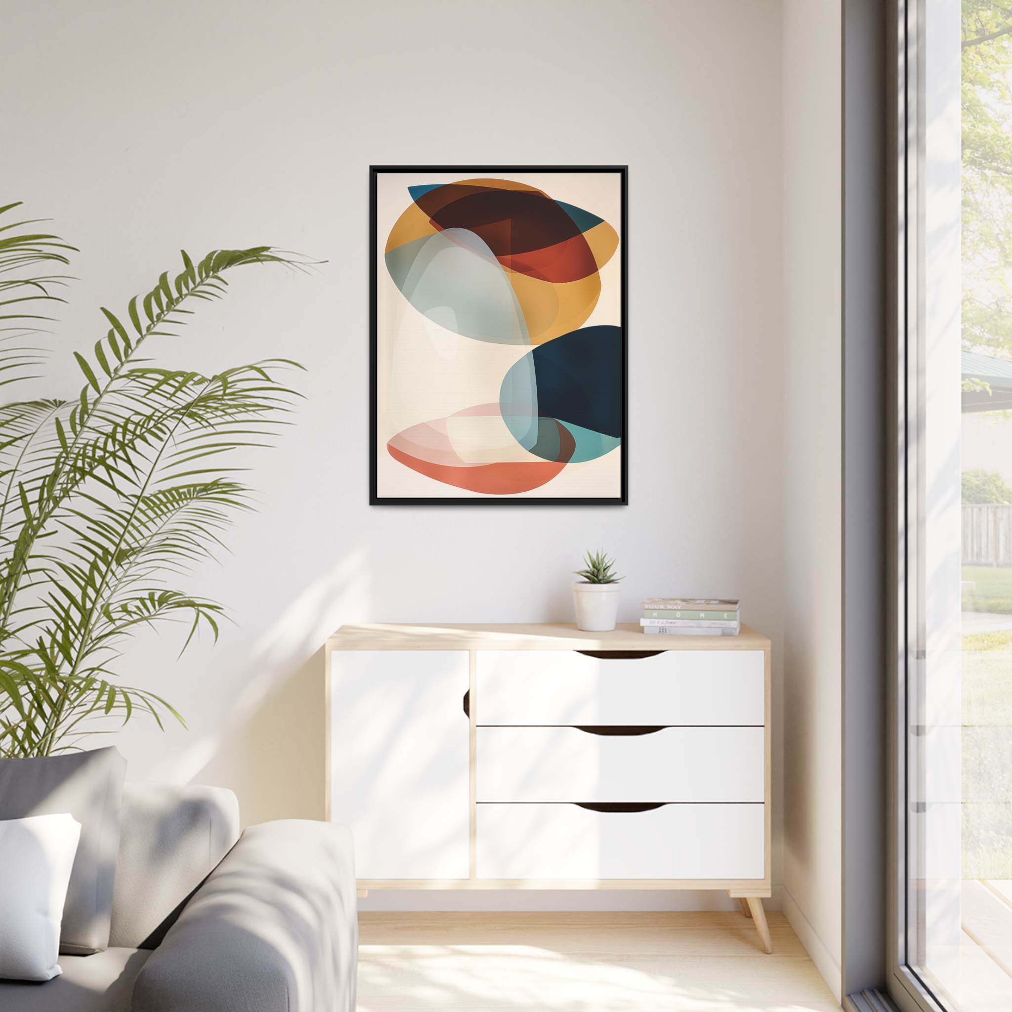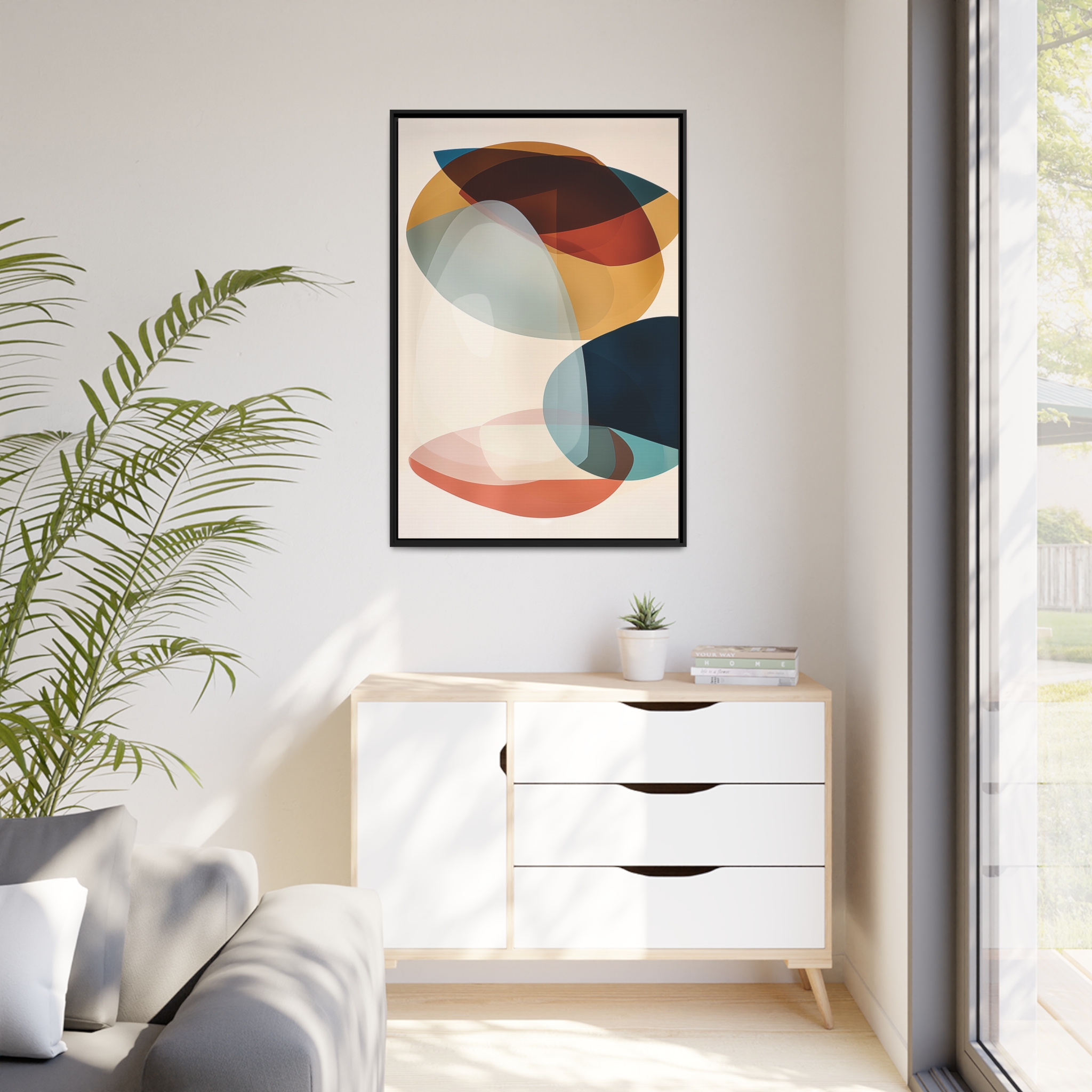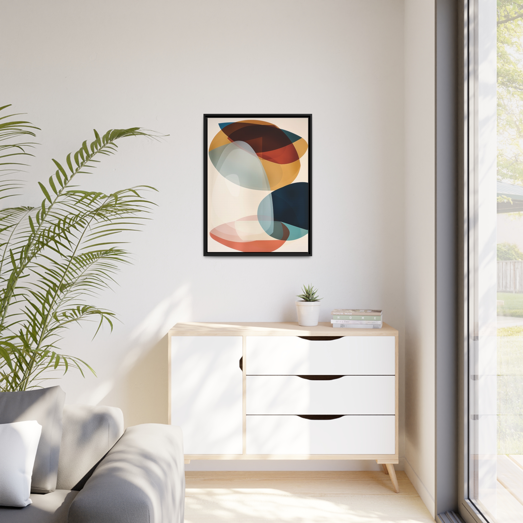 Custom digitally printed artwork on a quality canvas. .Every print in a black pinewood frame will look sleek and beautiful in any interior. The artwork will be printed on the cotton-polyester canvas with a special proprietary coating to make sure it stays vibrant for ages. Environmentally-conscious – it’s made from sustainably sourced materials (Forest Stewardship Council certified) and custom printed on demand no warehouse stocks and no waste. Choose between the designer specified sizes. The sawtooth hanging hardware is already attached.