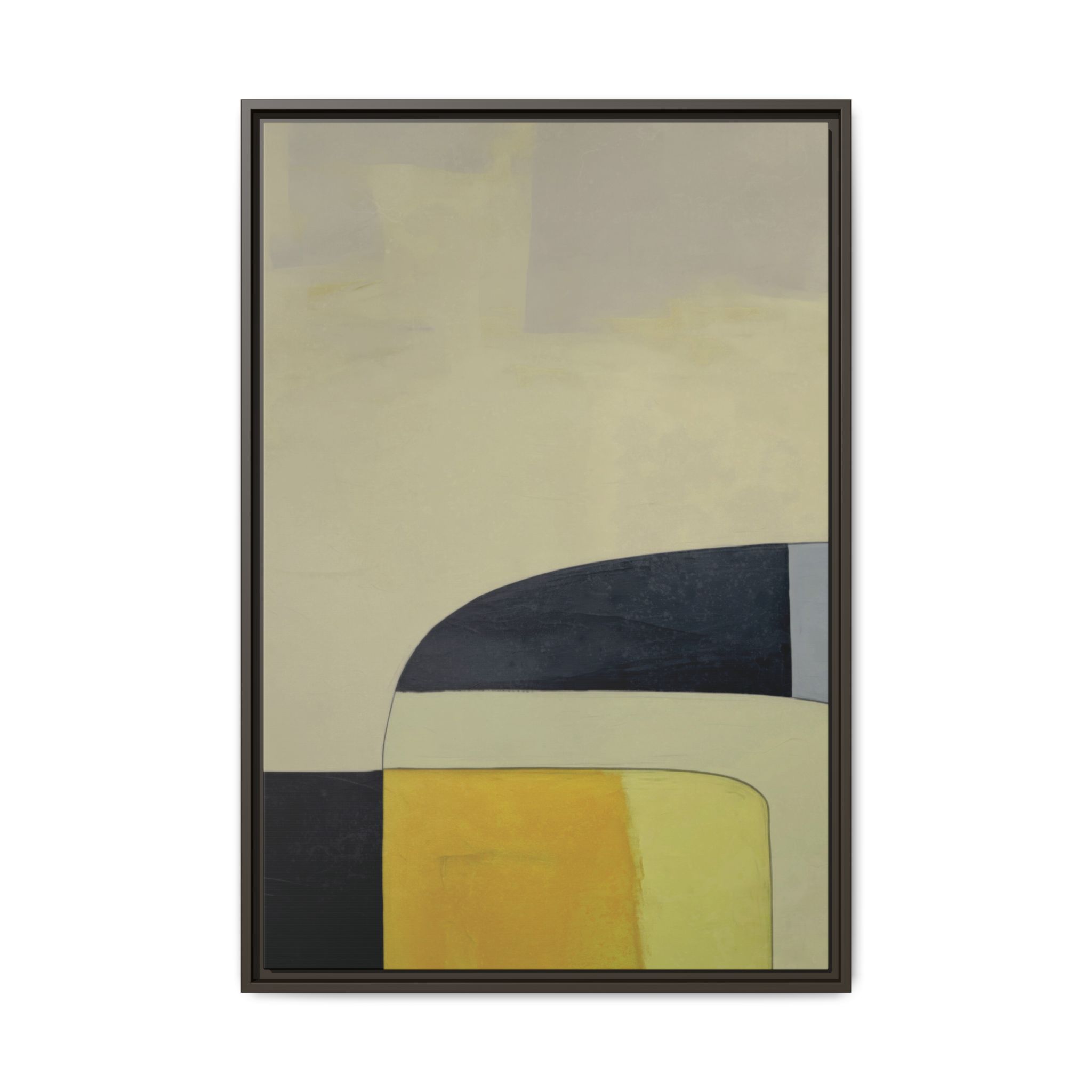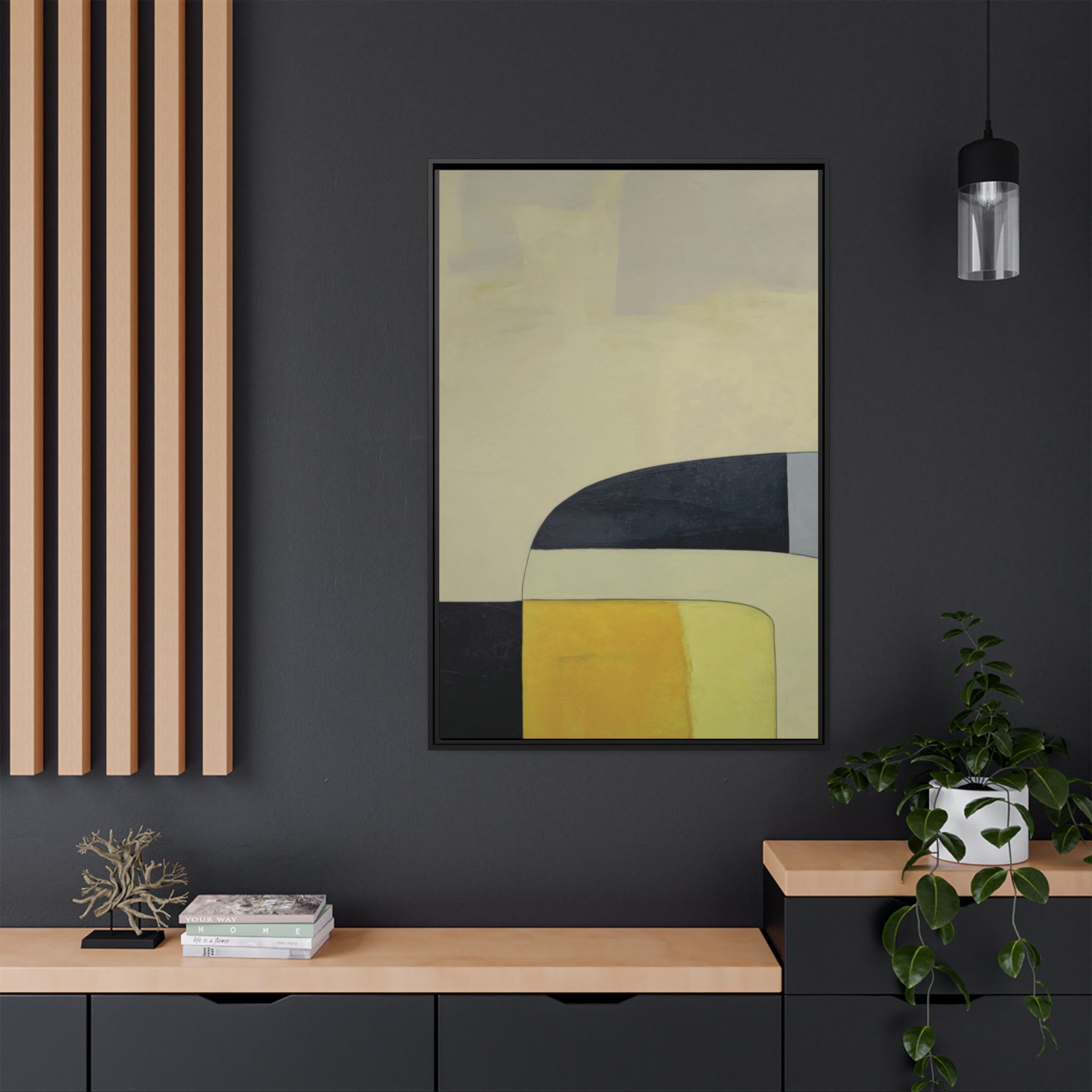 Minimalist art featuring shapes and lines in a palette of yellow, gold, black, beige and cream, with neutral tones and thick brushstrokes, evokes a serene landscape or made horizontal for a modern abstract.