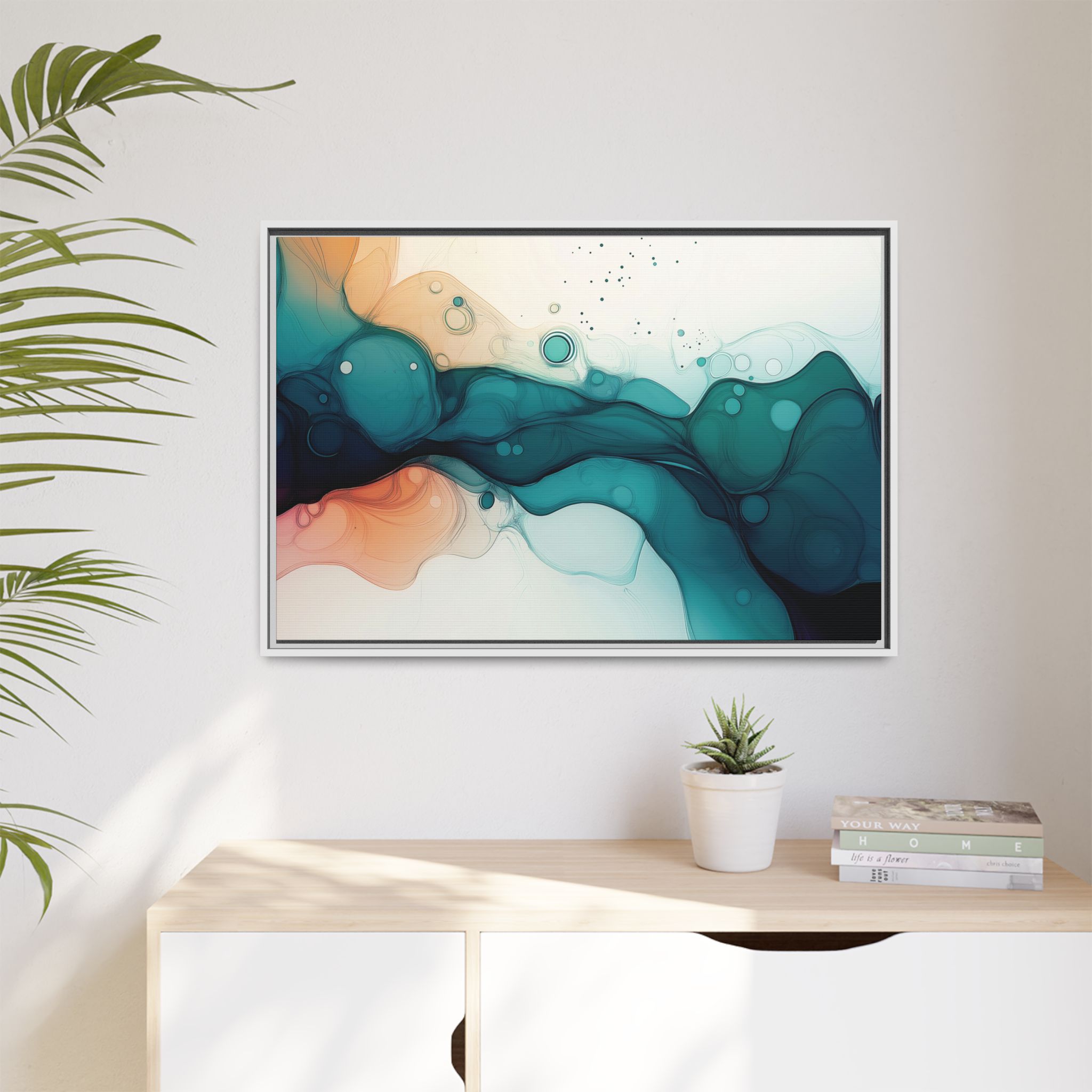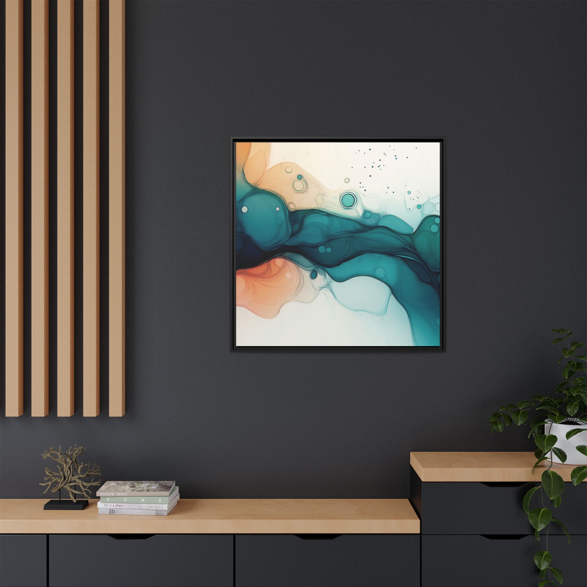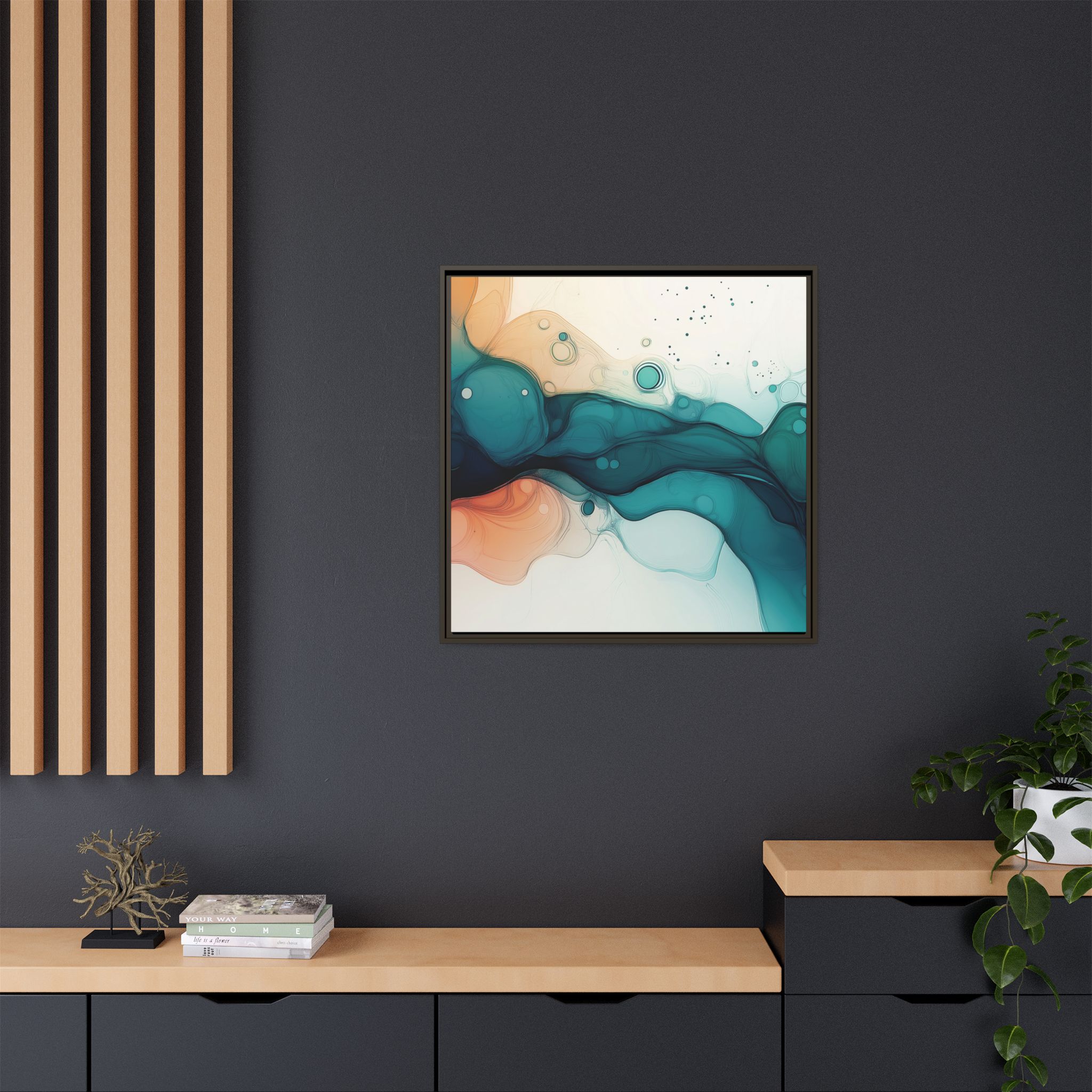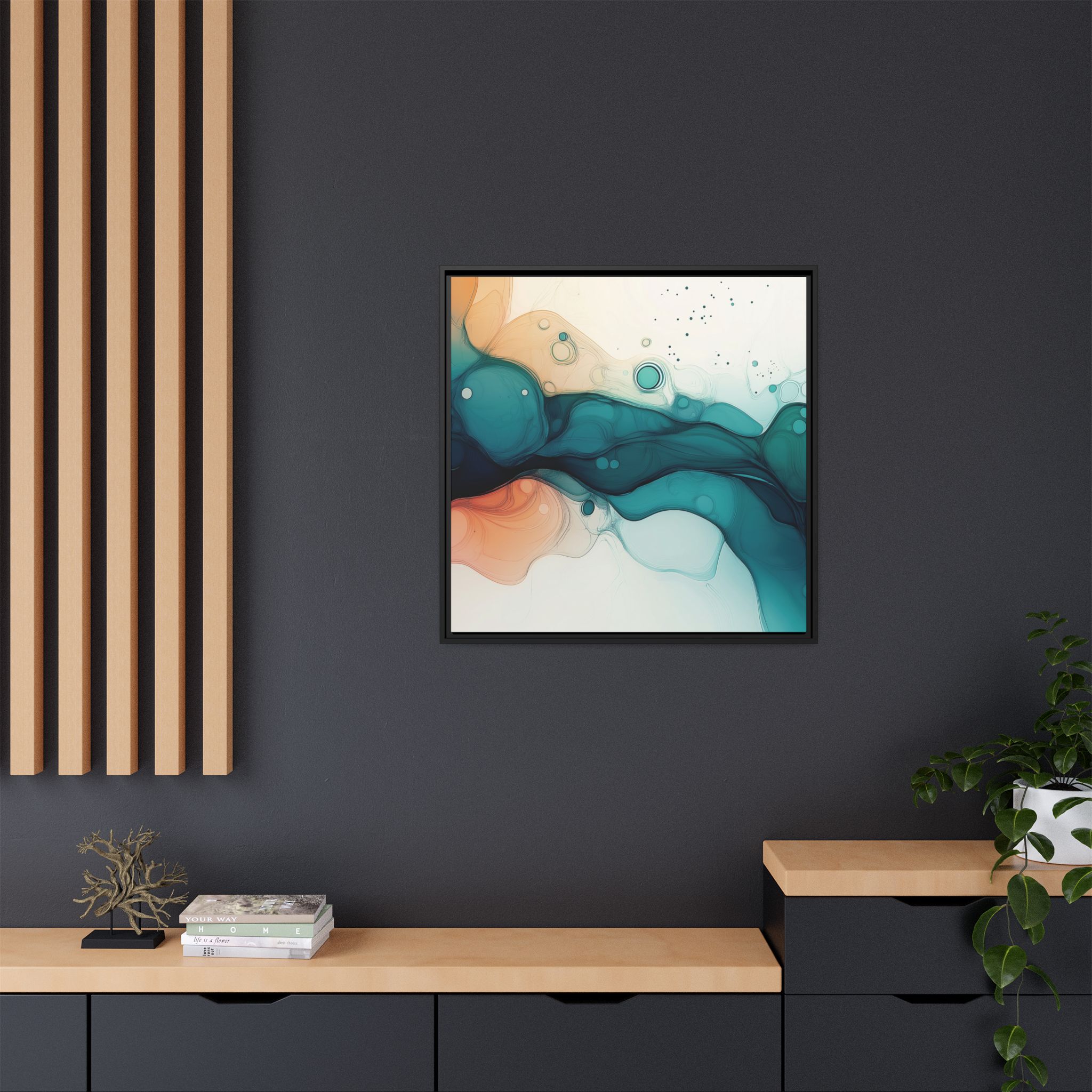 Bring a tranquil and ethereal vibe to your space with this vibrant fluid art canvas print in teal and orange colors. Perfect for art lovers looking to add a unique touch to their home decor. Ideal for gift-giving during birthdays, housewarmings, or as a thoughtful gesture for art enthusiasts.