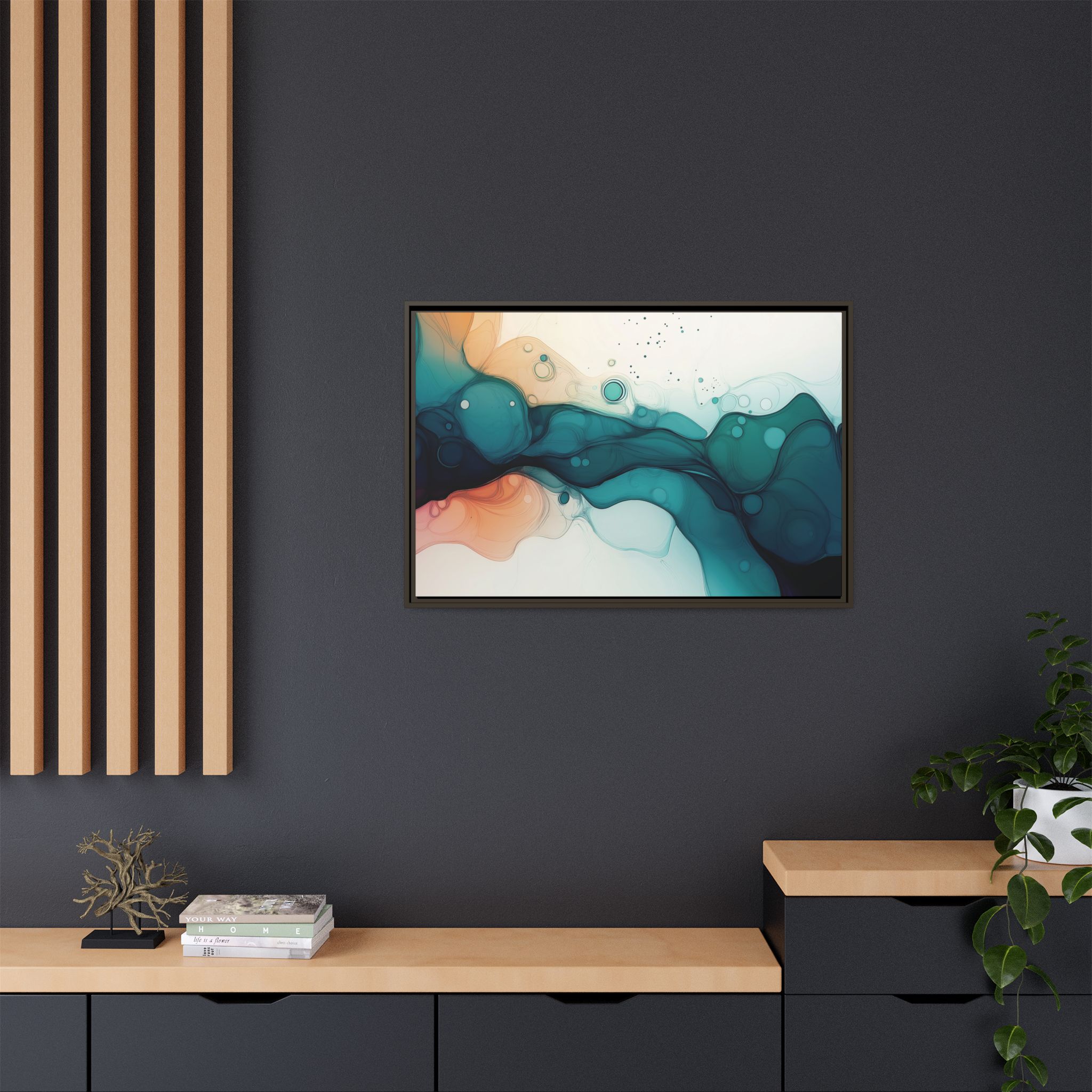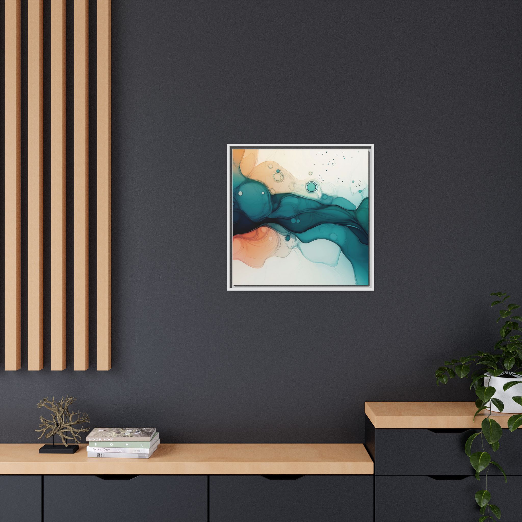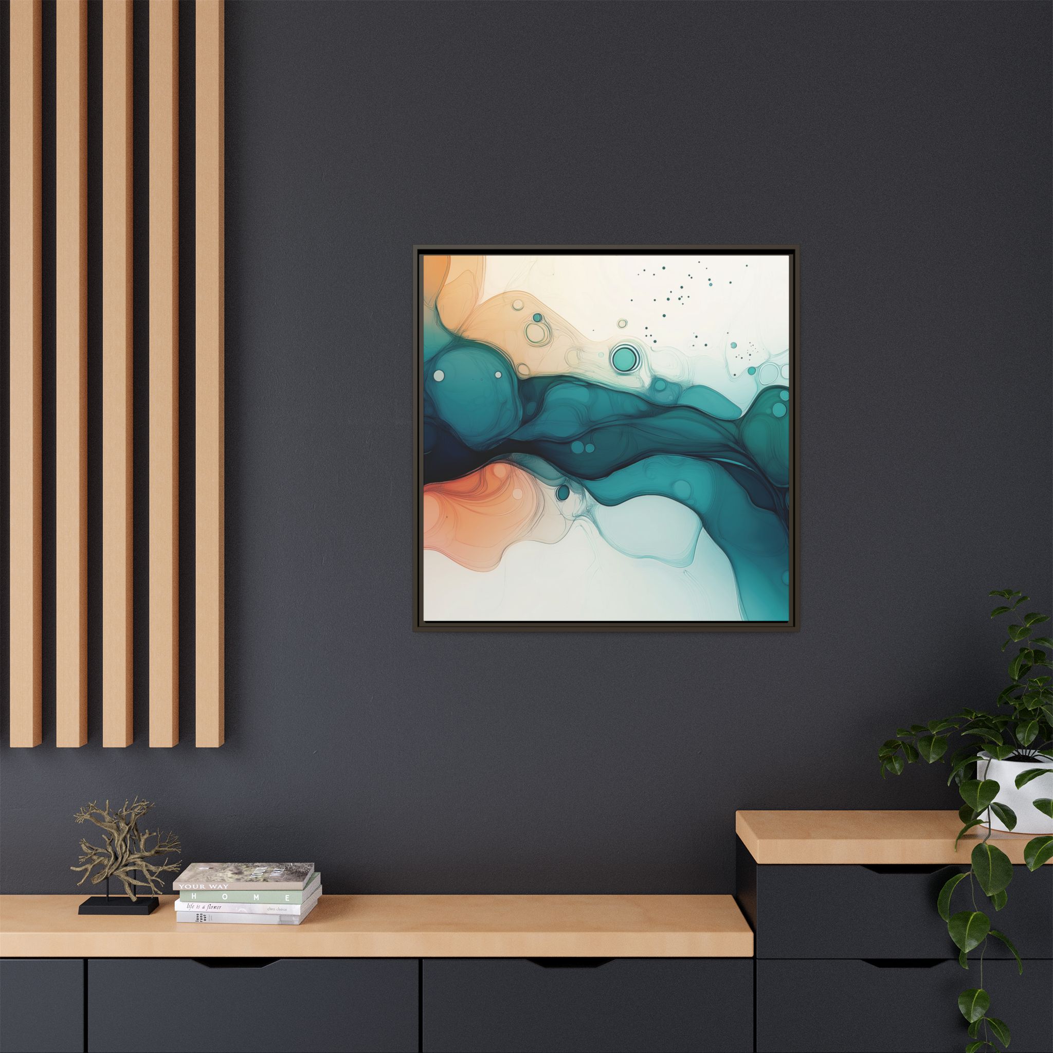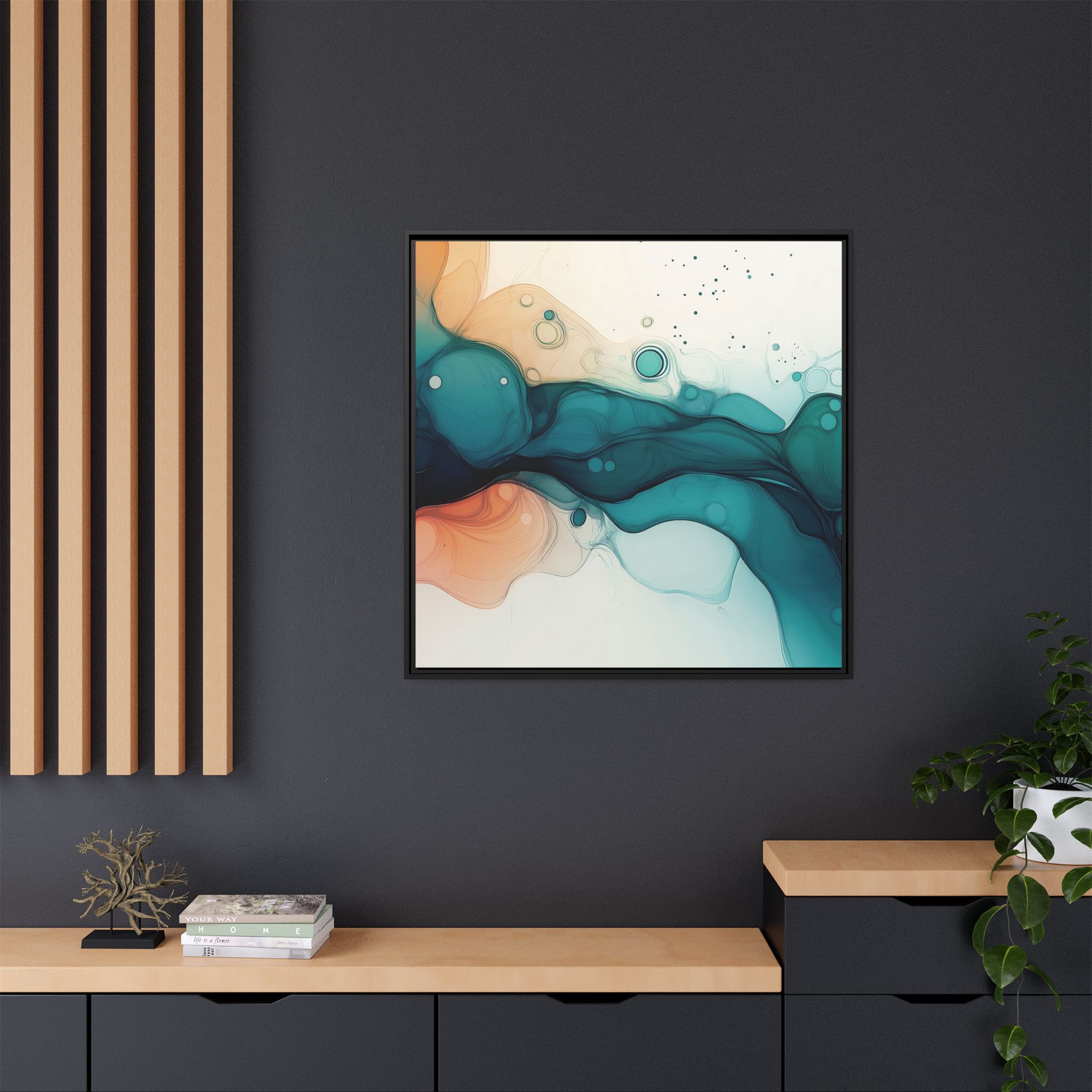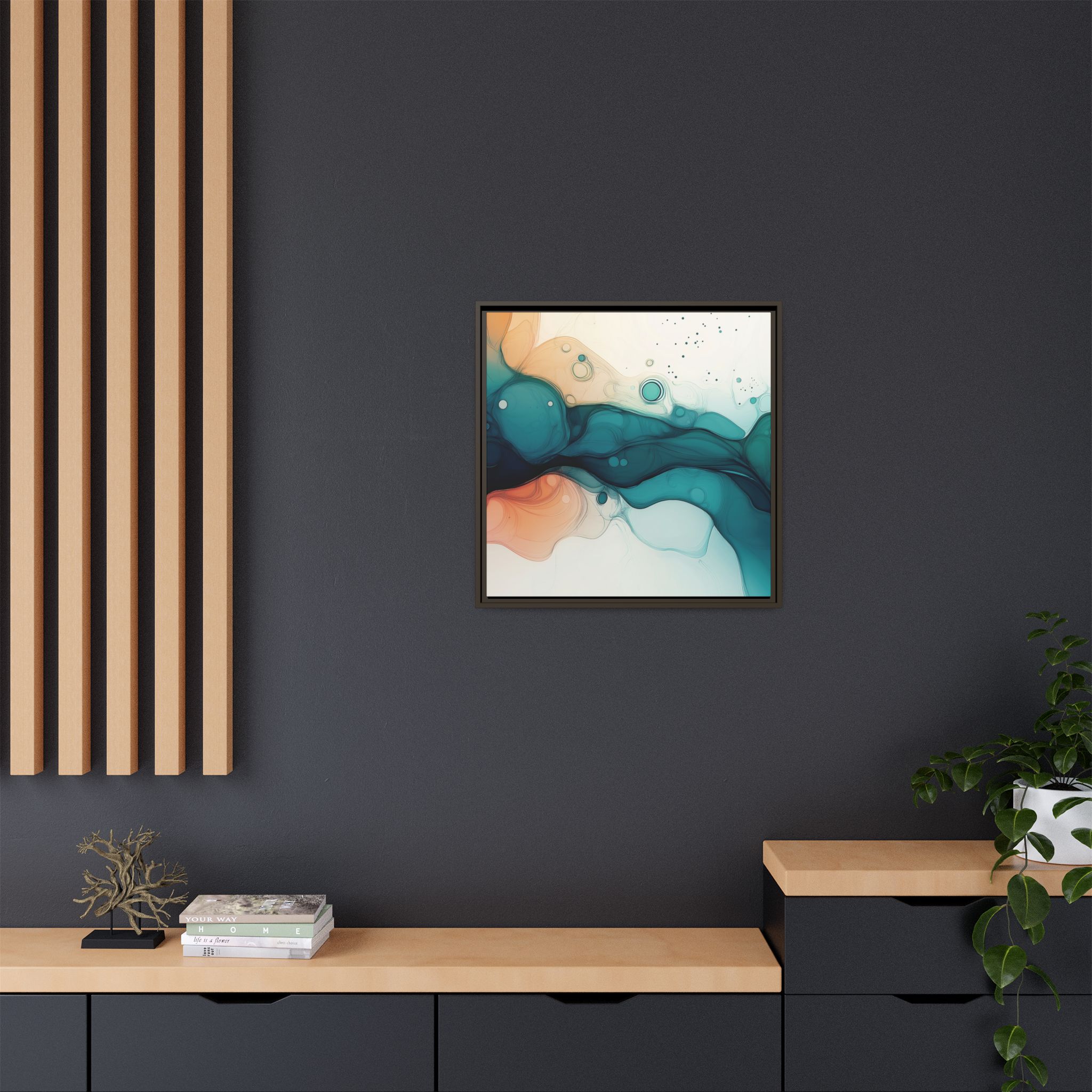 Bring a tranquil and ethereal vibe to your space with this vibrant fluid art canvas print in teal and orange colors. Perfect for art lovers looking to add a unique touch to their home decor. Ideal for gift-giving during birthdays, housewarmings, or as a thoughtful gesture for art enthusiasts.