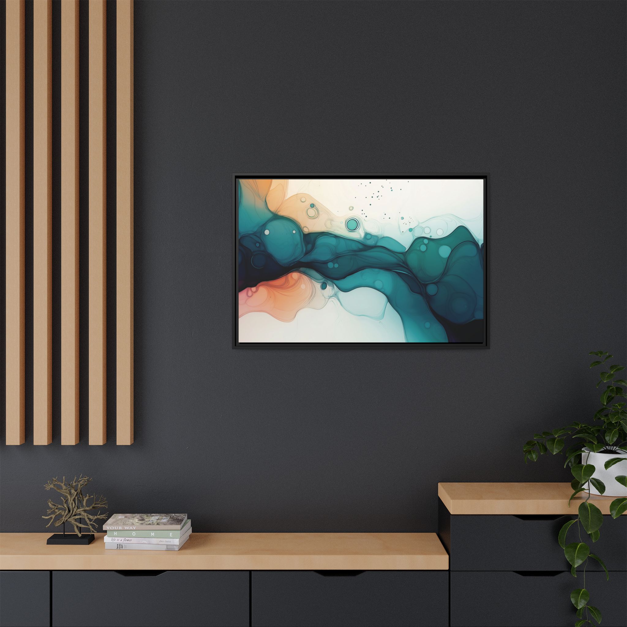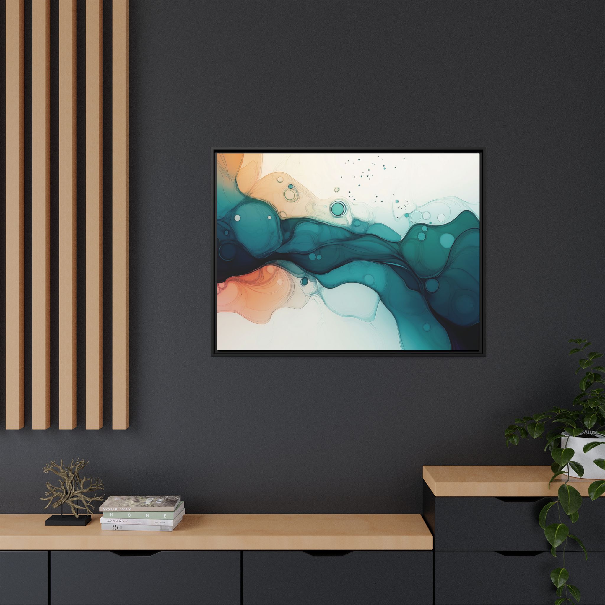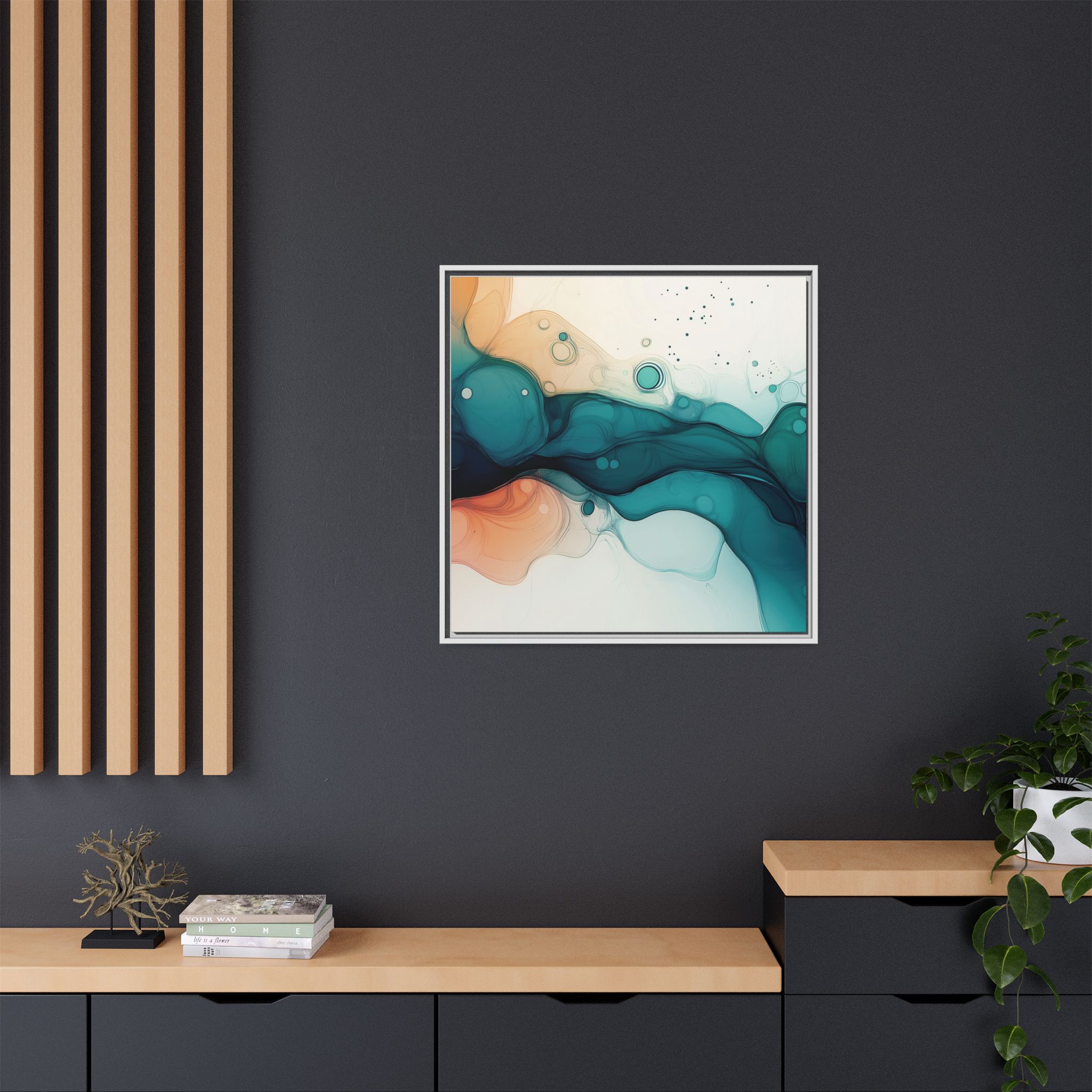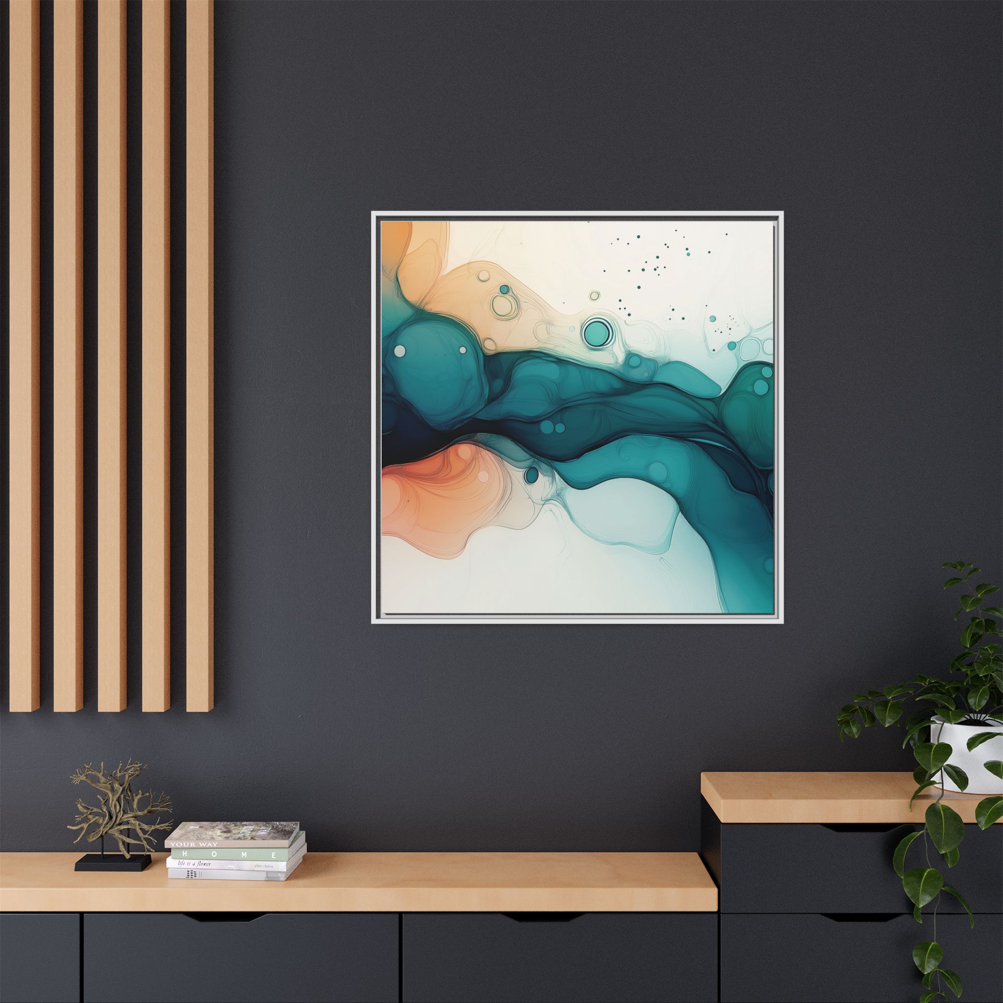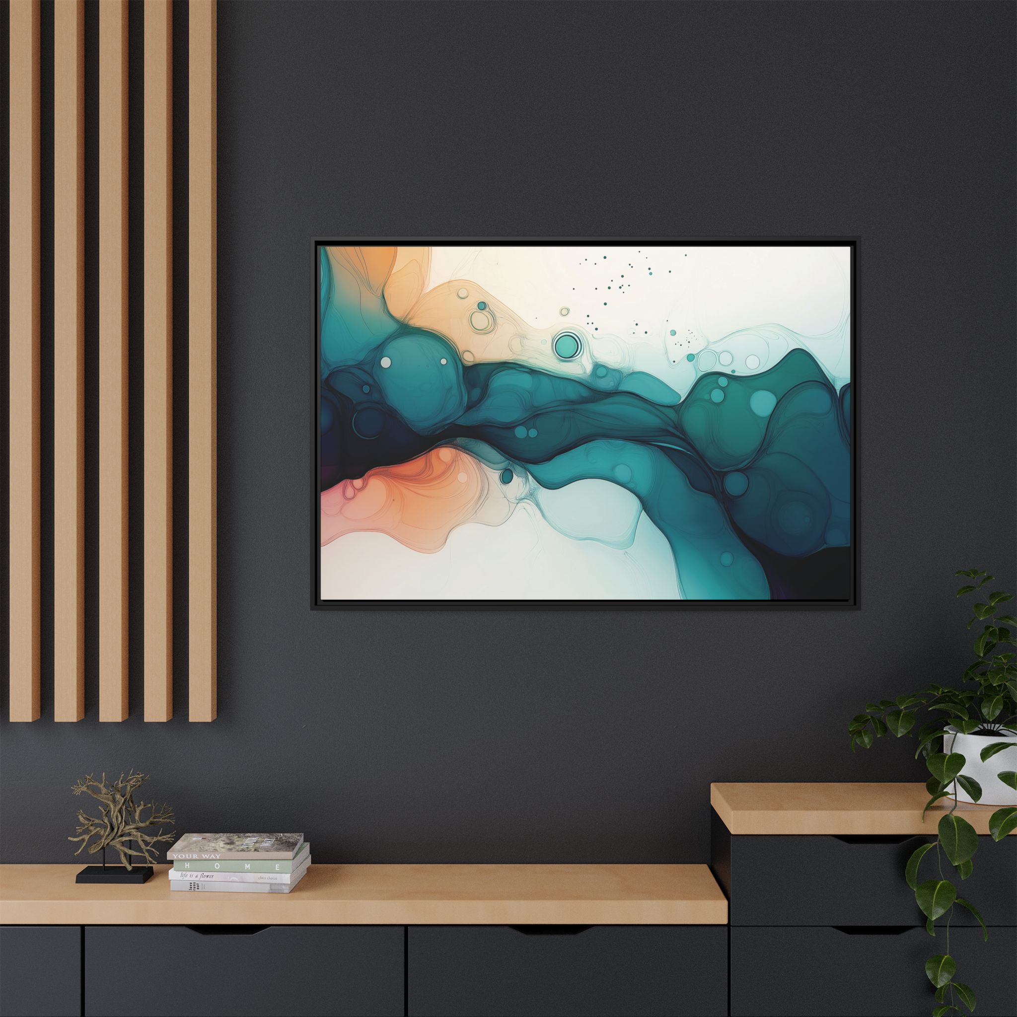 Bring a tranquil and ethereal vibe to your space with this vibrant fluid art canvas print in teal and orange colors. Perfect for art lovers looking to add a unique touch to their home decor. Ideal for gift-giving during birthdays, housewarmings, or as a thoughtful gesture for art enthusiasts.