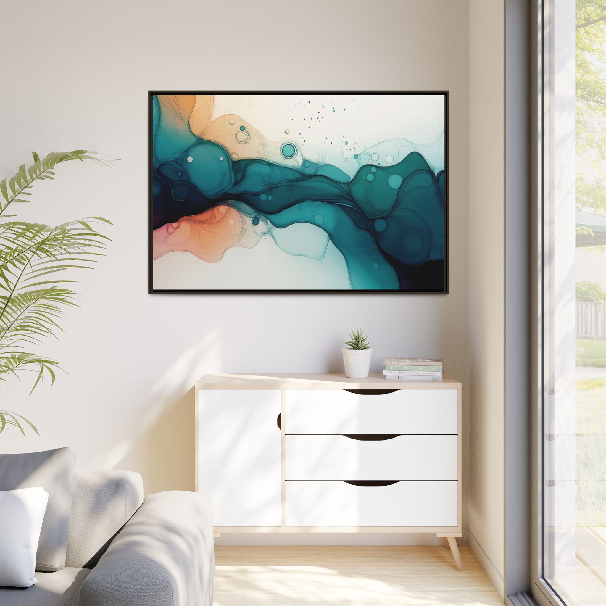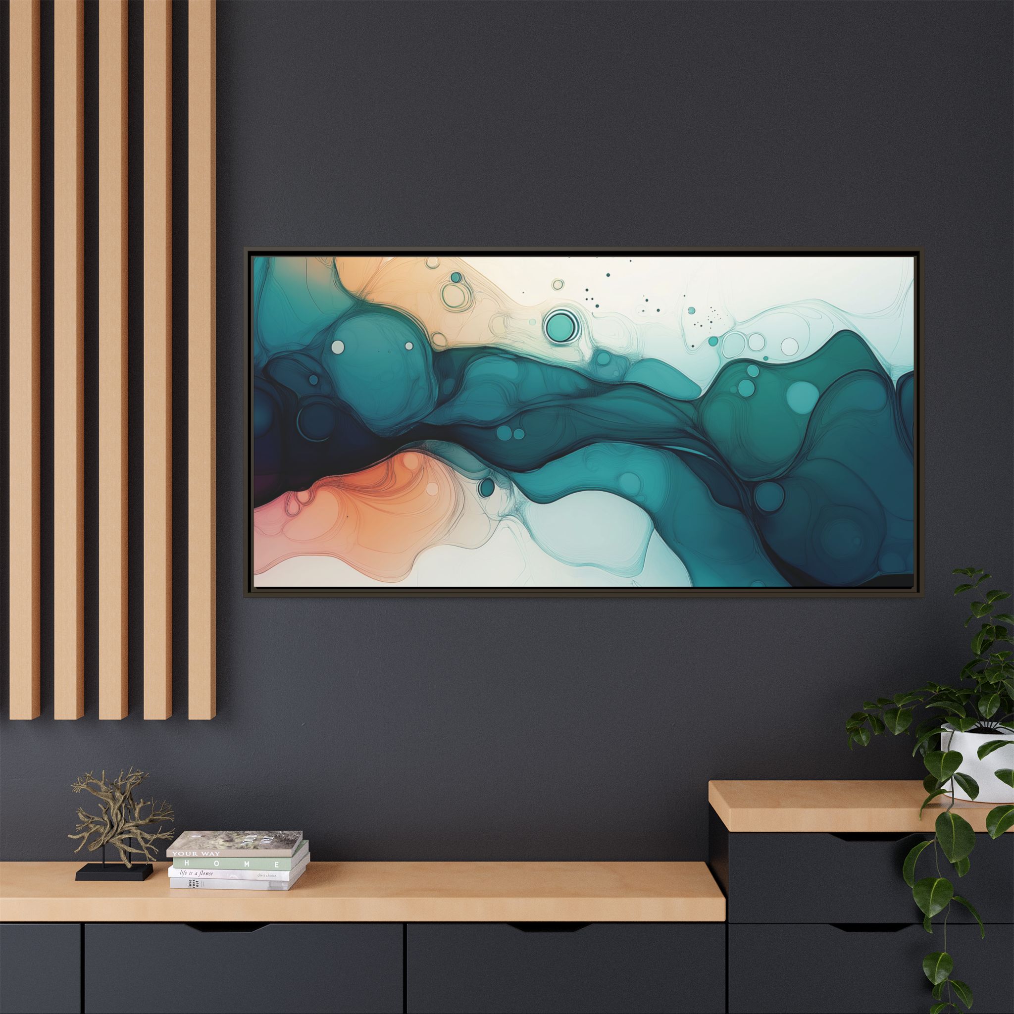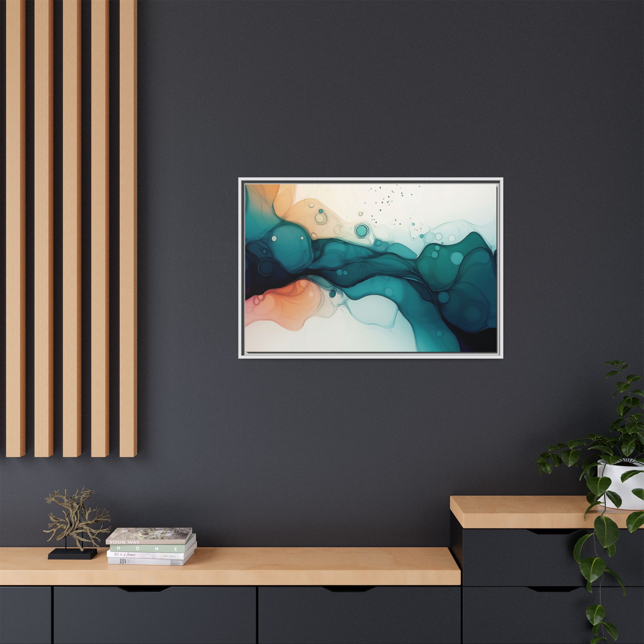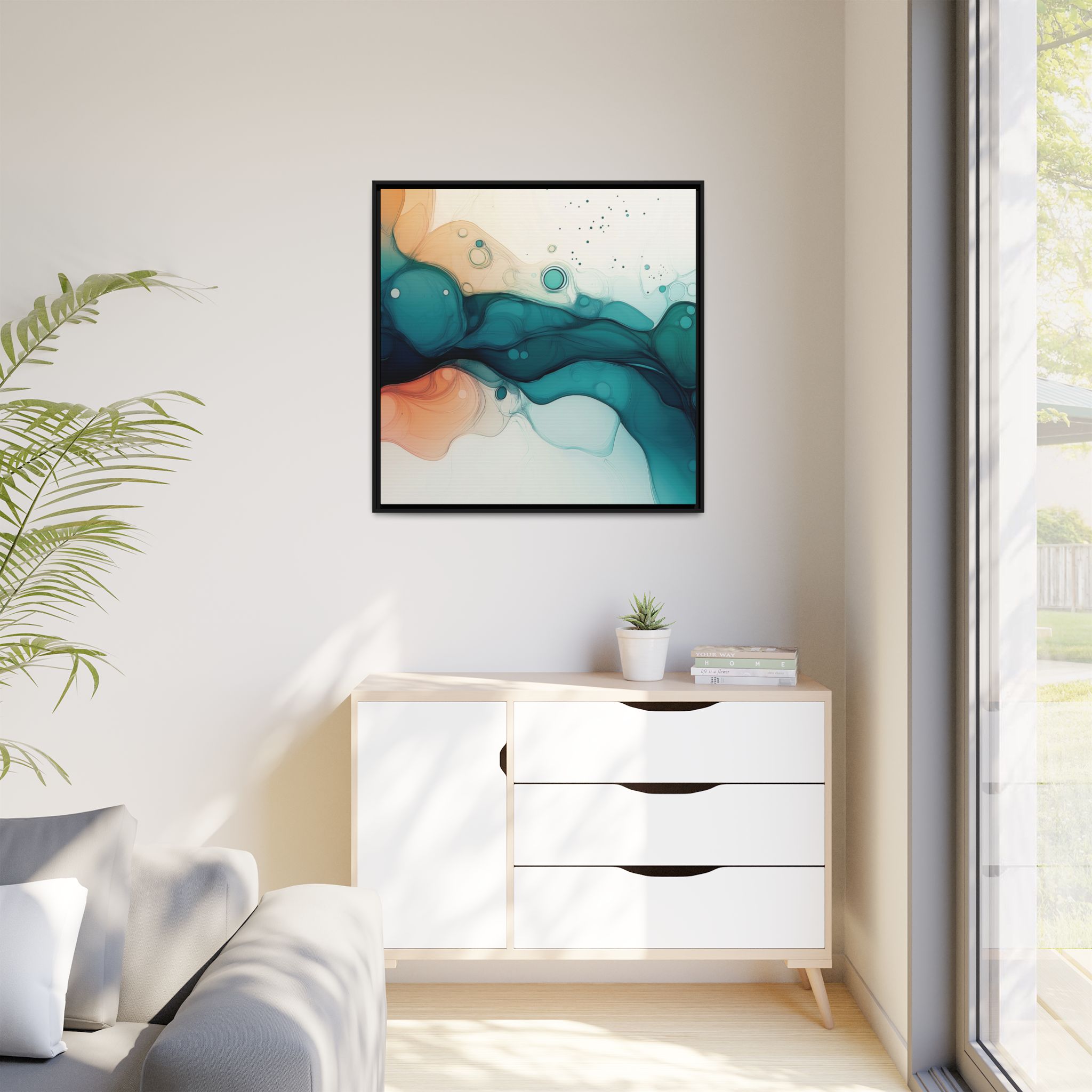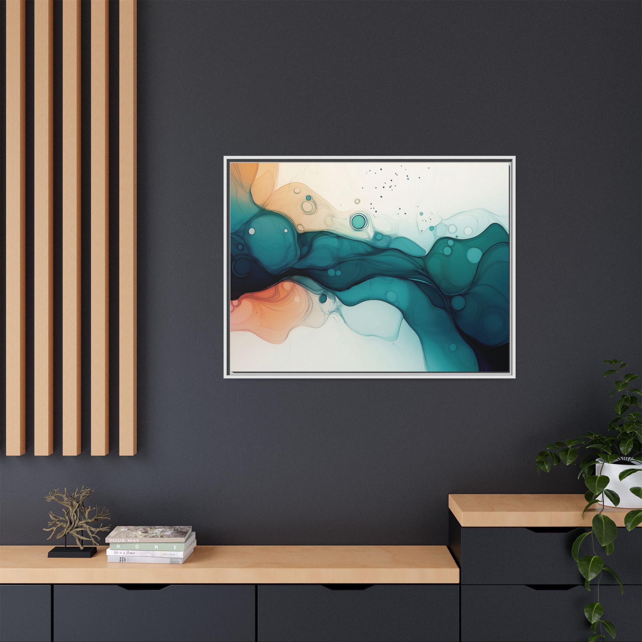 Bring a tranquil and ethereal vibe to your space with this vibrant fluid art canvas print in teal and orange colors. Perfect for art lovers looking to add a unique touch to their home decor. Ideal for gift-giving during birthdays, housewarmings, or as a thoughtful gesture for art enthusiasts.