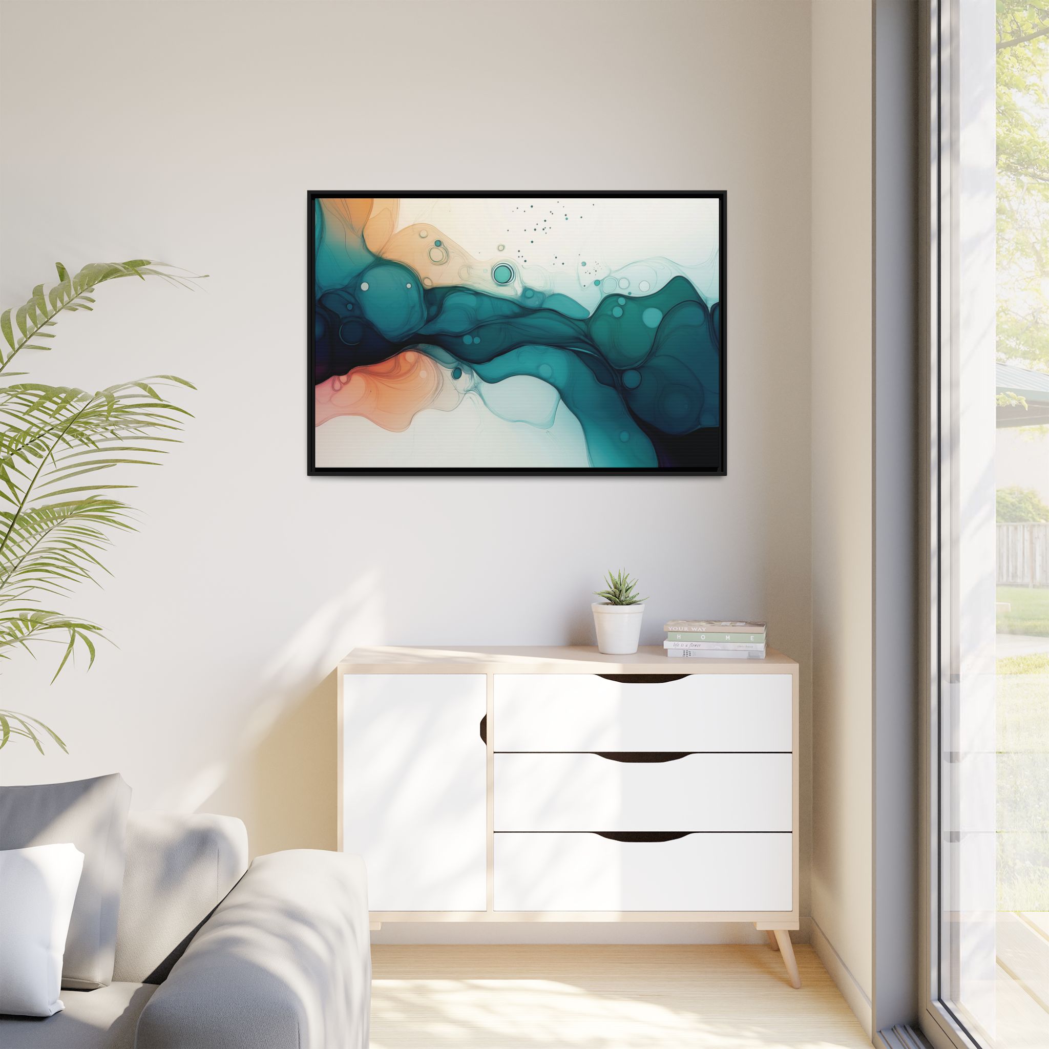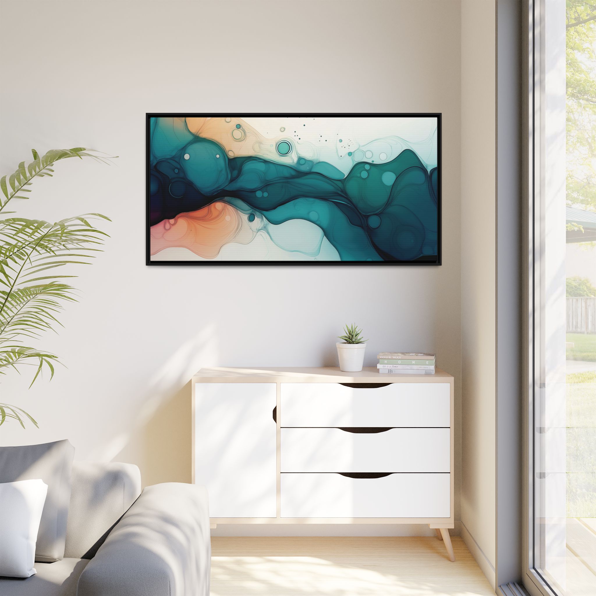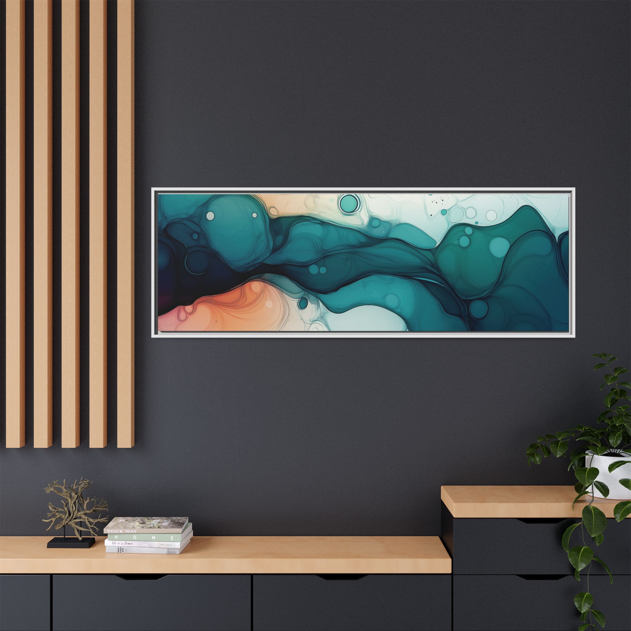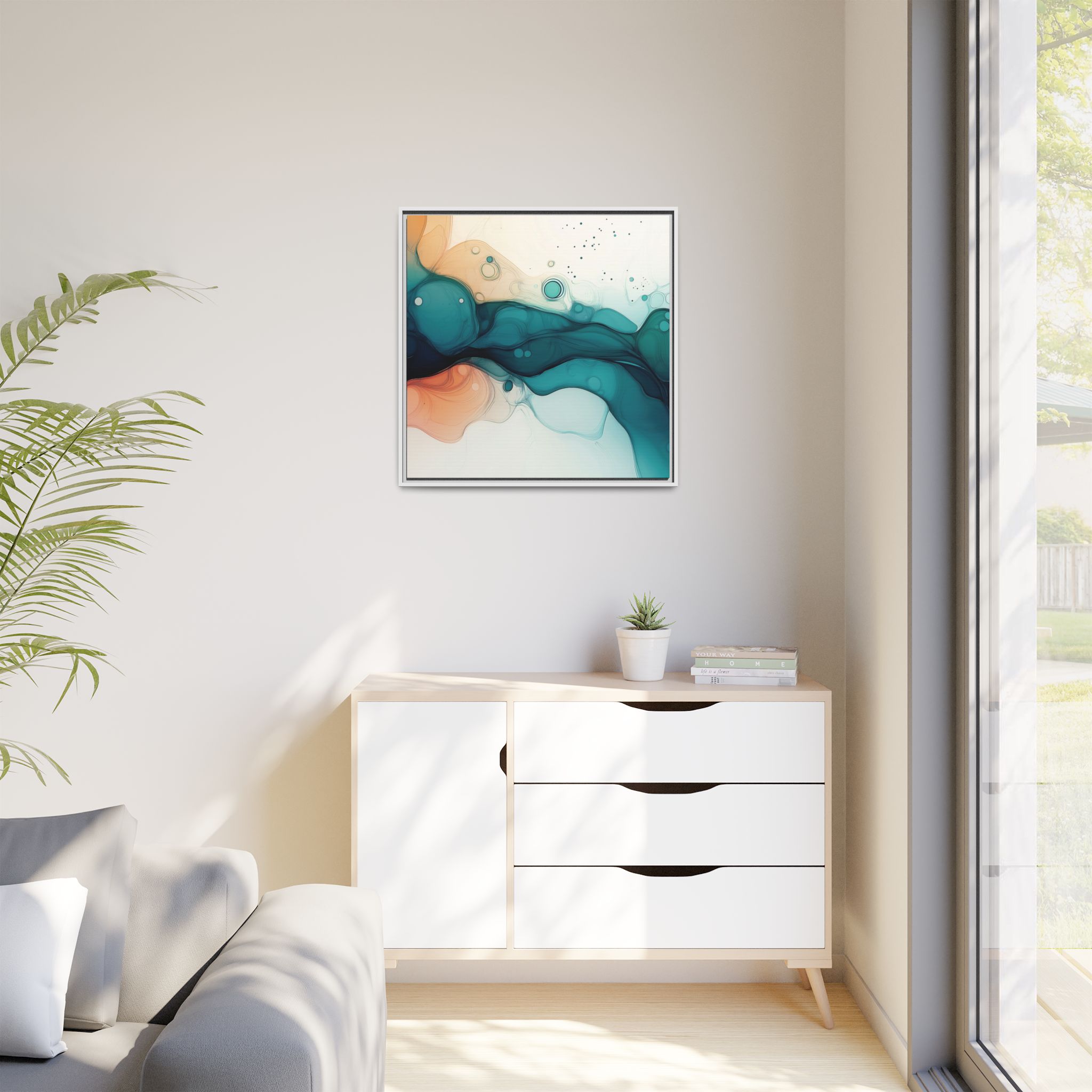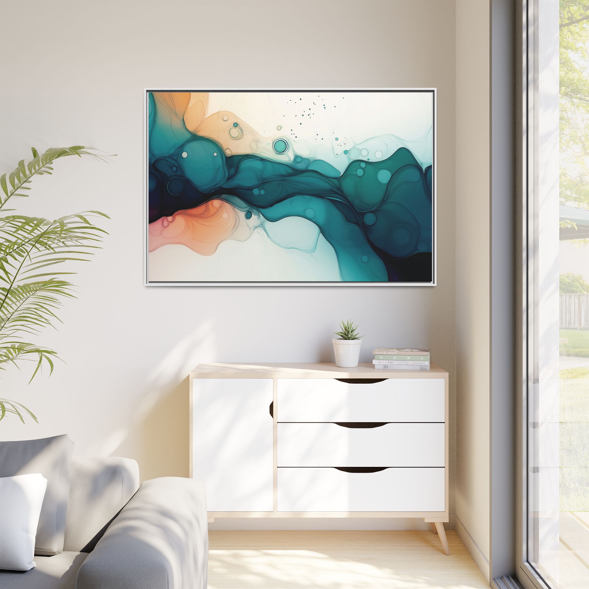 Bring a tranquil and ethereal vibe to your space with this vibrant fluid art canvas print in teal and orange colors. Perfect for art lovers looking to add a unique touch to their home decor. Ideal for gift-giving during birthdays, housewarmings, or as a thoughtful gesture for art enthusiasts.