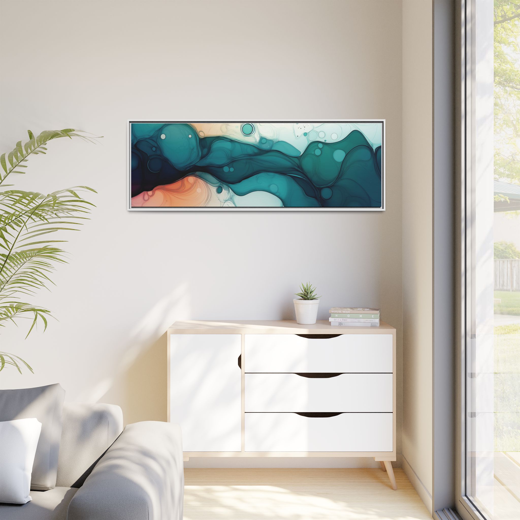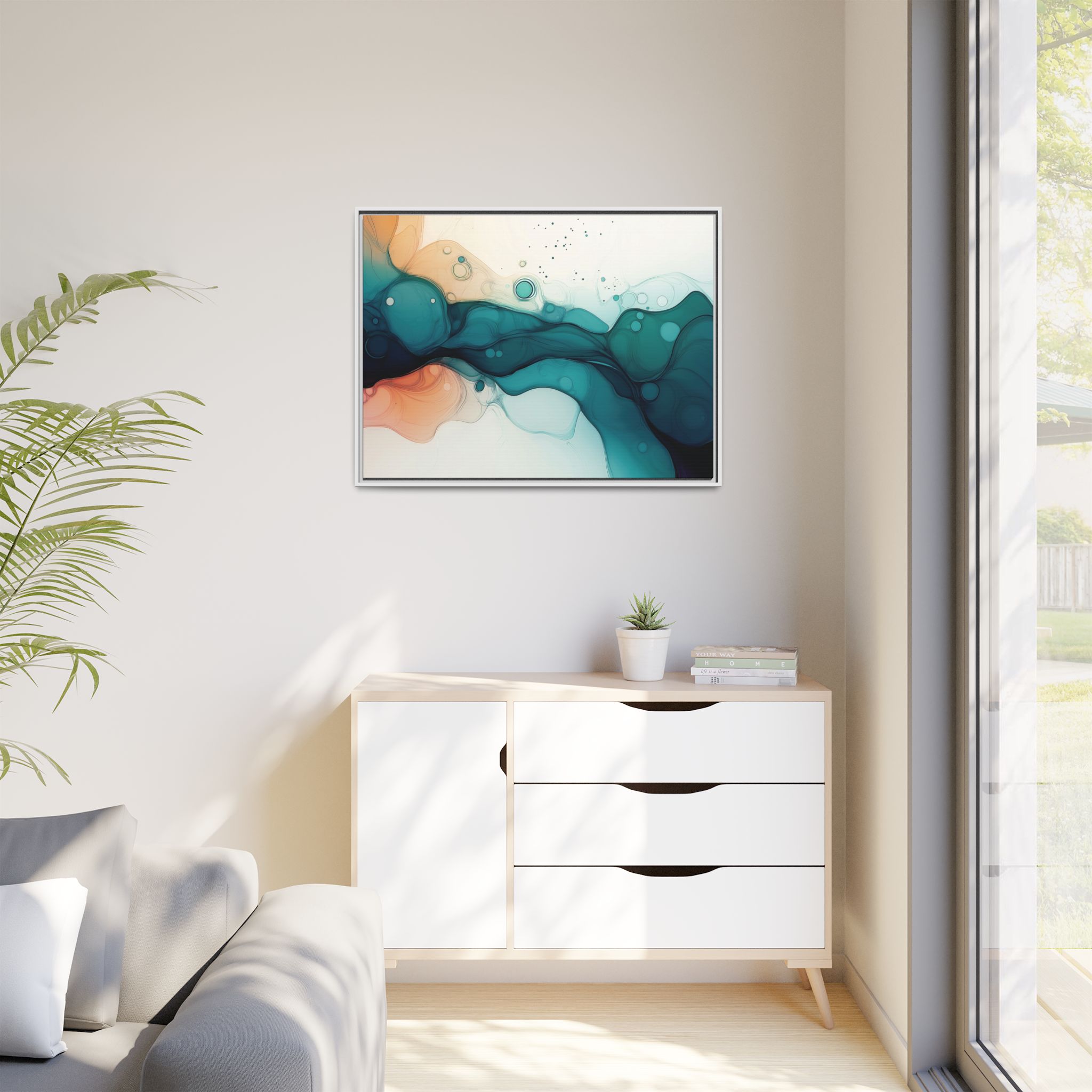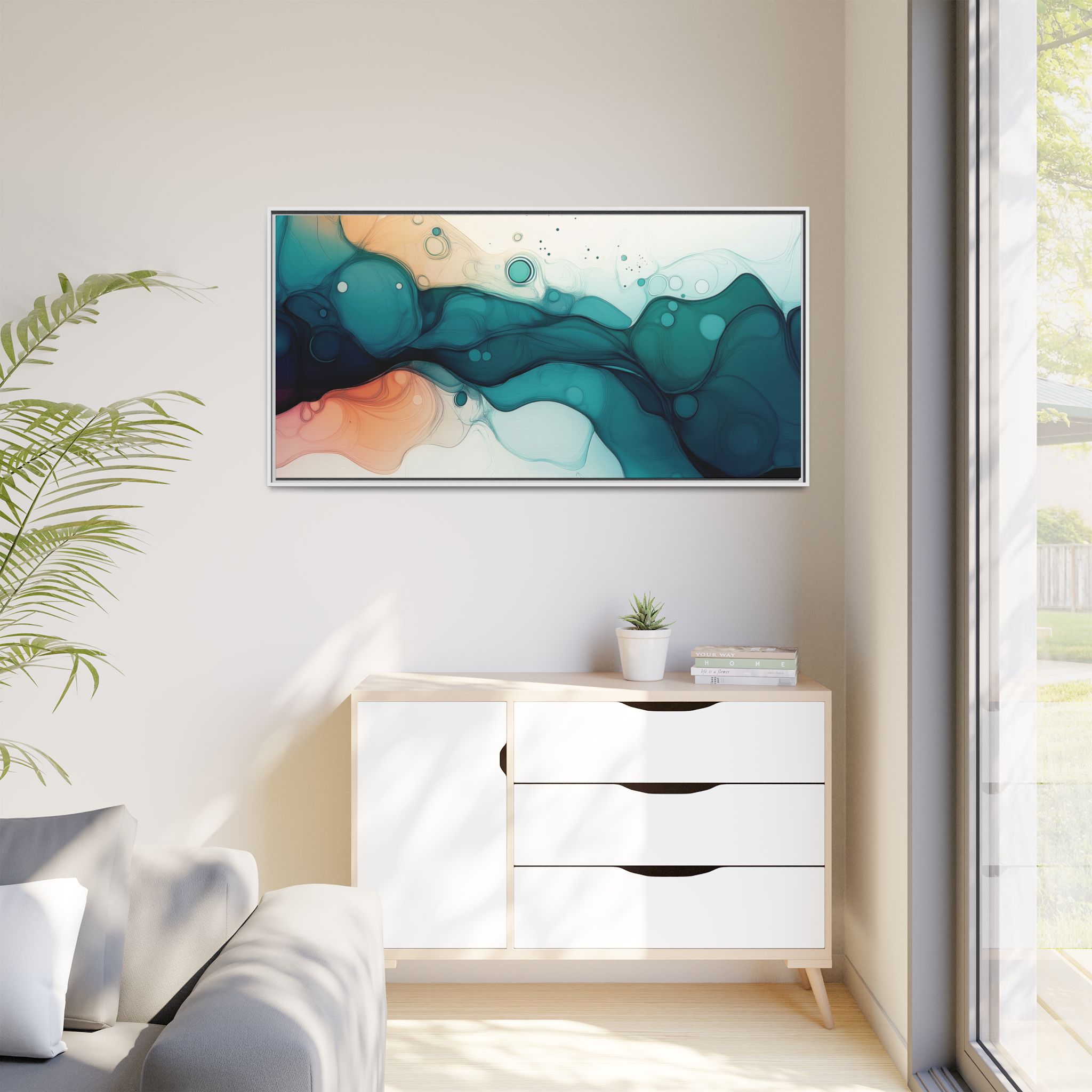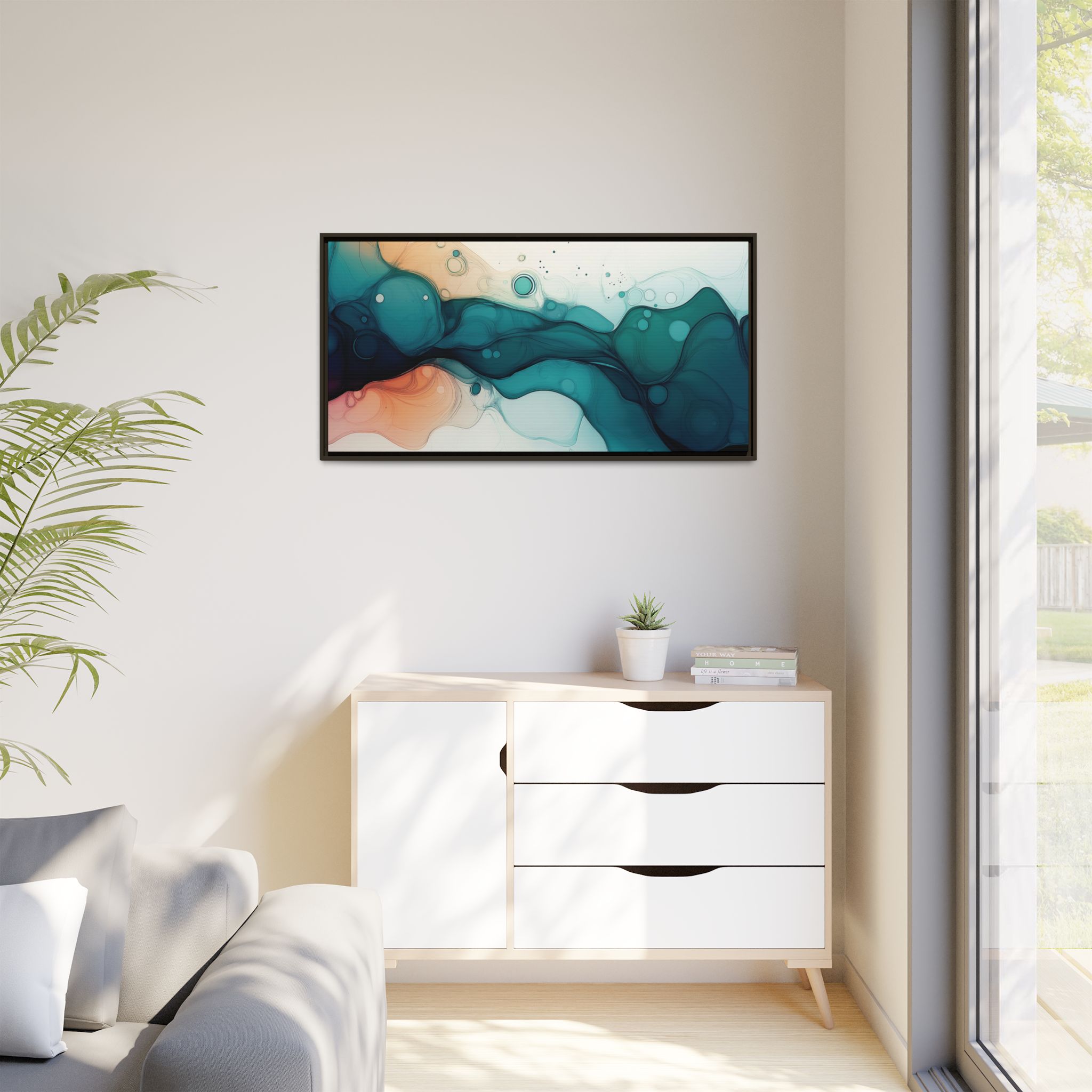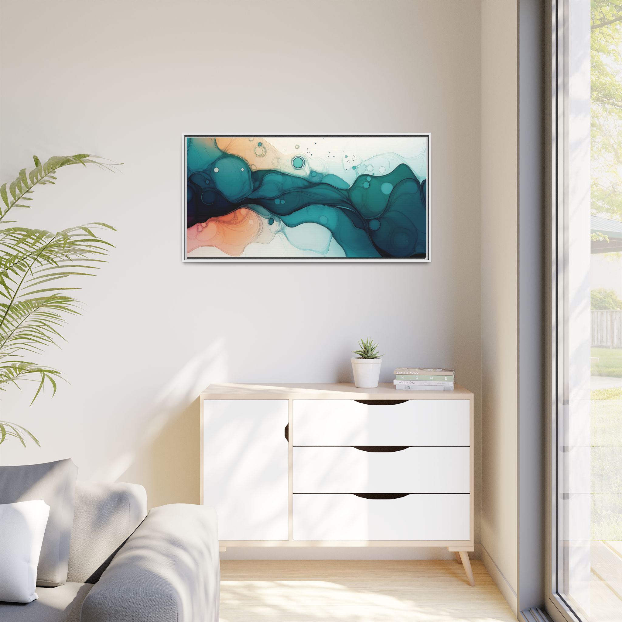 Bring a tranquil and ethereal vibe to your space with this vibrant fluid art canvas print in teal and orange colors. Perfect for art lovers looking to add a unique touch to their home decor. Ideal for gift-giving during birthdays, housewarmings, or as a thoughtful gesture for art enthusiasts.