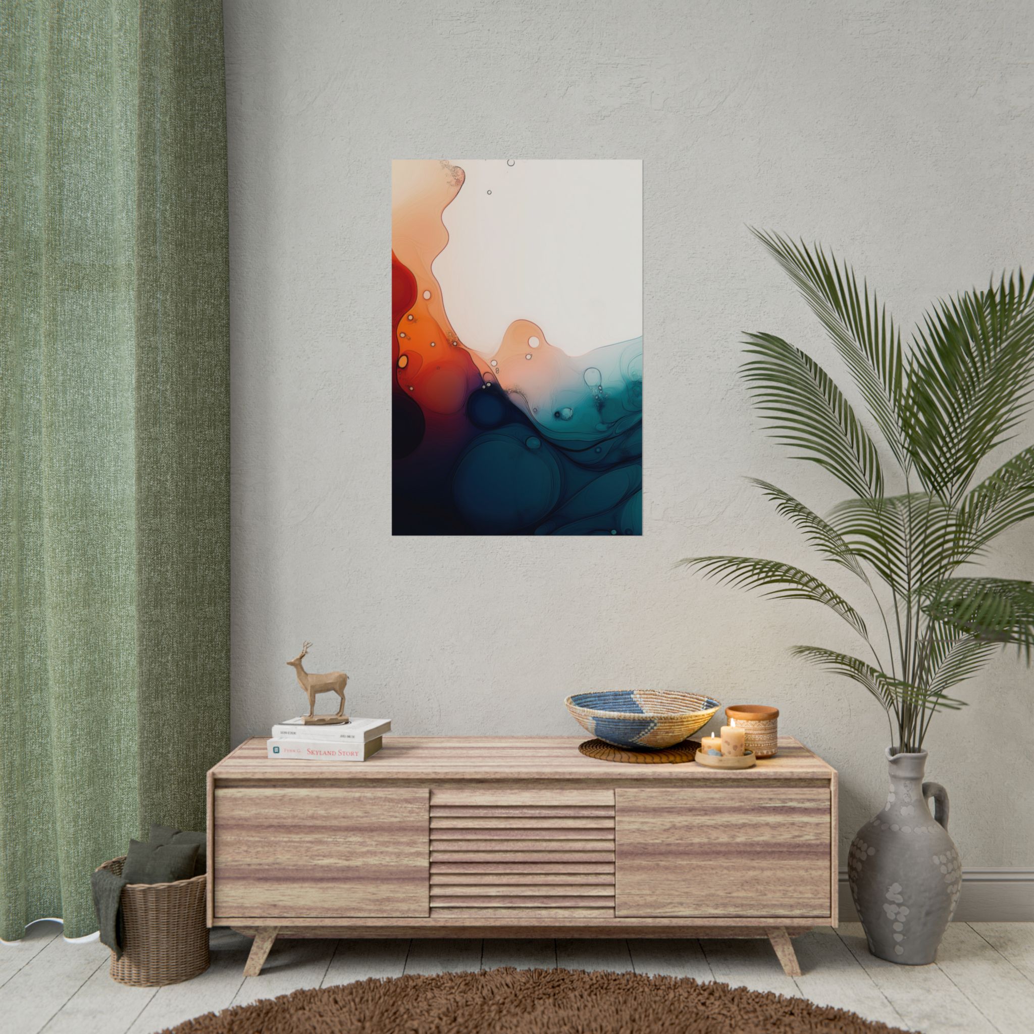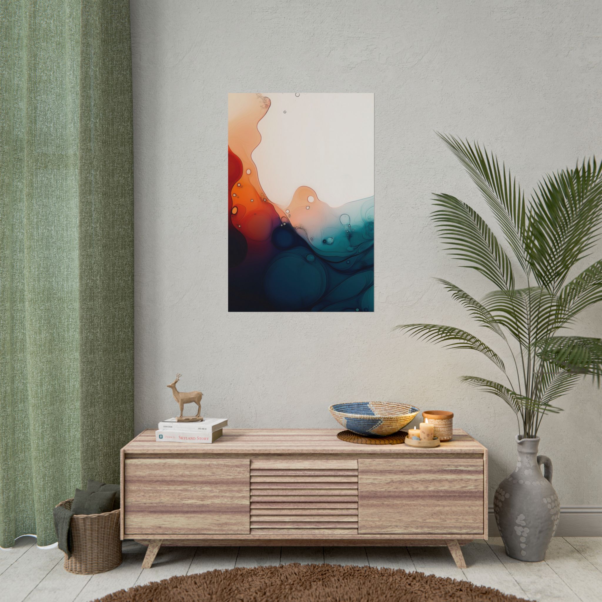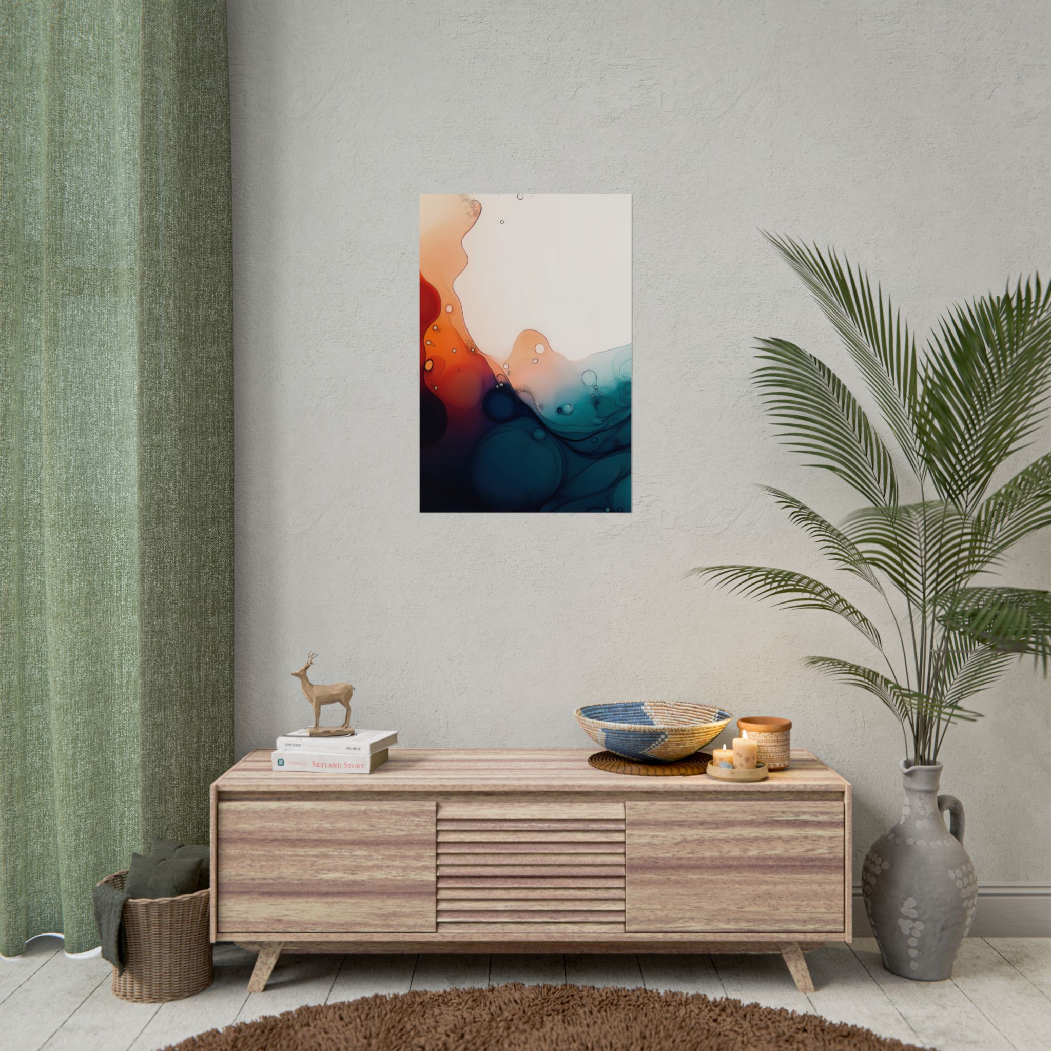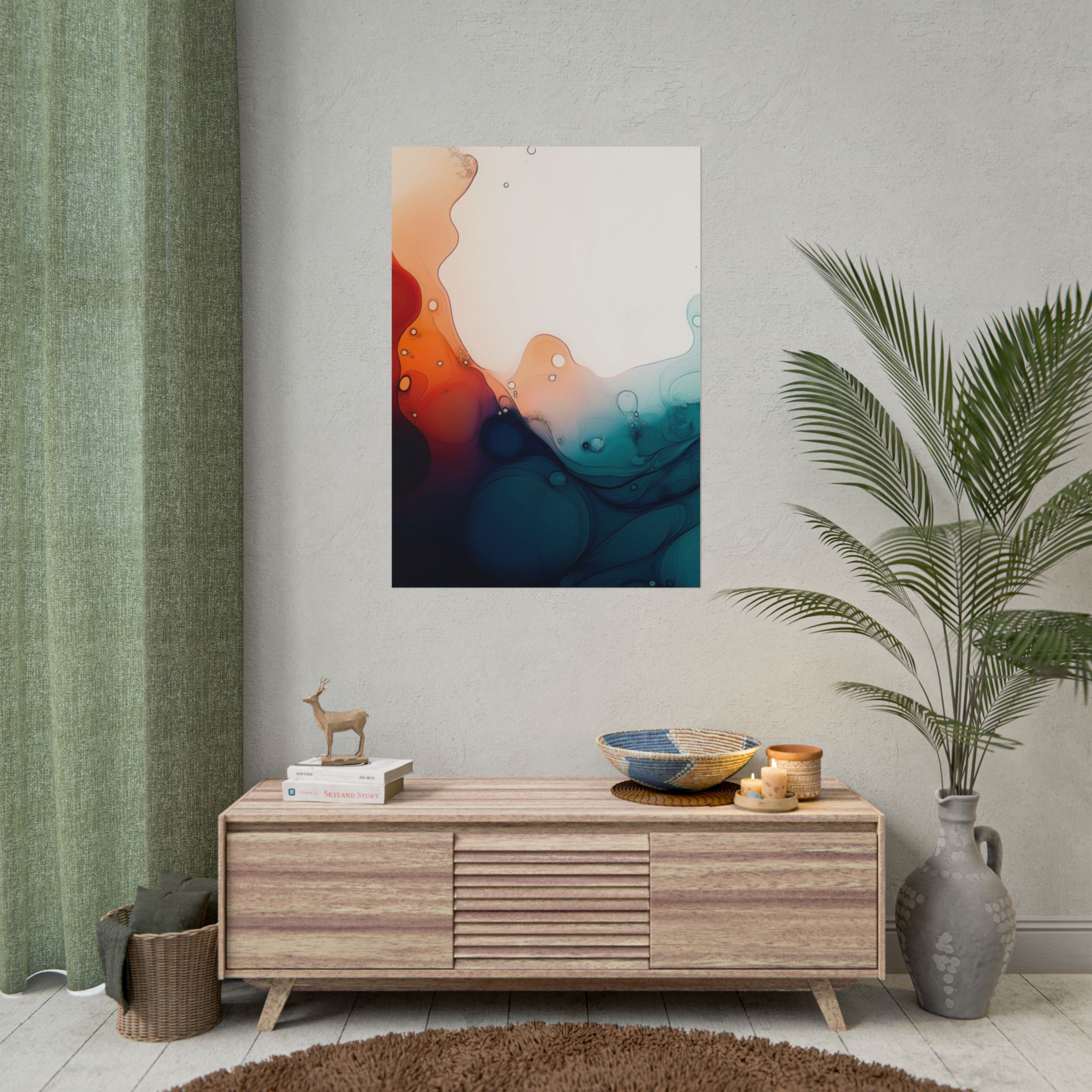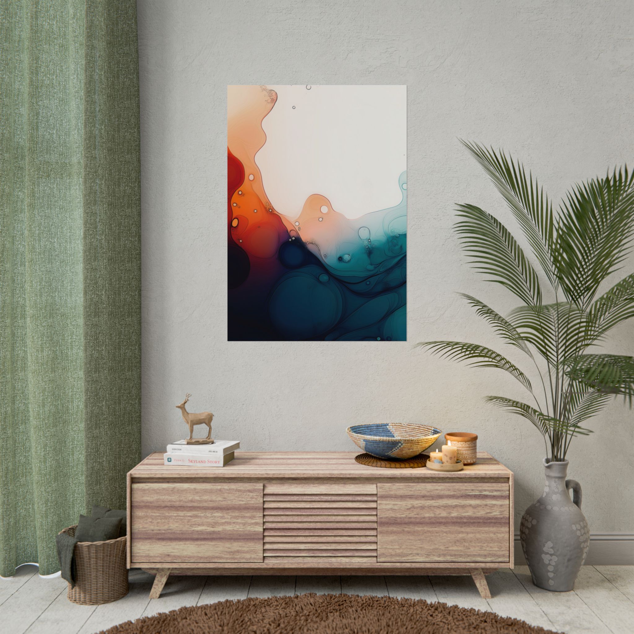 Bring a tranquil and ethereal vibe to your space with this vibrant fluid art print in teal and orange colors. Perfect for art lovers looking to add a unique touch to their home decor. Ideal for gift-giving during birthdays, housewarmings, or as a thoughtful gesture for art enthusiasts.