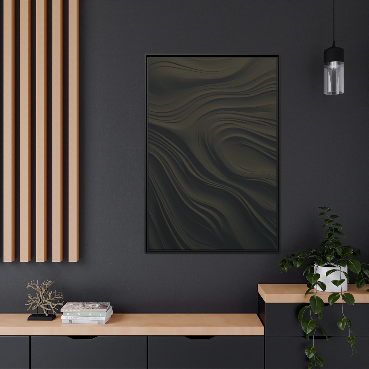 Custom digitally printed artwork on a quality canvas. .Every print in a black pinewood frame will look sleek and beautiful in any interior. The artwork will be printed on the cotton-polyester canvas with a special proprietary coating to make sure it stays vibrant for ages. Environmentally-conscious – it’s made from sustainably sourced materials (Forest Stewardship Council certified) and custom printed on demand no warehouse stocks and no waste. Choose between the designer specified sizes. The sawtooth hanging hardware is already attached.