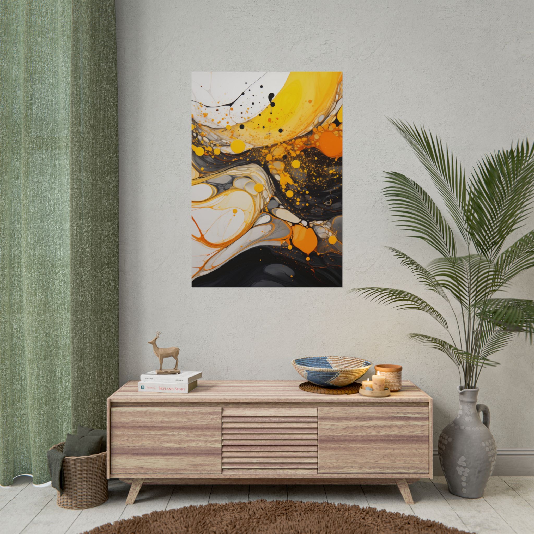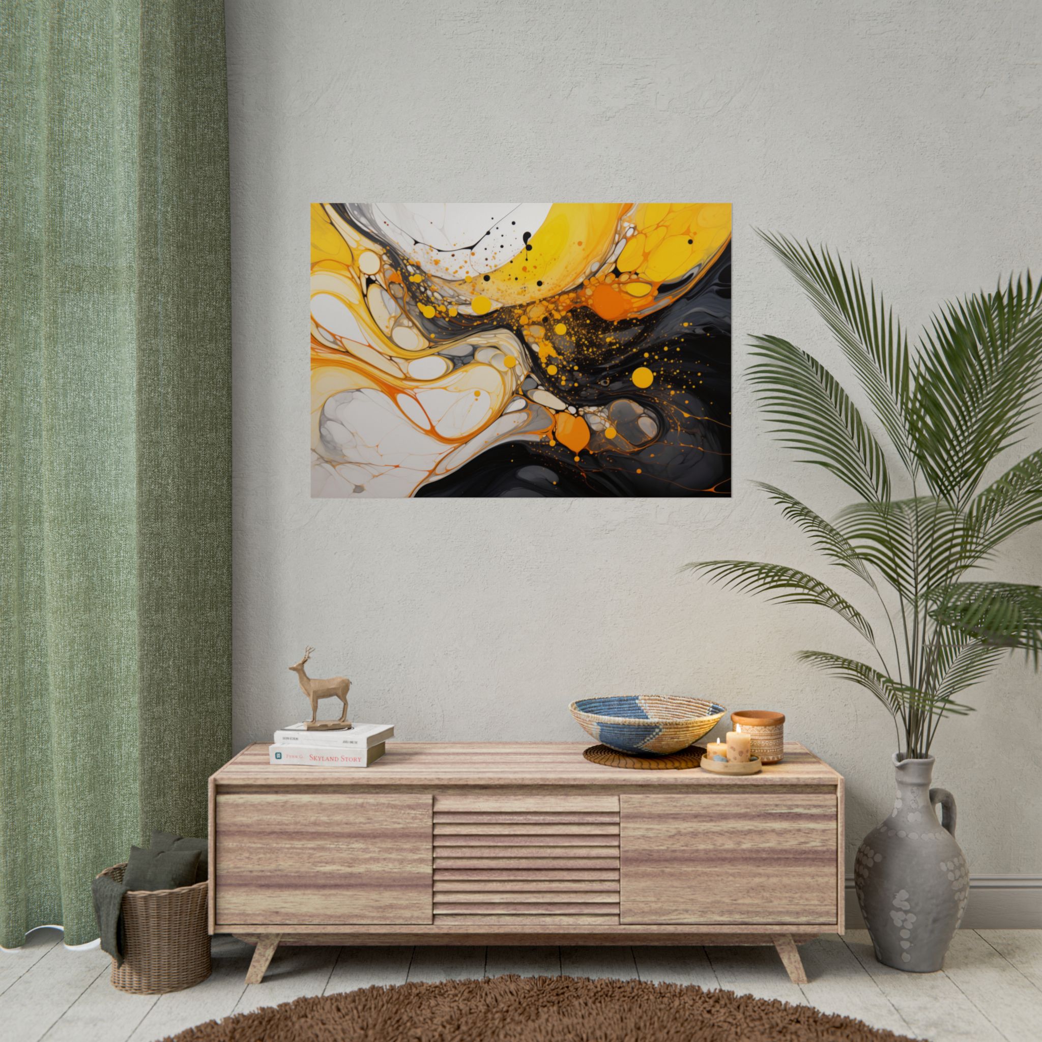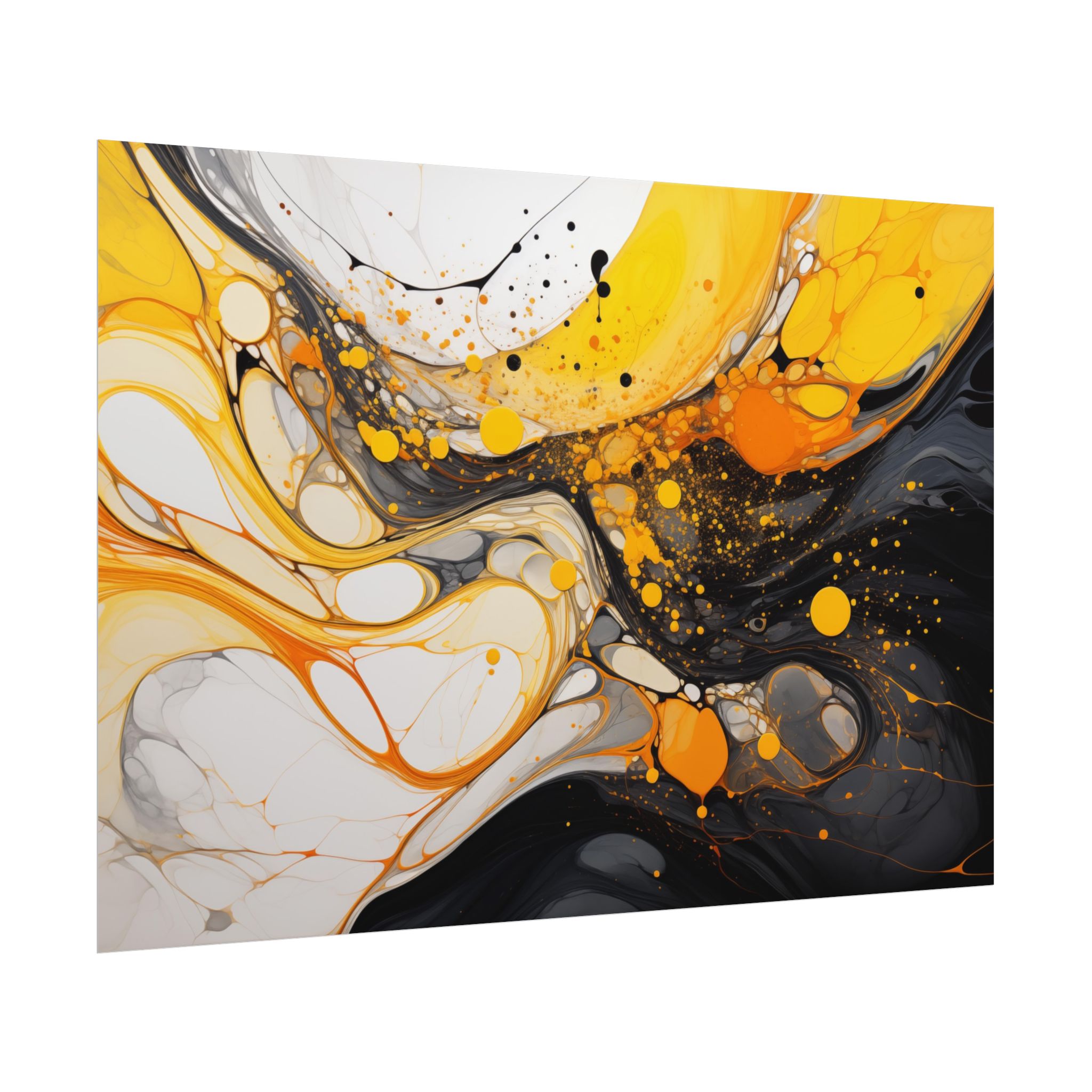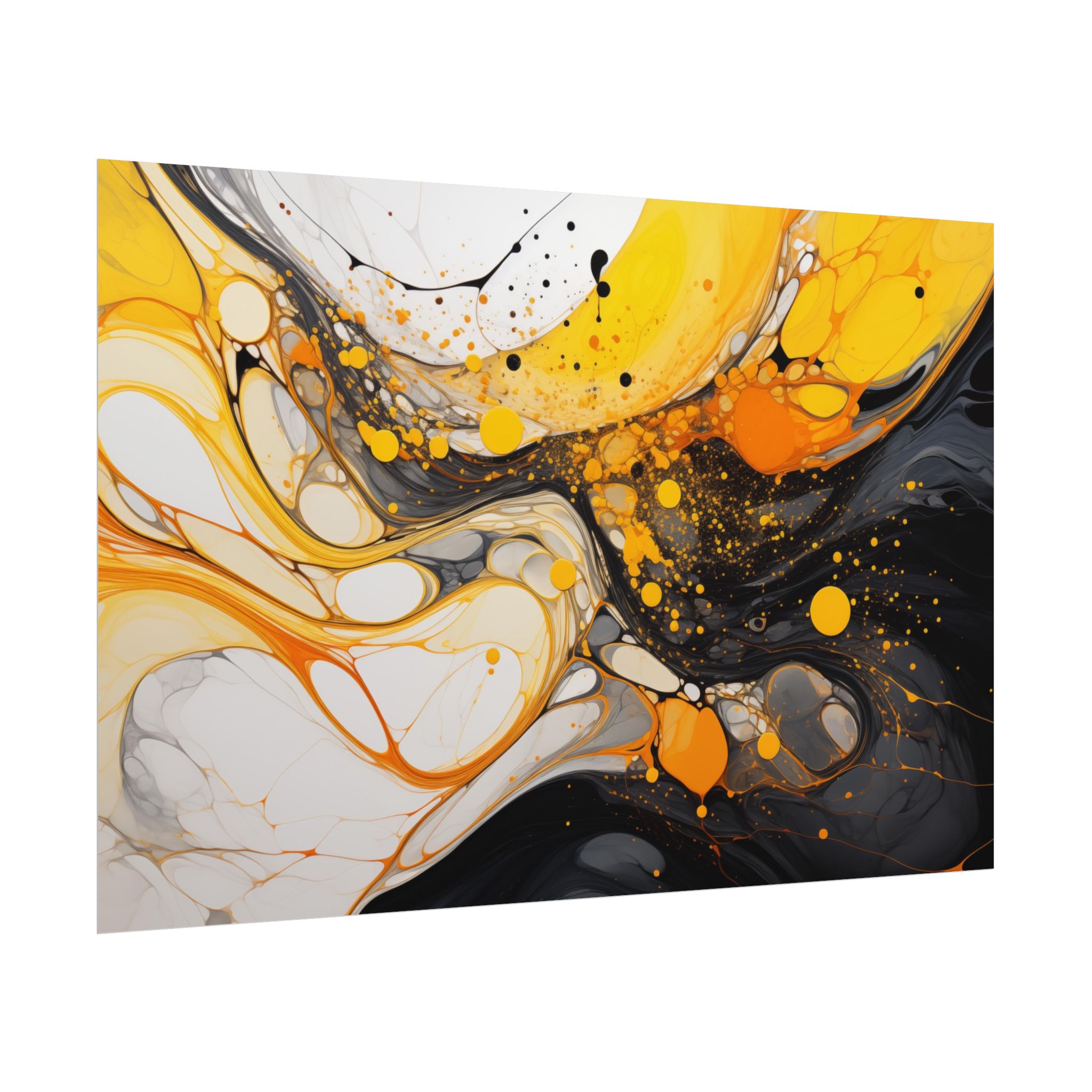Elevate your space with this black, white, and yellow abstract art print featuring flowing liquid shapes and splashes of color. The intricate patterns and textures give depth and dimension, perfect for adding an artistic touch to any room. Ideal for art enthusiasts and home decor lovers, this canvas is a great addition to celebrations like birthdays, housewarmings, or art appreciation events.