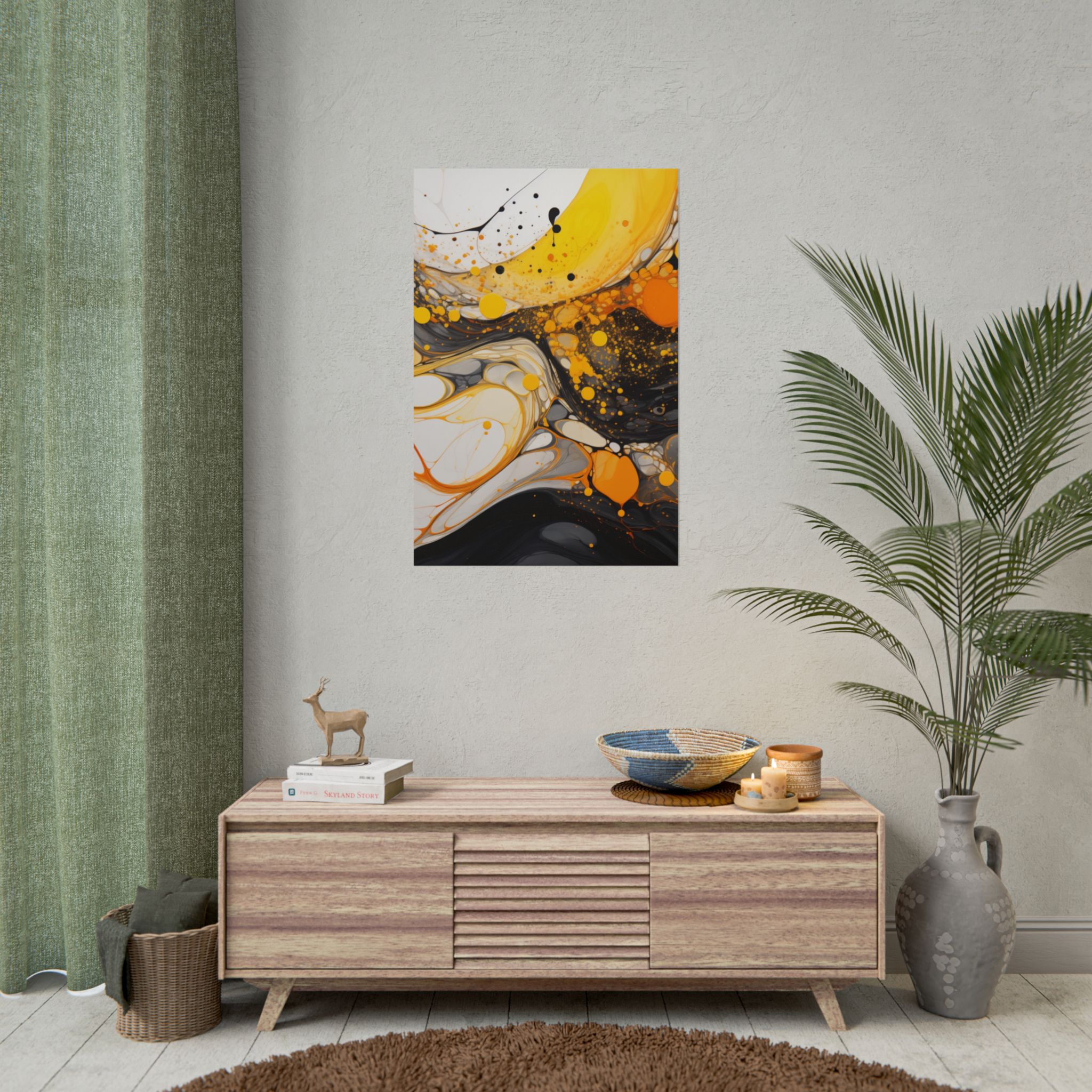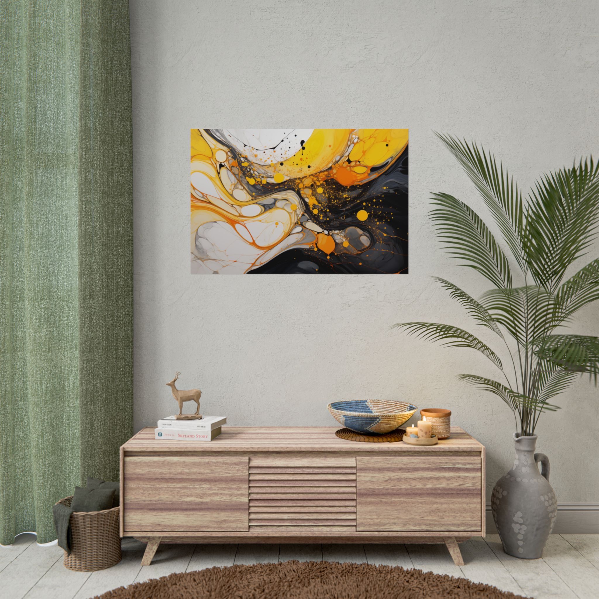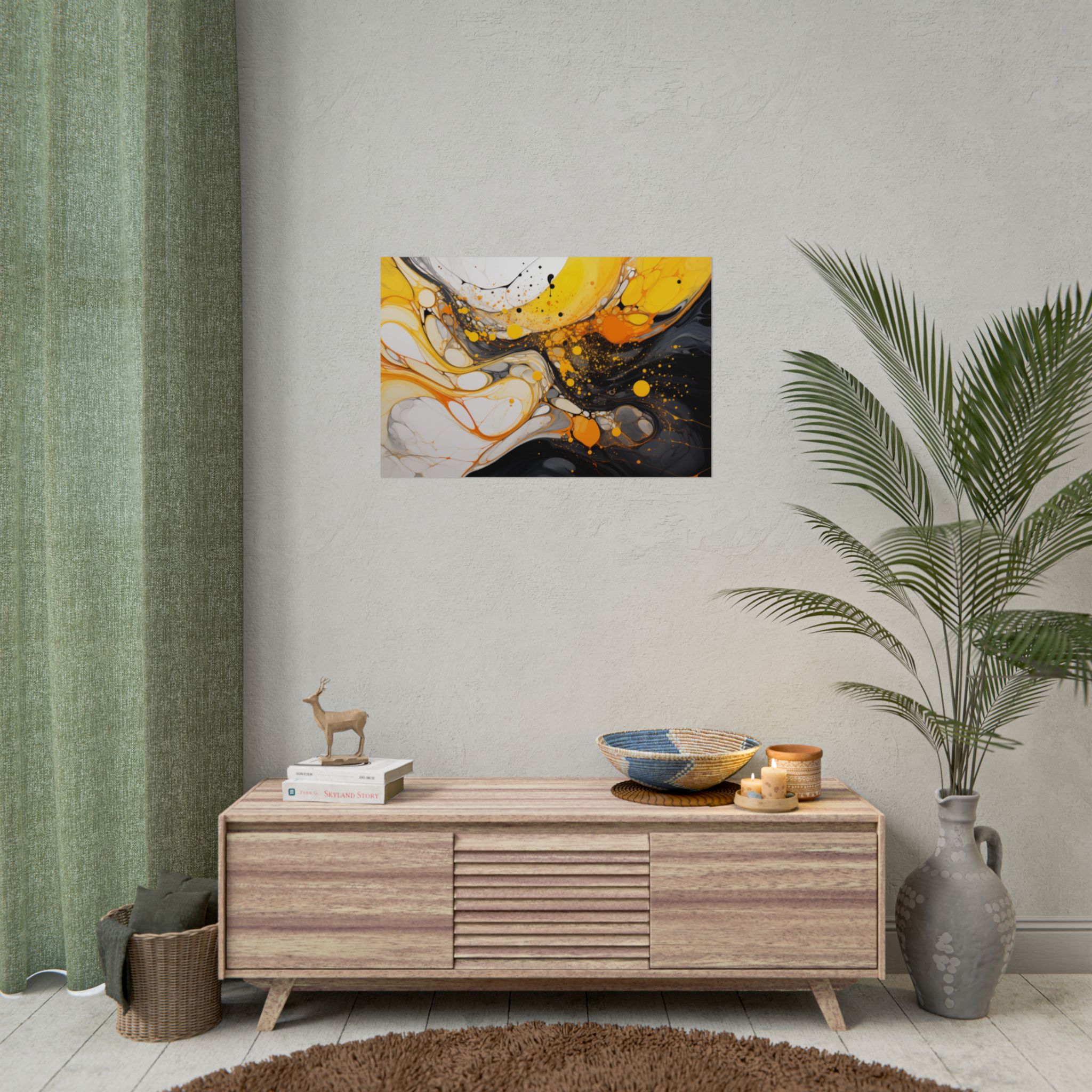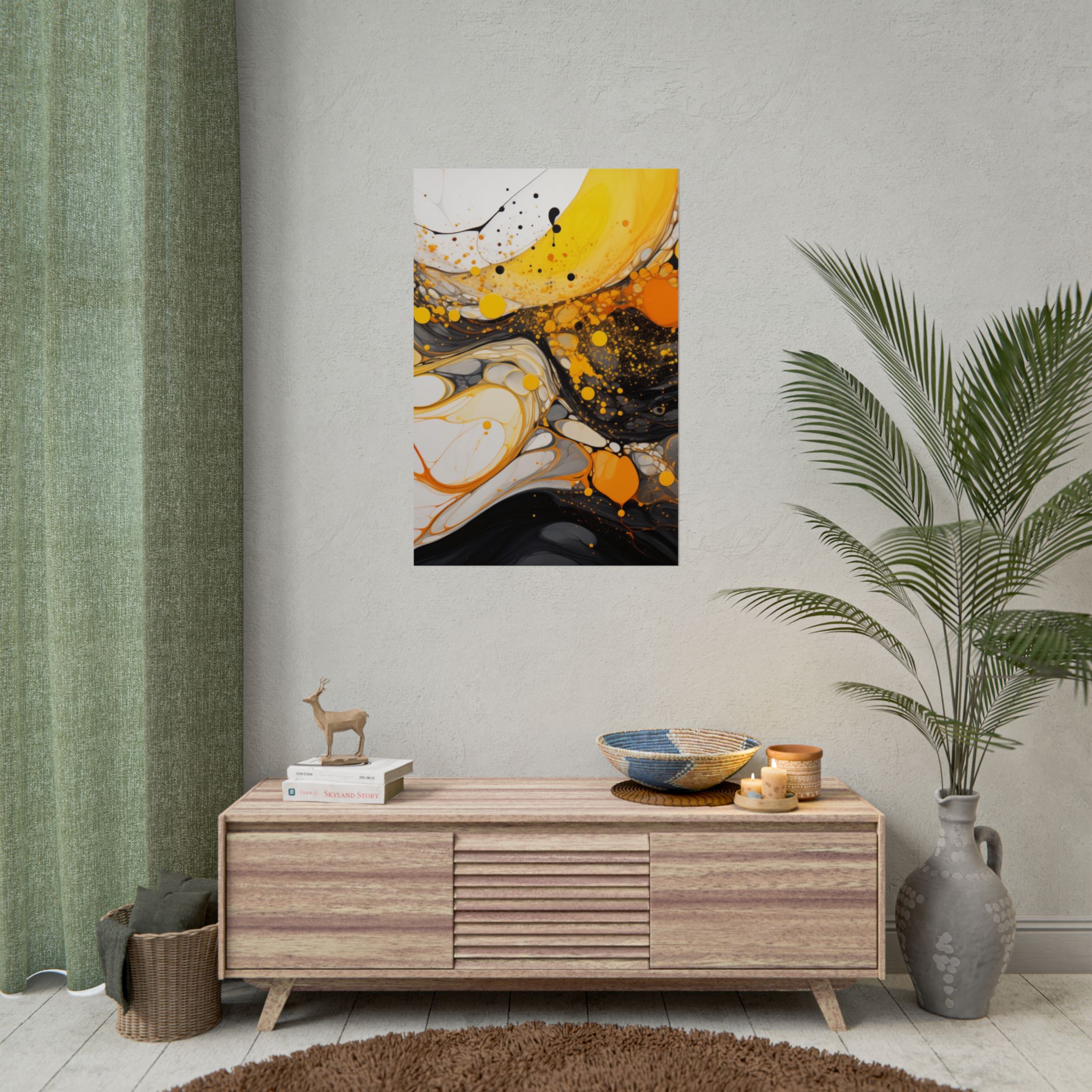 Elevate your space with this black, white, and yellow abstract art print featuring flowing liquid shapes and splashes of color. The intricate patterns and textures give depth and dimension, perfect for adding an artistic touch to any room. Ideal for art enthusiasts and home decor lovers, this canvas is a great addition to celebrations like birthdays, housewarmings, or art appreciation events.